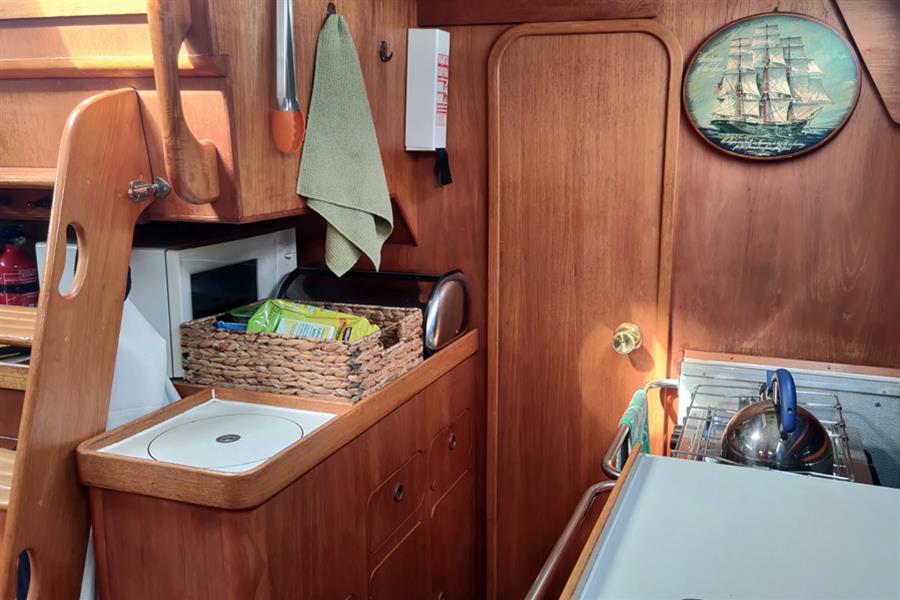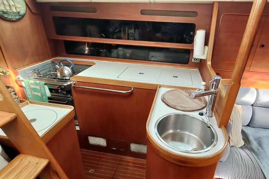 GALLEY: Located to port is a generous L-shaped galley, equipped with a Plastimo gimballed 2-burner gas cooker with oven and grill, top access fridge/freezer, and twin stainless steel sinks. Opposite is a further linear galley area with a microwave and built-in bin, these two areas combine to offer generous work surfaces and excellent stowage in various lockers and cupboards for food, crockery, pots, and pans. A passageway leads aft to the heads compartment which in turn offers secondary access to the aft cabin.