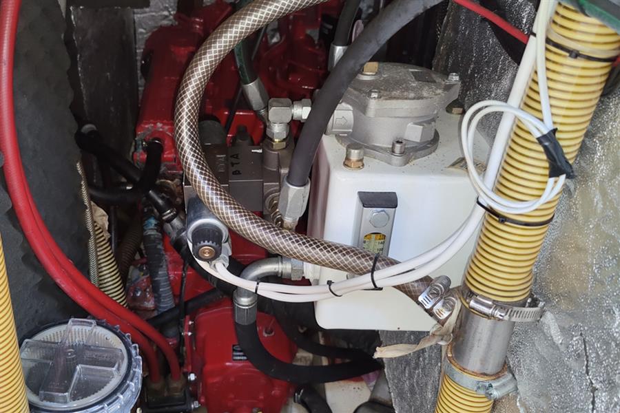 Located abaft companionway, Beta B60 HE, 58hp, four cylinder naturally aspirated marine diesel engine (new 2009). Freshwater cooled via heat exchanger. Single lever controls with electric start. Hydraulic pump for powering bow thruster and anchor windlass. Whitlock wheel steering. Plastic 250L fuel tank. Fuel tank filler and breather pipes replaced 2024. Shaft drive to Brunton Autoprop three blade feathering propeller (propeller serviced 2024). Engine serviced June 2024 including new cutless bearing and new heat exchanger.