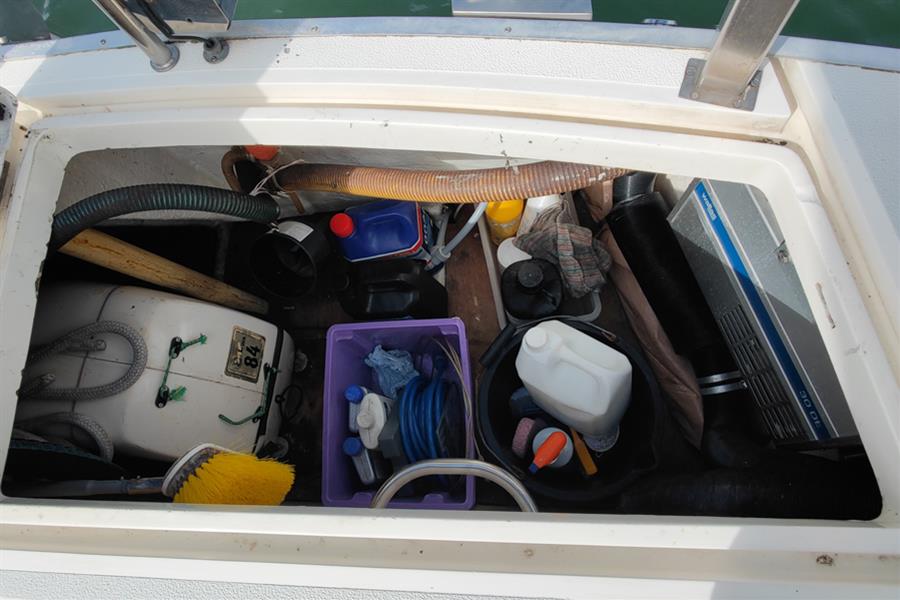 FORECABIN: Fitted with two large single berths which convert to a double V-berth, excellent storage provided by a large hanging locker, shelved stowage locker, beneath-berth stowage, and eye-level lockers, an opening hatch to the foredeck, and en suite access to the forward heads.