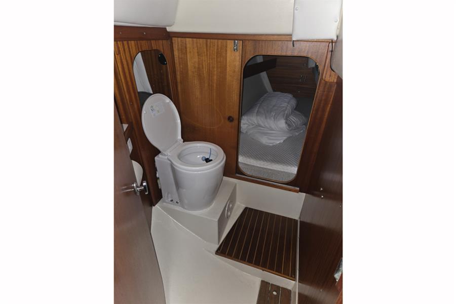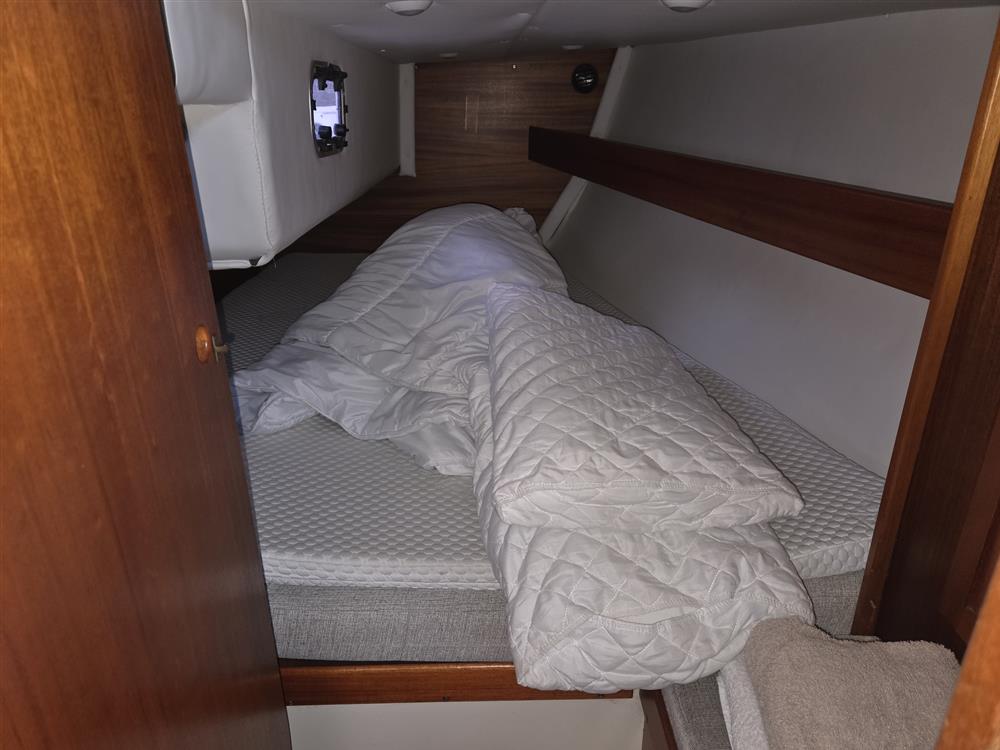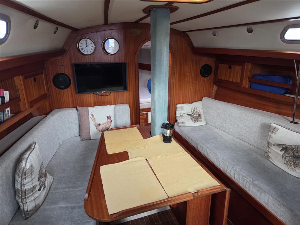 The accommodation offers up to seven berths in three cabins. Double berth forward with mattress topper, stowage under & hanging locker. Cello flat screen TV mounted at forward end of cabin. C-shaped saloon seating to port with settee berth to starboard. Saloon table with two drop leaves. 240v RCA flat screen TV mounted on bulkhead. Outboard facing chart table with swivel seat. Navigation instruments and 12v switch panel. Galley aft to port with Corian work surface. Galley sink with pressurised hot and cold water supply. Electric stove with grill. Fridge. Electric marine toilet in separate compartment aft to starboard. Wash basin with pressurised cold water supply. Single berth in cabin aft of heads with mattress topper, accessed through the heads compartment. Aft cabin to port. Double berth with mattress topper. Teak and holly strip floorboards. Eberspacher diesel-fired central heating. Stereo radio with speakers.