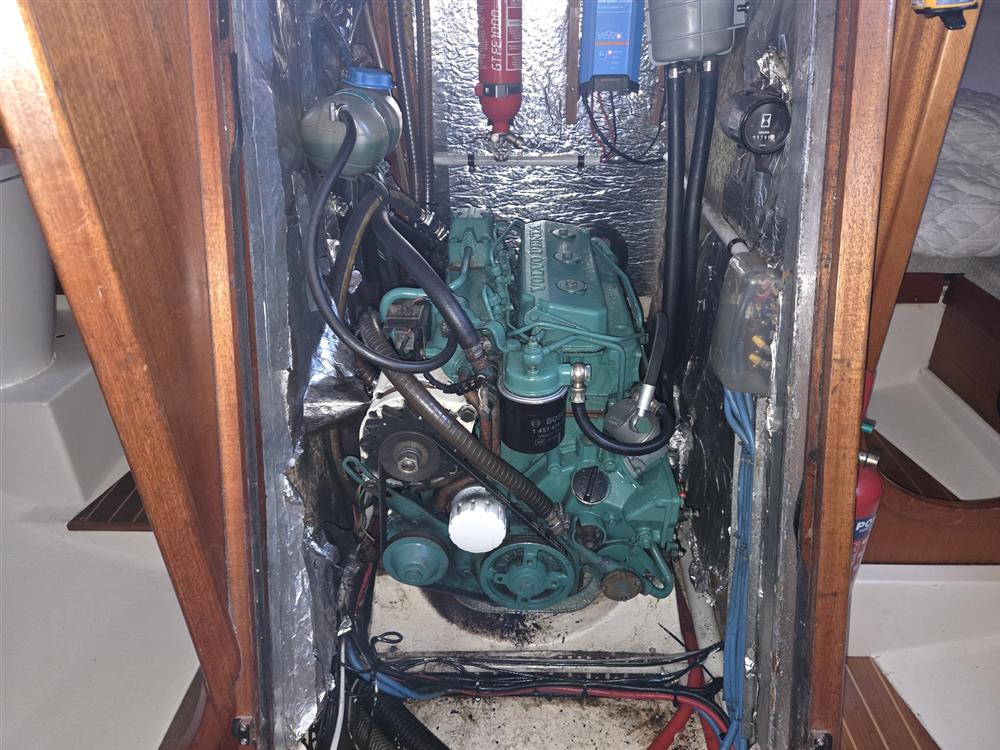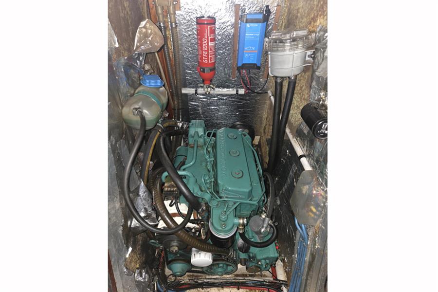 Volvo Penta 2003, three cylinder, 27hp marine diesel engine (fitted 2003). Volvo DS130 saildrive leg (new diaphragm fitted 2021) to folding propeller. Sea water cooled. Single lever Morse controls. 80 gallon fuel capacity. Cruising speed under engine 6 knots, max. speed 8 knots.