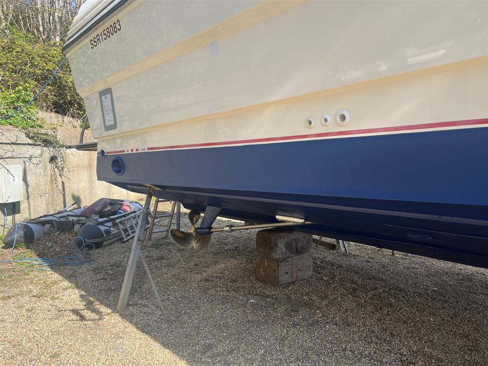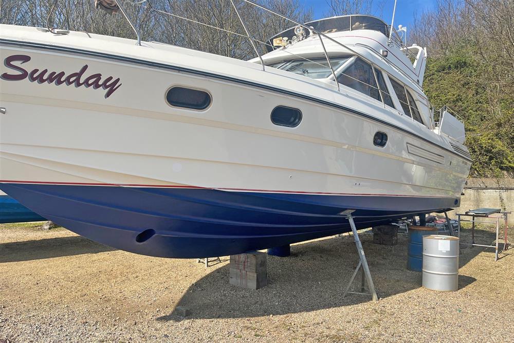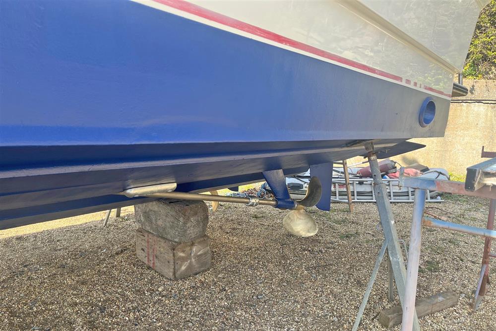 Built by Princess Yachts (Marine Projects Ltd) in circa. 1990 to a Bernard Olesinski design. White GRP hull, superstructure and decks with moulded non-slip finish. Teak laid deck to the aft deck. Deep-V semi-displacement hull. Last antifouled and anodes replaced Spring 2025. Two spade hung rudder. Wheel steering.
