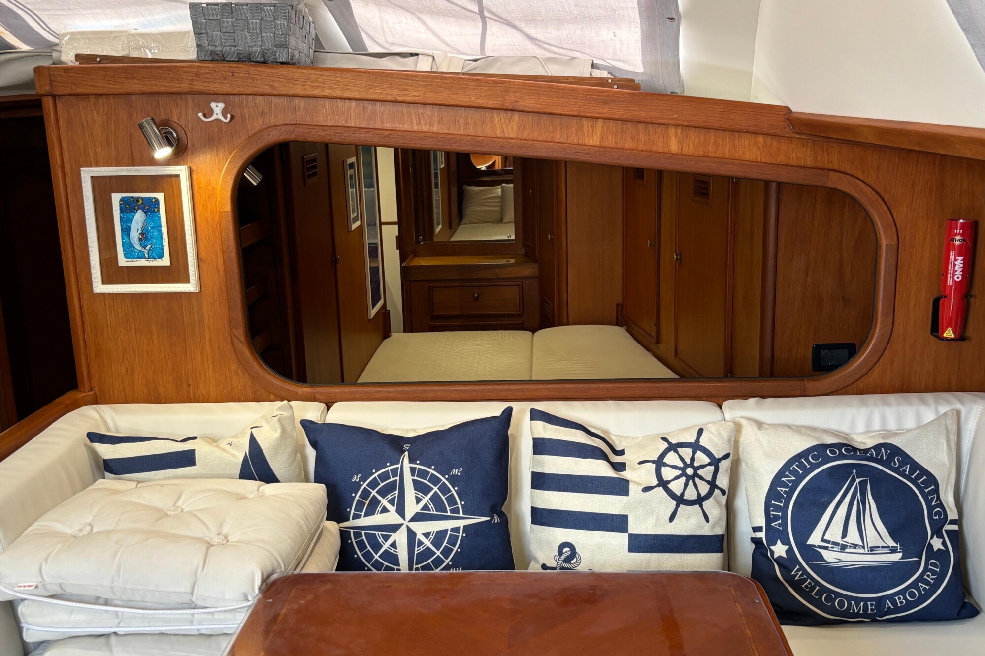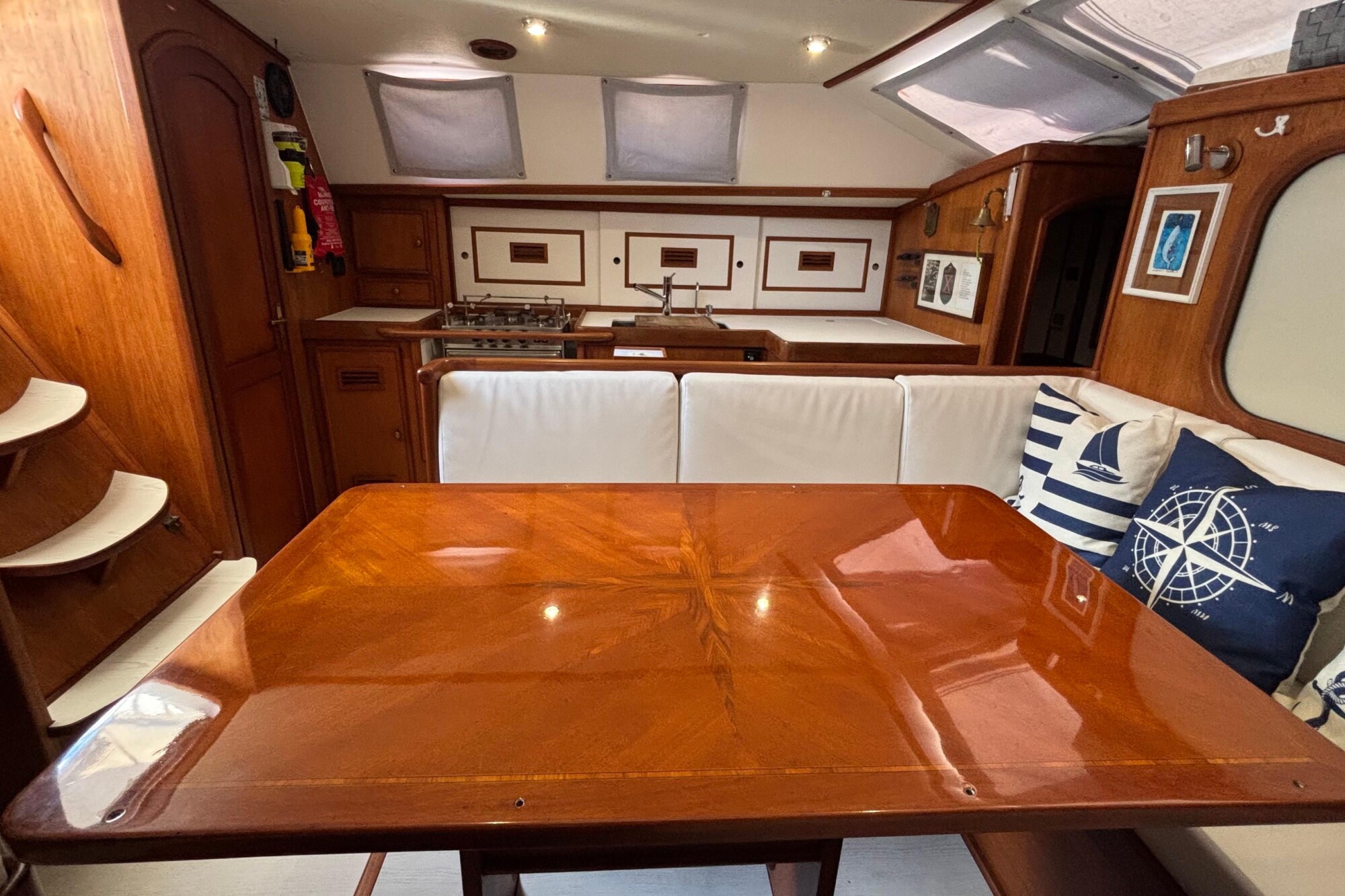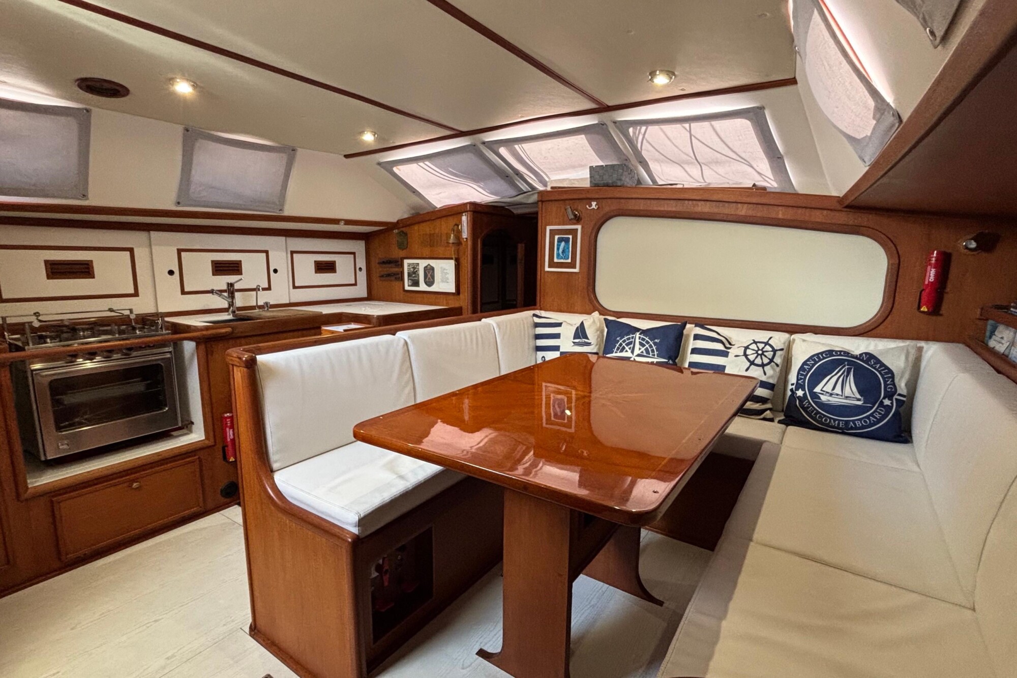 The saloon is the heart of the yacht, designed for comfort underway and at anchor. Outboard on the starboard side is the U shape settees with new cream leatherette upholstery and beautiful dining table, providing seating for the crew as well as additional sea berths when required. Storage lockers and bookshelves are integrated throughout.