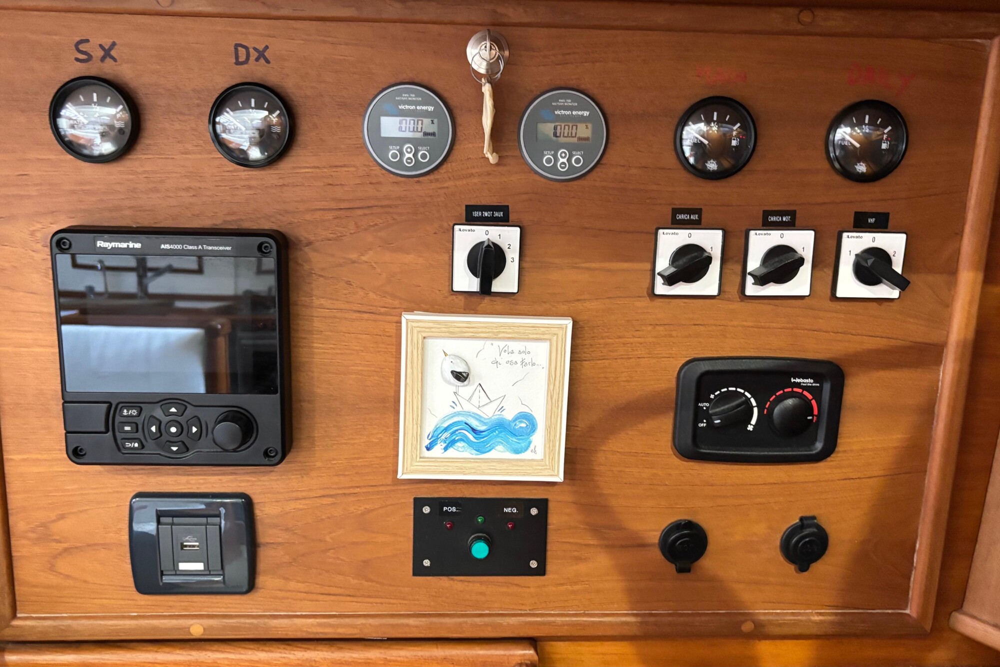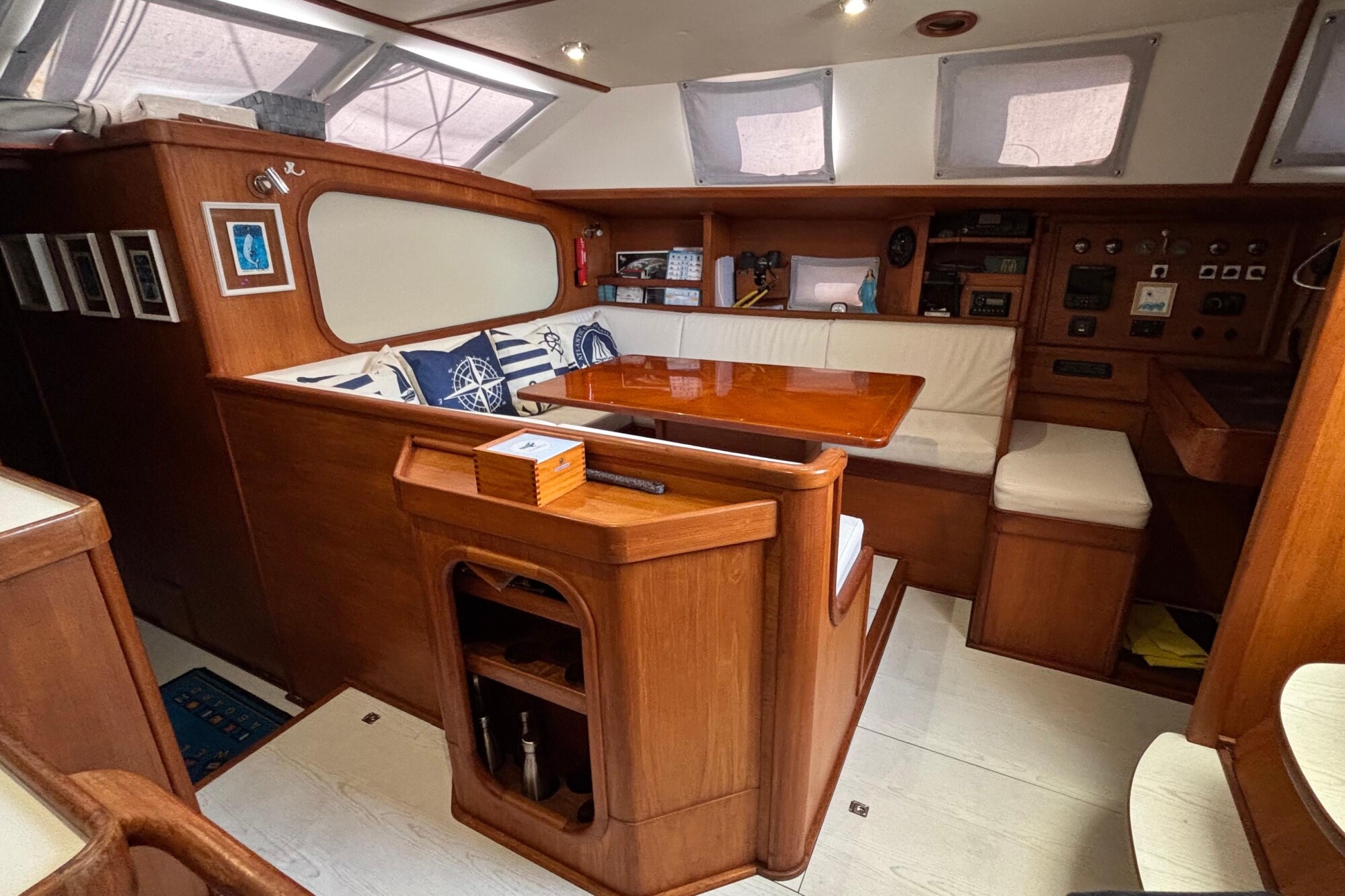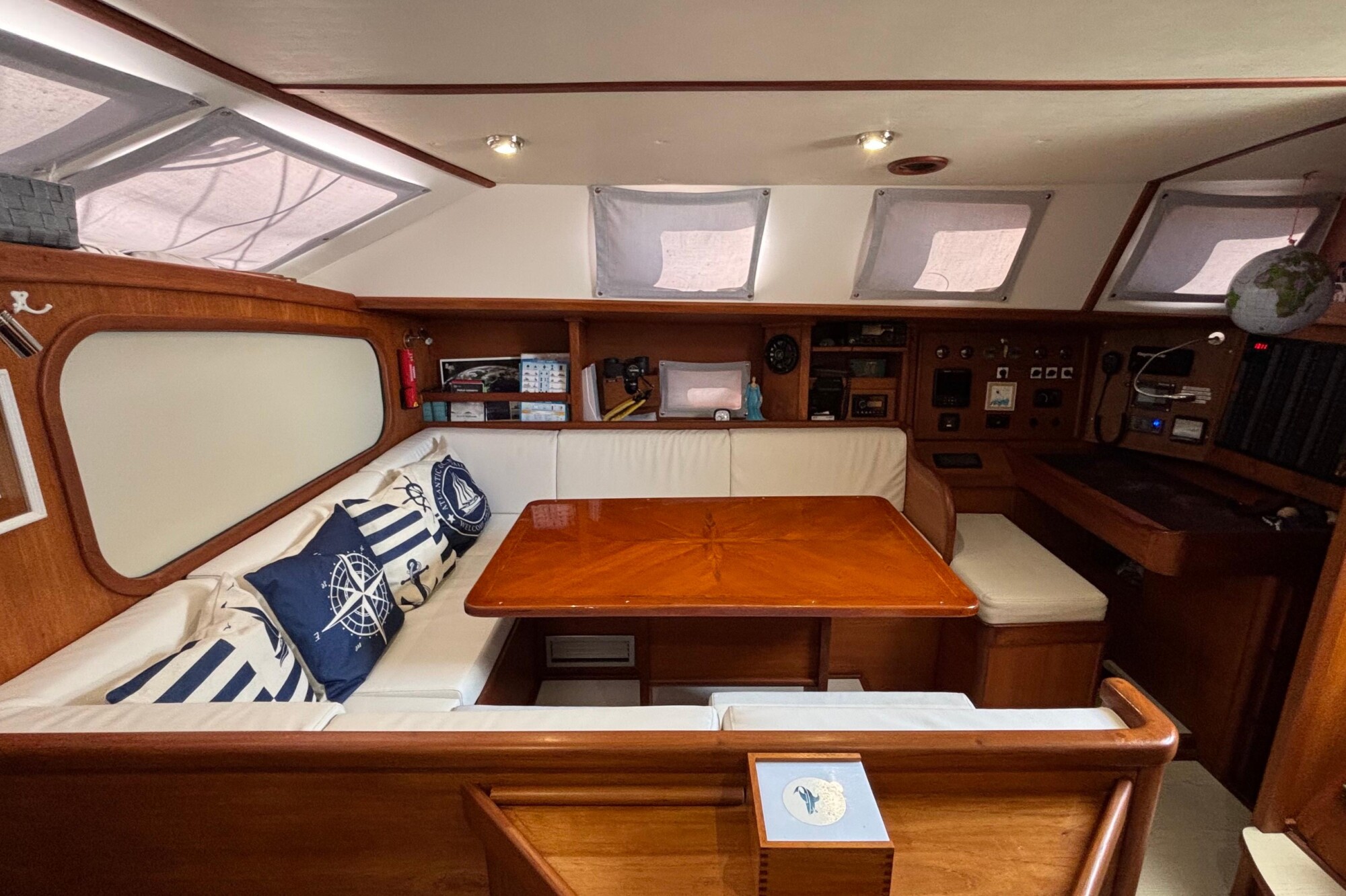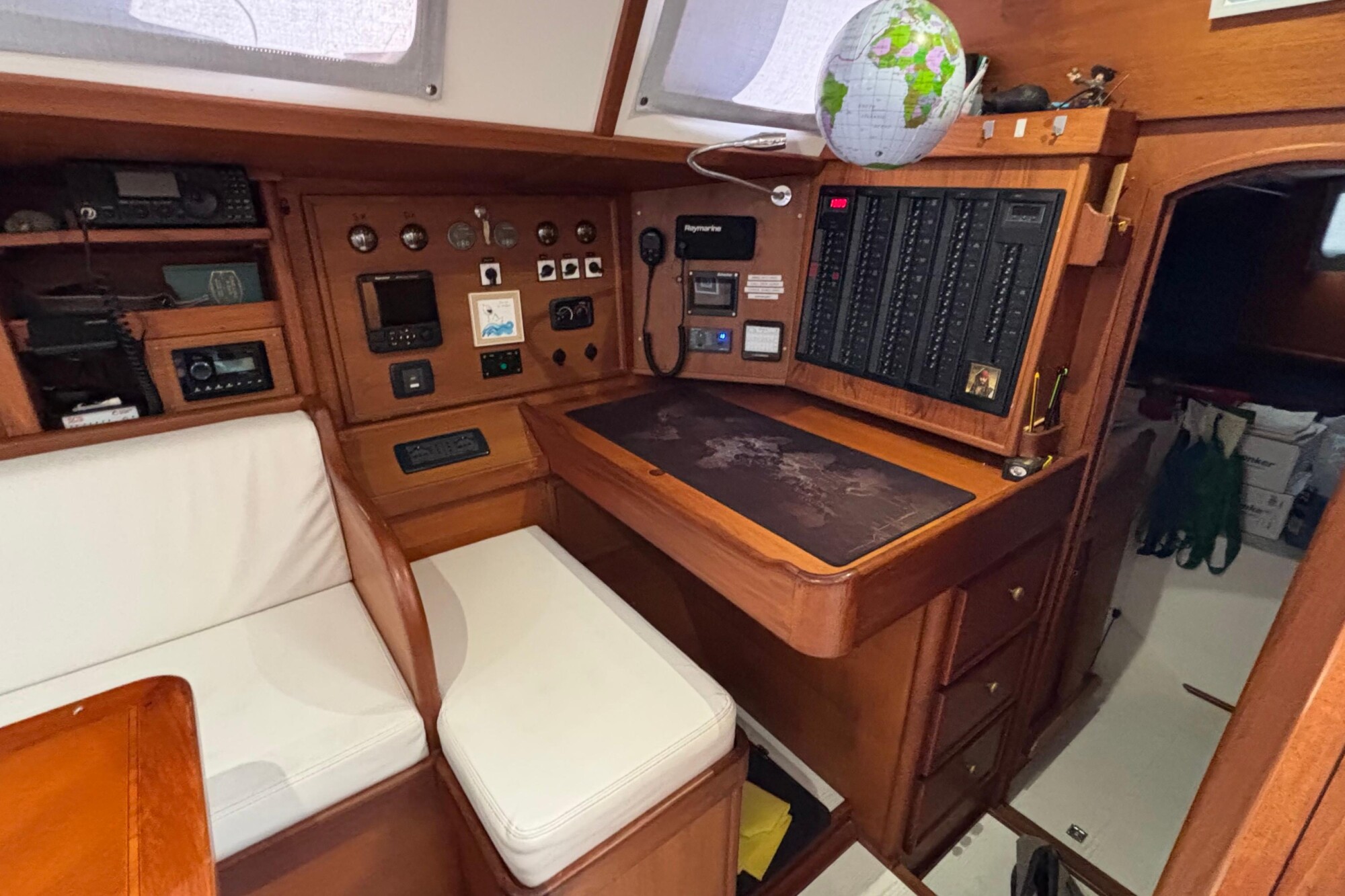 Located aft of the saloon to starboard, the aft facing navigation station offers a dedicated chart table, complete new switch board, instrumentation, and seating, allowing safe and efficient passage planning and monitoring during offshore passages.