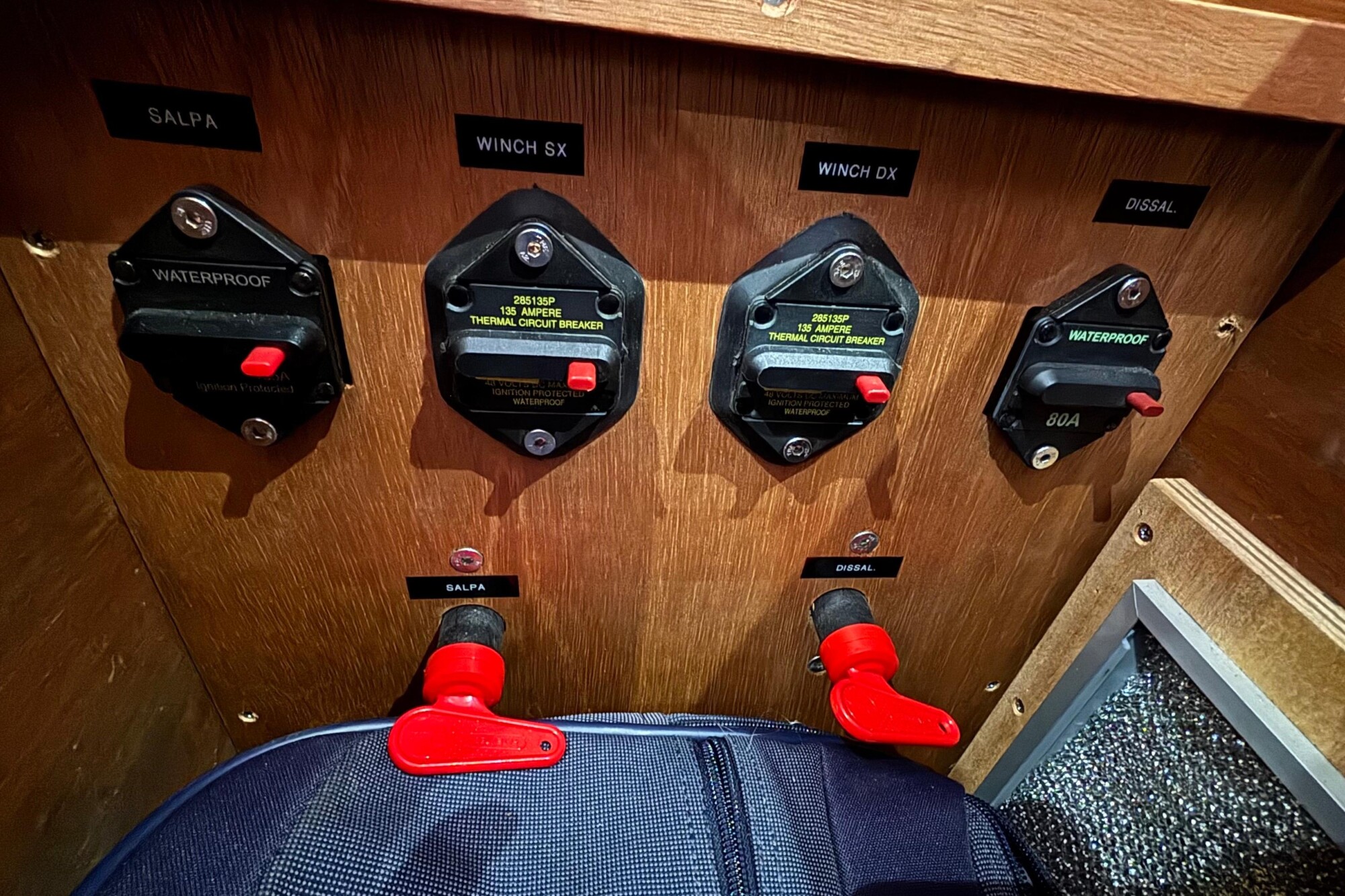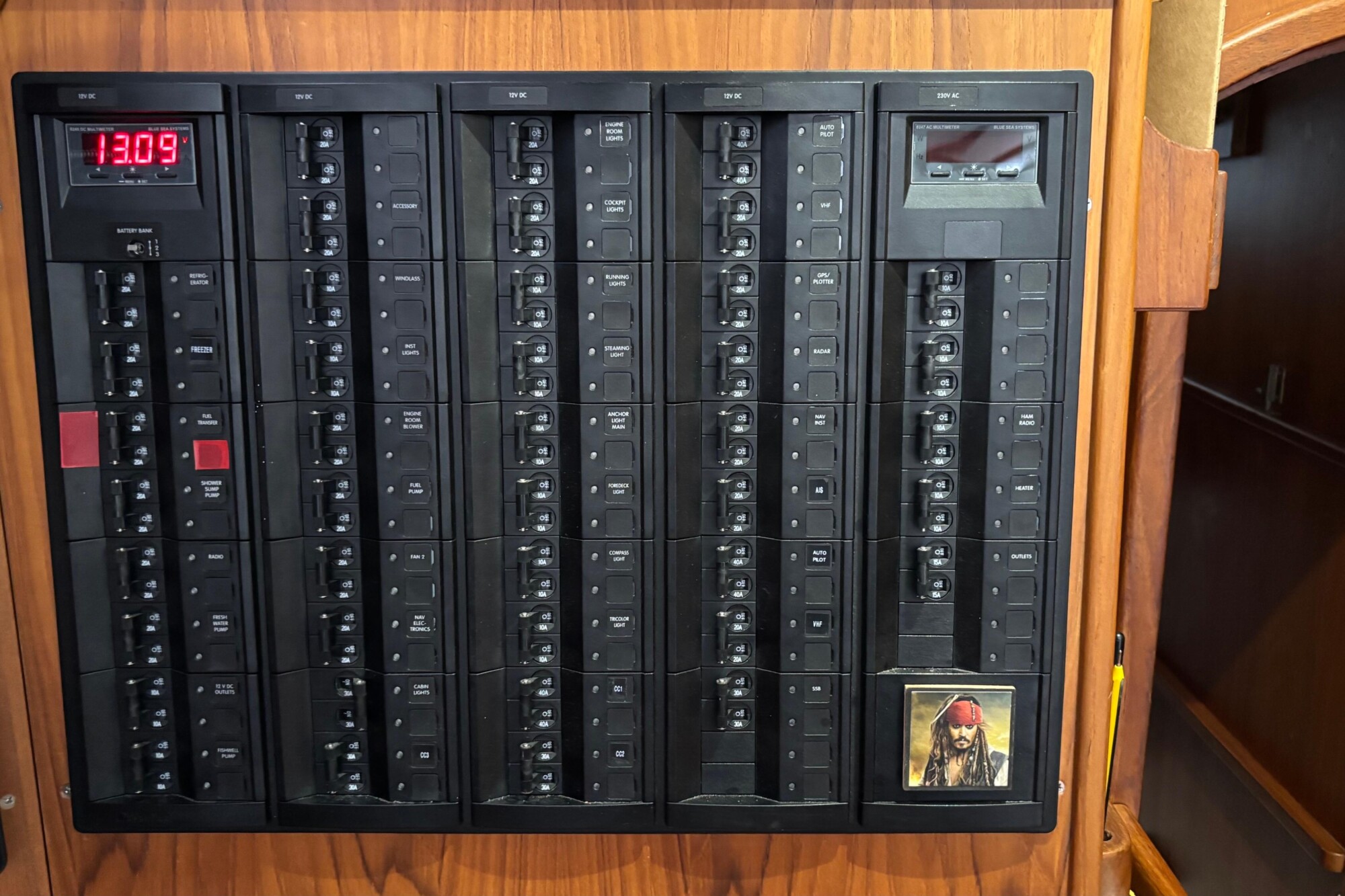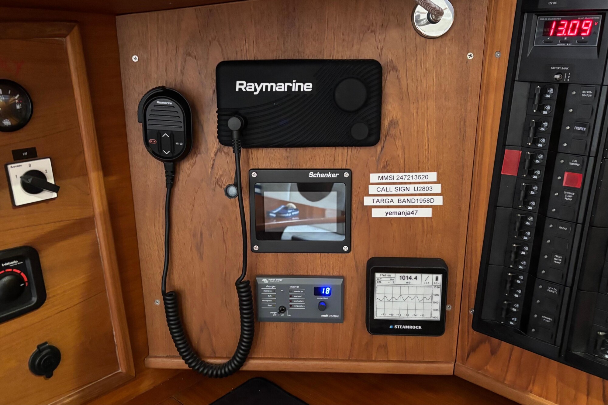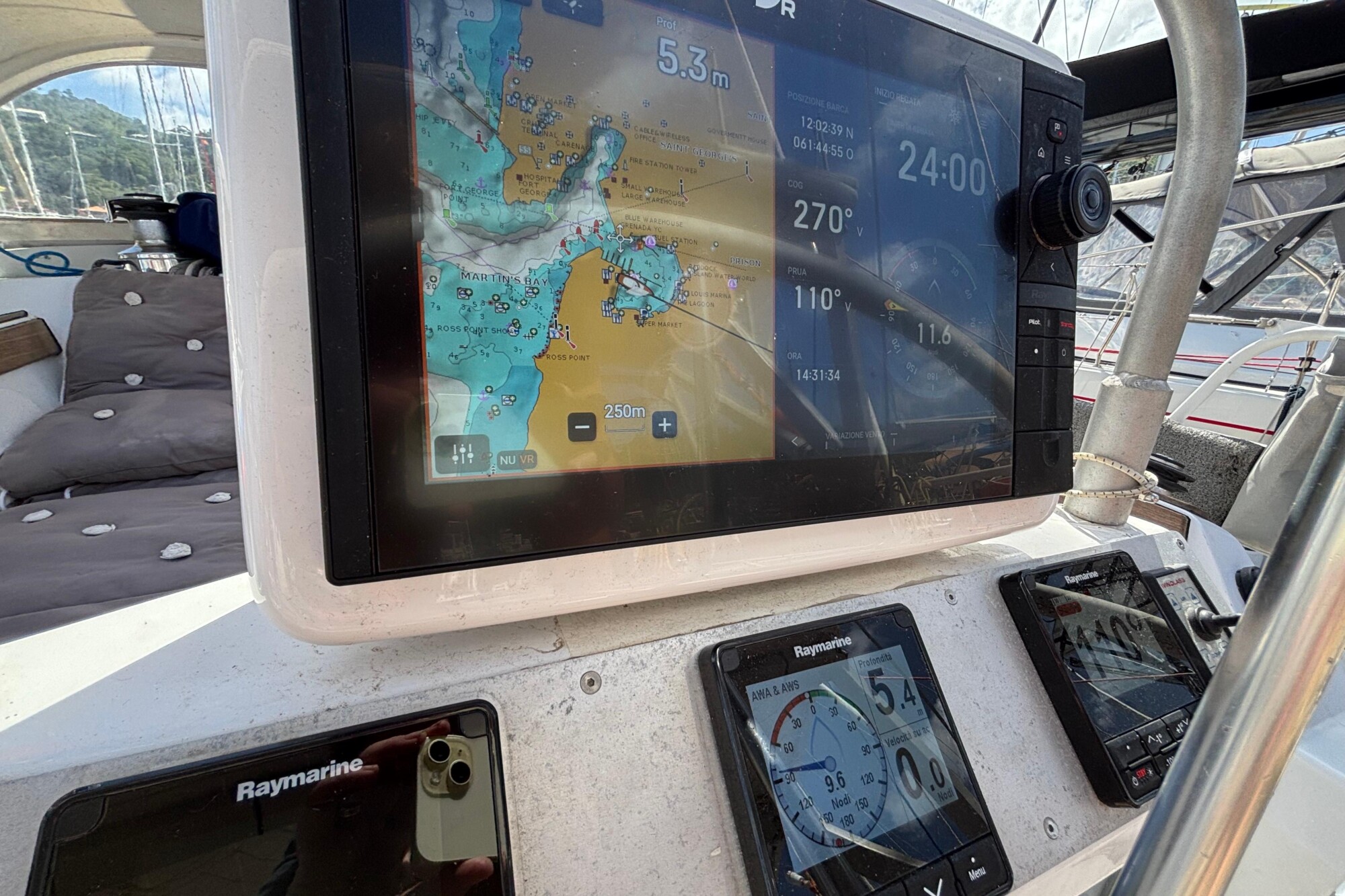 Located aft of the saloon to starboard, the aft facing navigation station offers a dedicated chart table, complete new switch board, instrumentation, and seating, allowing safe and efficient passage planning and monitoring during offshore passages.