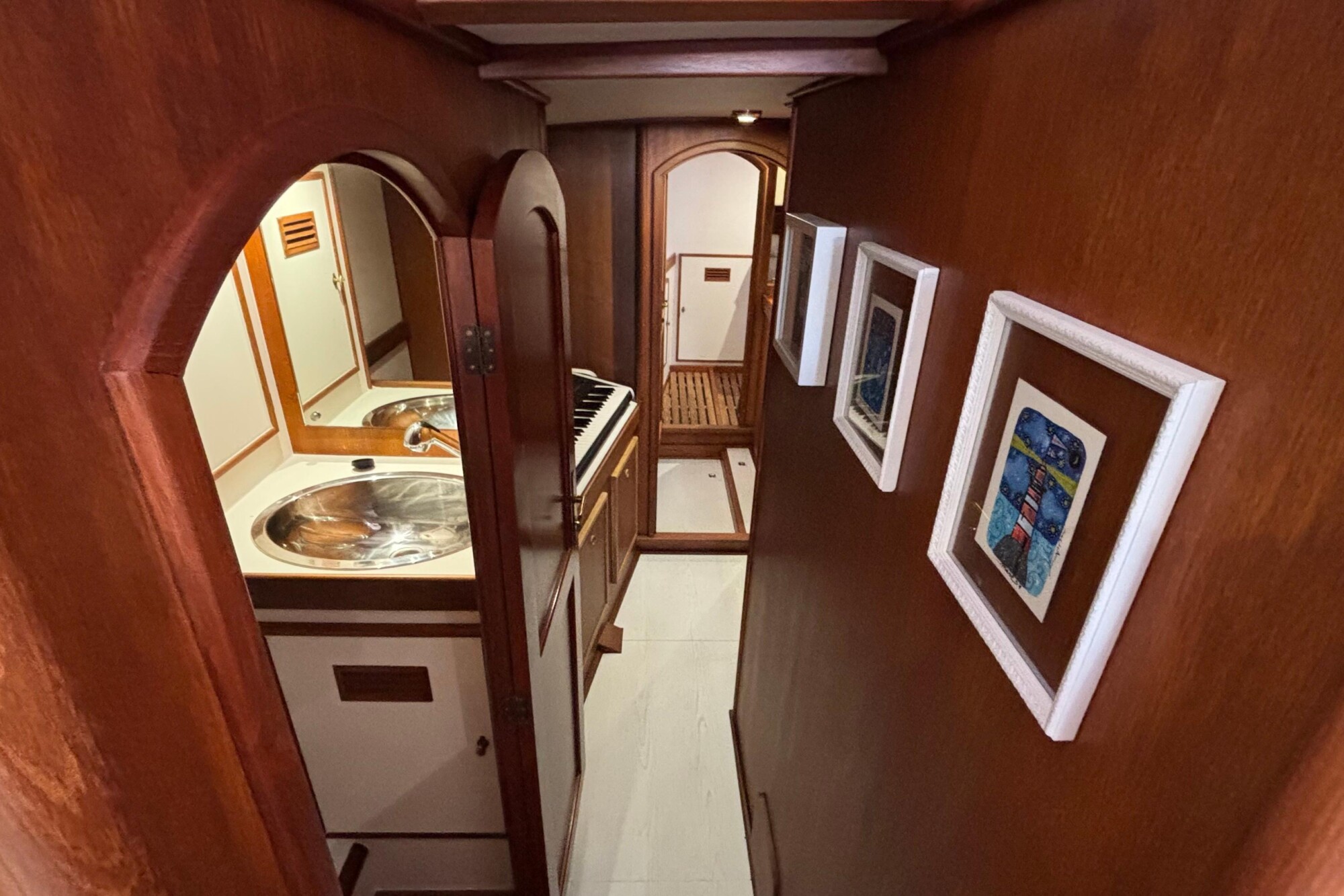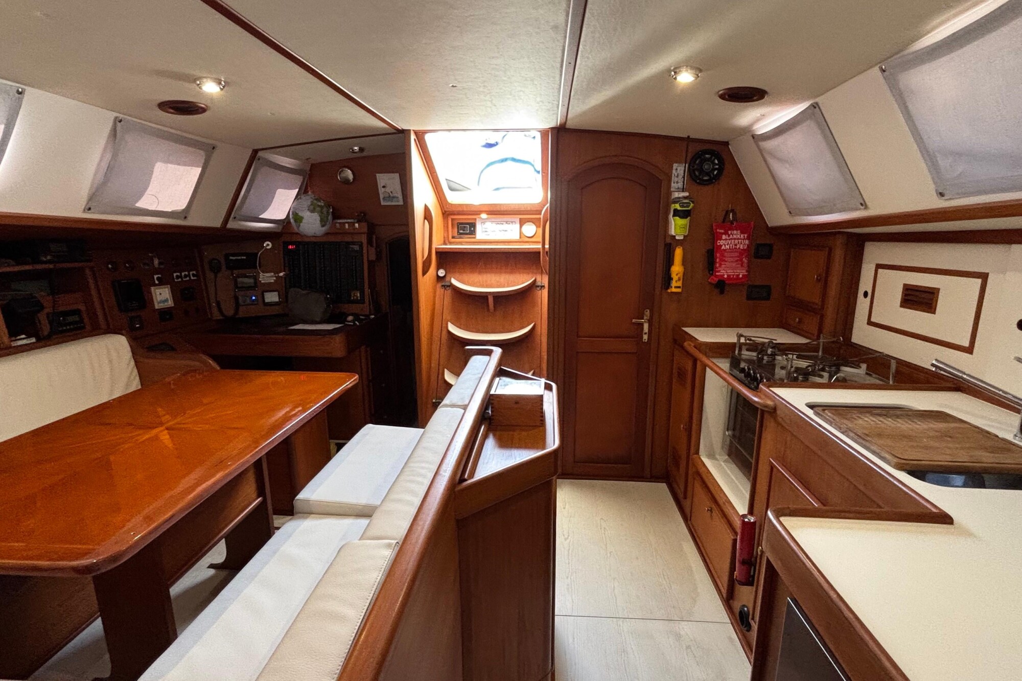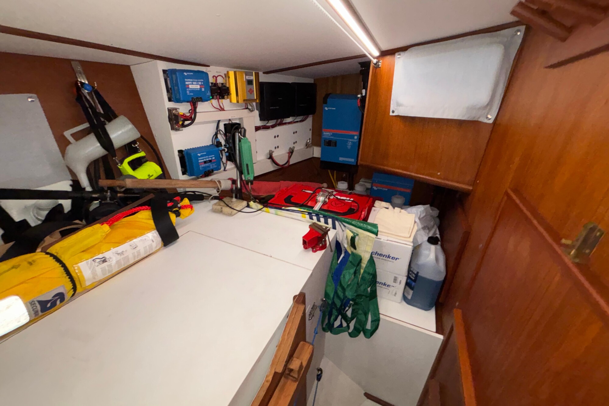 The galley is arranged for optimal use at sea, positioned near the center of the yacht for motion. With new s/s fridge, new freezer, new S/S sink and water pipes. It is well equipped with work surface and storage lockers allowing for comfortable meal preparation on long passages.