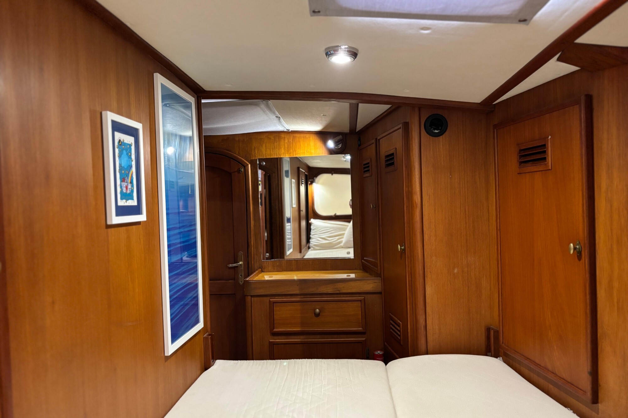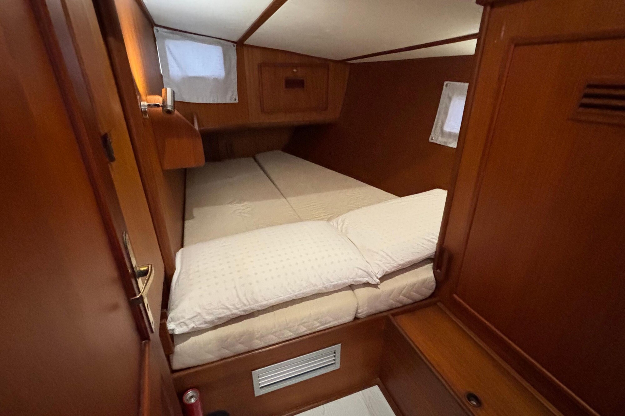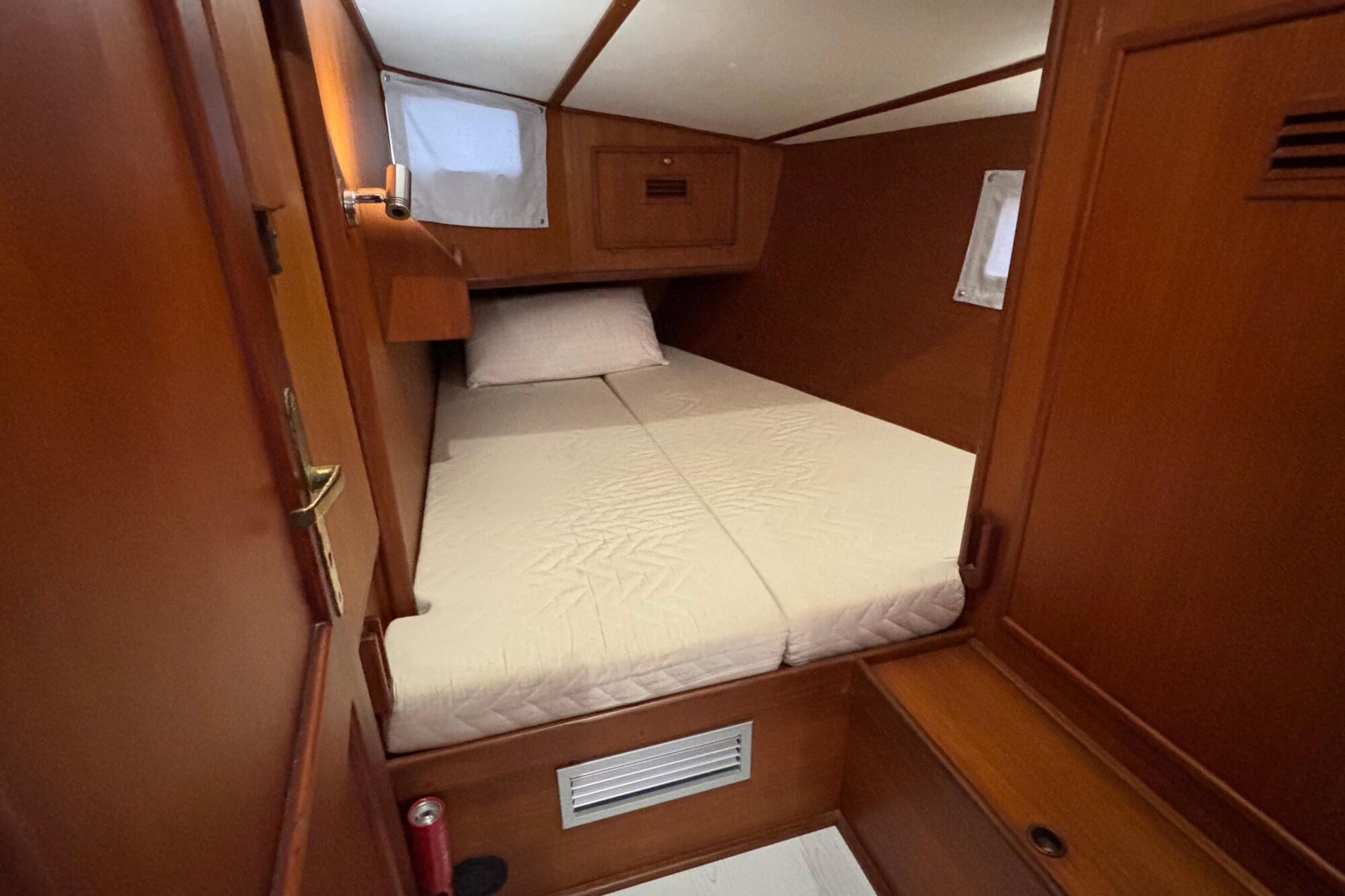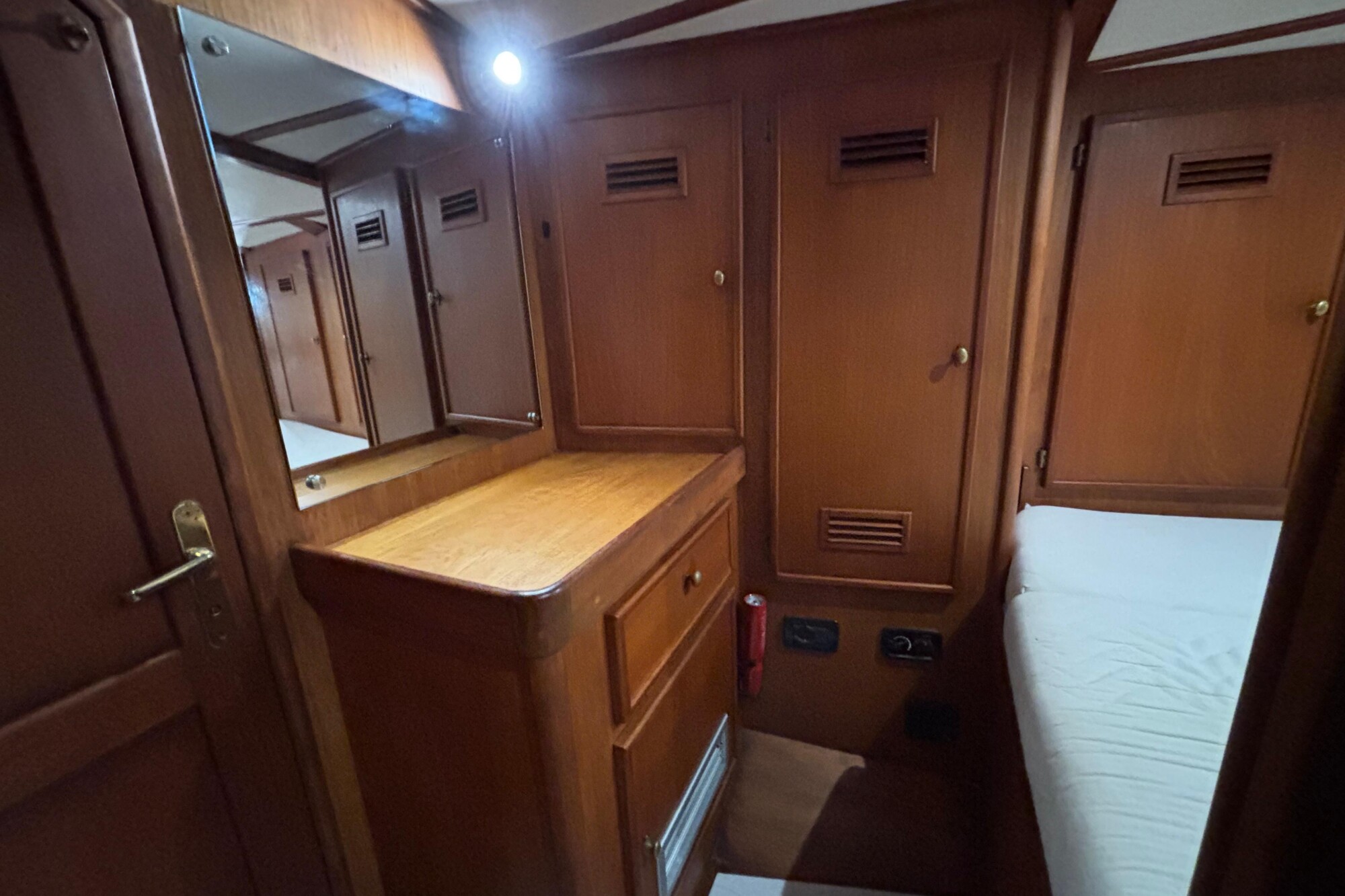 Located fwd starboard, the owner’s cabin features a spacious double berth with new mattress, storage lockers, shelving and vanity area. The cabin benefits from good ventilation and natural light, making it comfortable for long voyages. A removable panel between the owner's cabin and saloon provides either privacy or a more open plan feel.