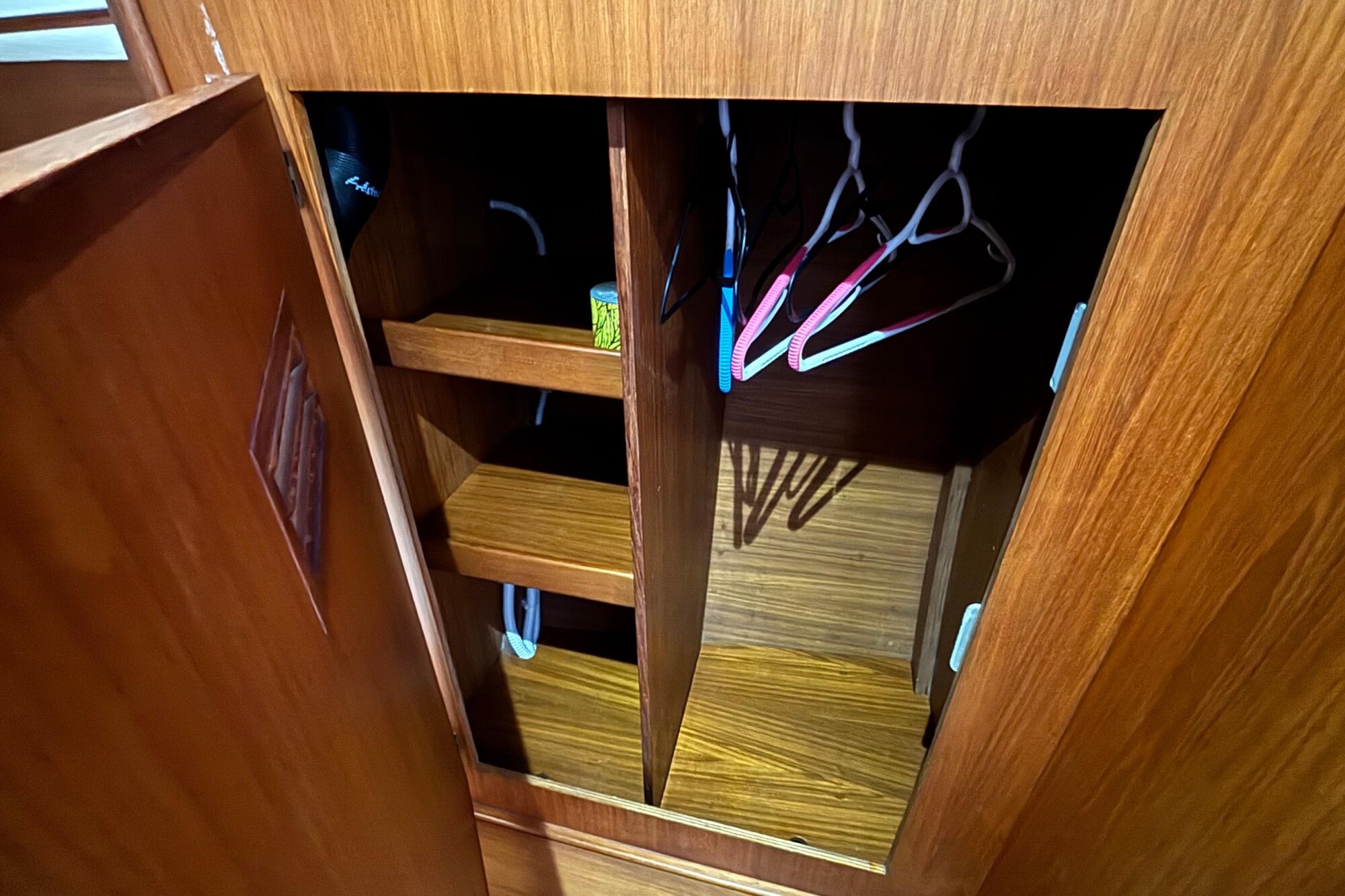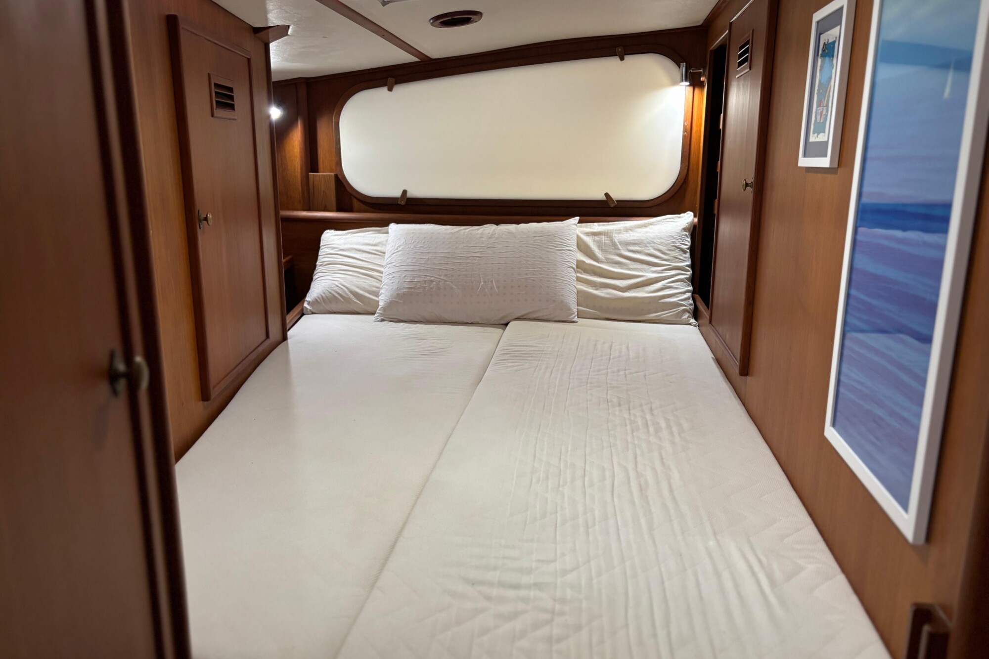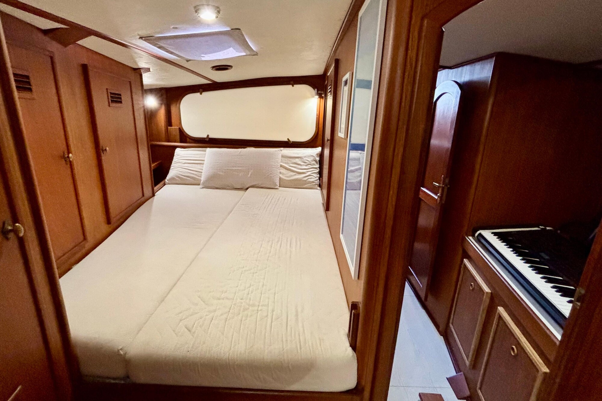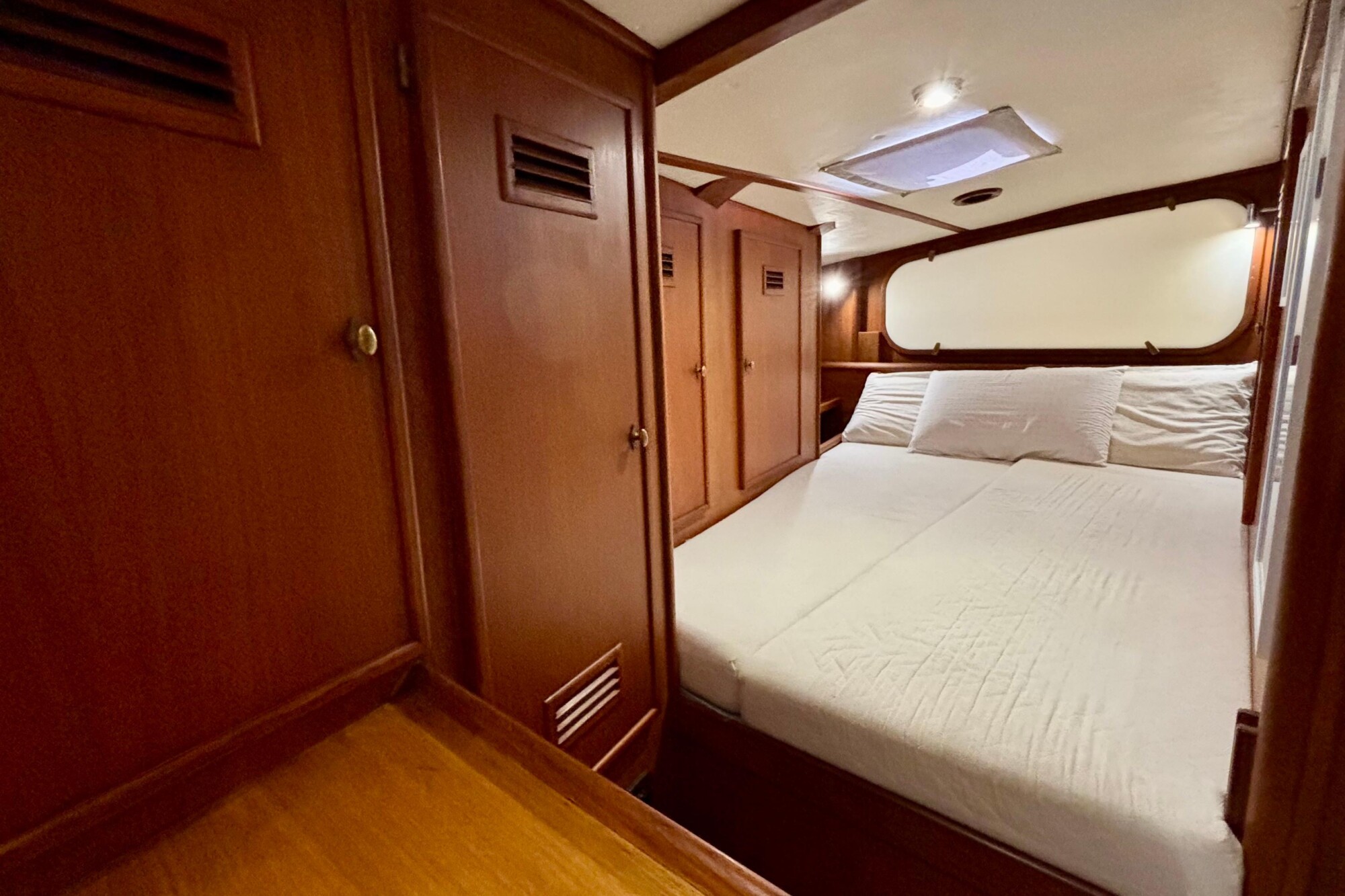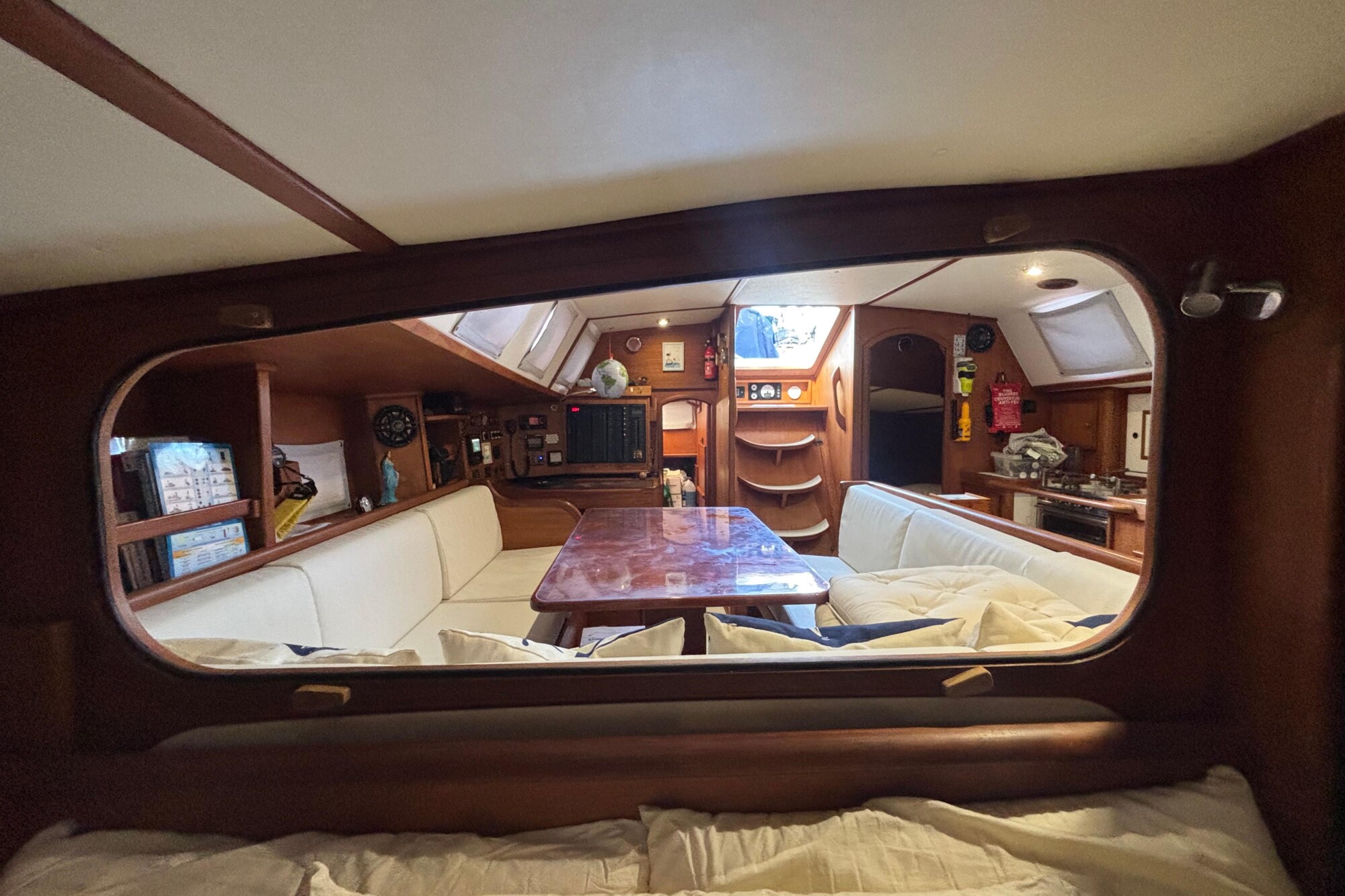 Located fwd starboard, the owner’s cabin features a spacious double berth with new mattress, storage lockers, shelving and vanity area. The cabin benefits from good ventilation and natural light, making it comfortable for long voyages. A removable panel between the owner's cabin and saloon provides either privacy or a more open plan feel.
