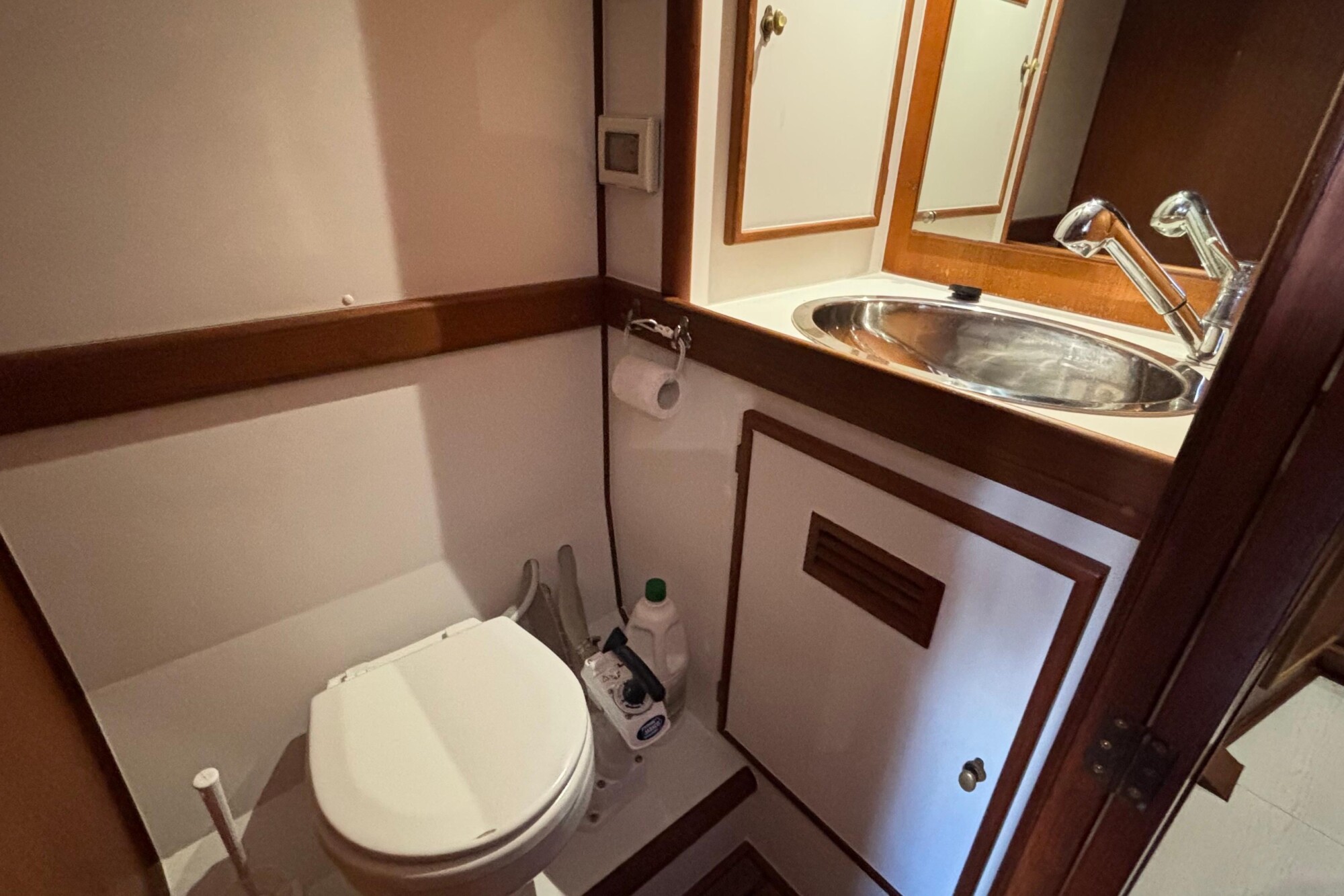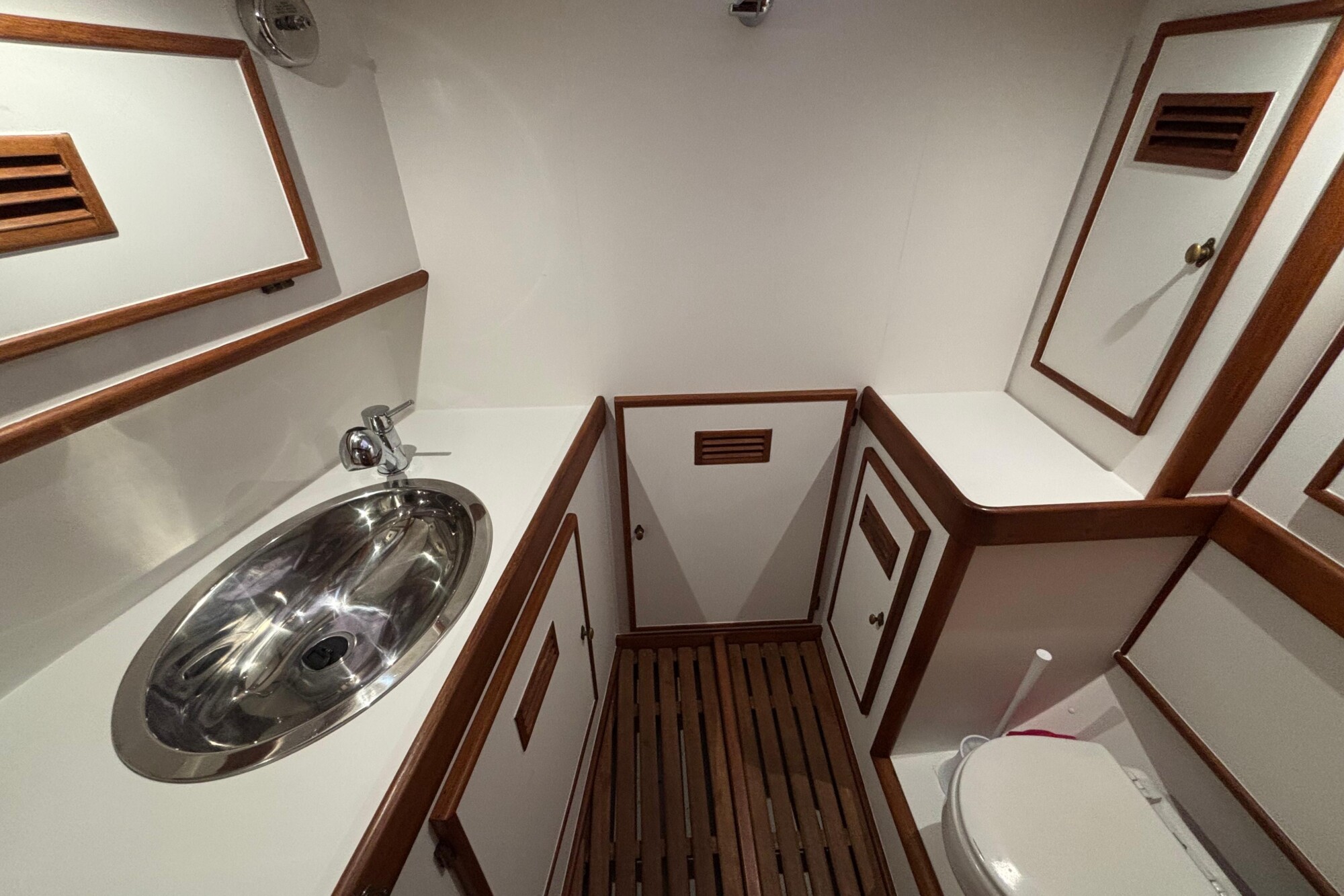 Positioned just fwd of the owner's cabin, the heads is generously sized and includes a new marine manual toilet, new s/s washbasin, and separate shower area.