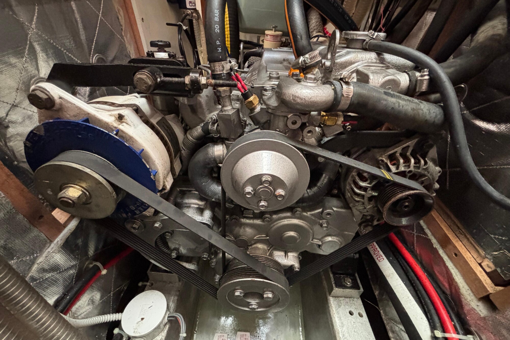 A Yanmar 4JH4-TE diesel engine, new 2017. Eng Hrs 2143. Last serviced Oct 2025. Engine was removed during refit and sent to an Italian YANMAR dealer to have a full check and maintenance. A secondary Balmar alternator with a serpentine belt provides additional battery charging capacity. The engine drives a NEW 4 bladed Maxprop Easy via a ZF30M gearbox and stainless steel shaft.