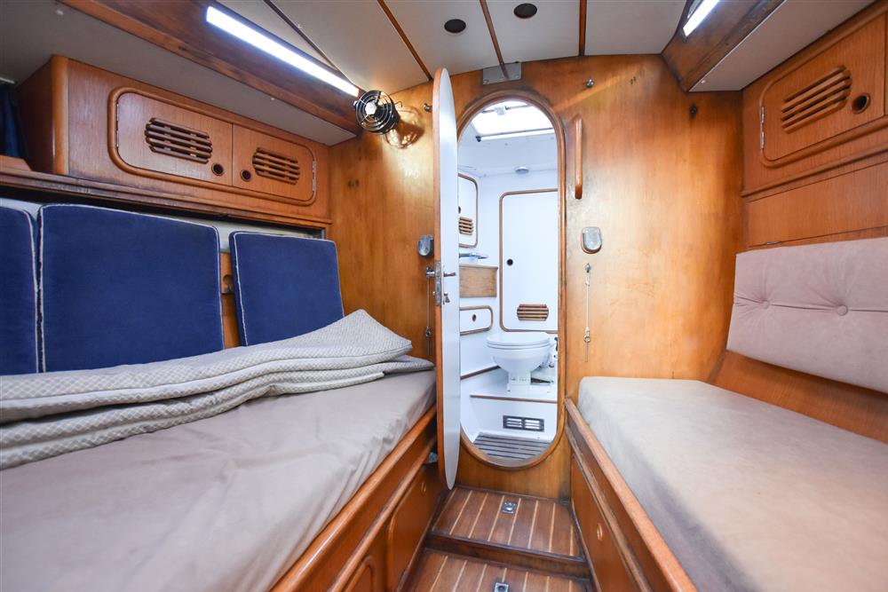 Offering up to 6 berths in a light & airy interior, beautifully finished off with light oak joinery and oak & holly sole boards. Up forward is the guest heads compartment with a Jabsco manual marine toilet with a 100l holding tank (electric pump out). Stainless steel basin, mirror and shower. Plenty of handy stowage and lockers. Stepping aft you move into the forward guest cabin with two single berths to port and starboard with pipe cots over both. Good stowage again around the cabin and a deck opening hatch. Stepping up into the spacious deck saloon, there is a curved settee to port with a fixed saloon table with a folding leaf. Opposite to starboard, there are two comfortable seats. Saloon is full of handy stowage lockers, plenty of natural light and opening portholes & hatches. The forward chart table is to port, with the electrical distribution panel, navigation equipment and chart stowage. Access to the aft en-suite heads compartment. Over to starboard, in the walk through to the aft cabin is the large Linear galley, comprising of a 4-burner gas hob with an oven and grill. Twin stainless-steel sinks, top-loading Frigomatic refrigerator. There is a vast amount of working space and stowage in the galley. Stepping in the aft owners cabins, there is a large double island berth to centre and a single settee to starboard. There are plenty of drawers, shelving and hanging lockers through the cabin. Access to the en-suite heads compartment is to port. The heads compartment has a Jabsco manual marine toilet, basin and shower. Pressurised hot & cold water supply throughout. Mikuni diesel cabin heating throughout. Beige upholstery. Blue curtains. 12 volt fans. Two GRP water tanks giving an approximate capacity of 545 litres.