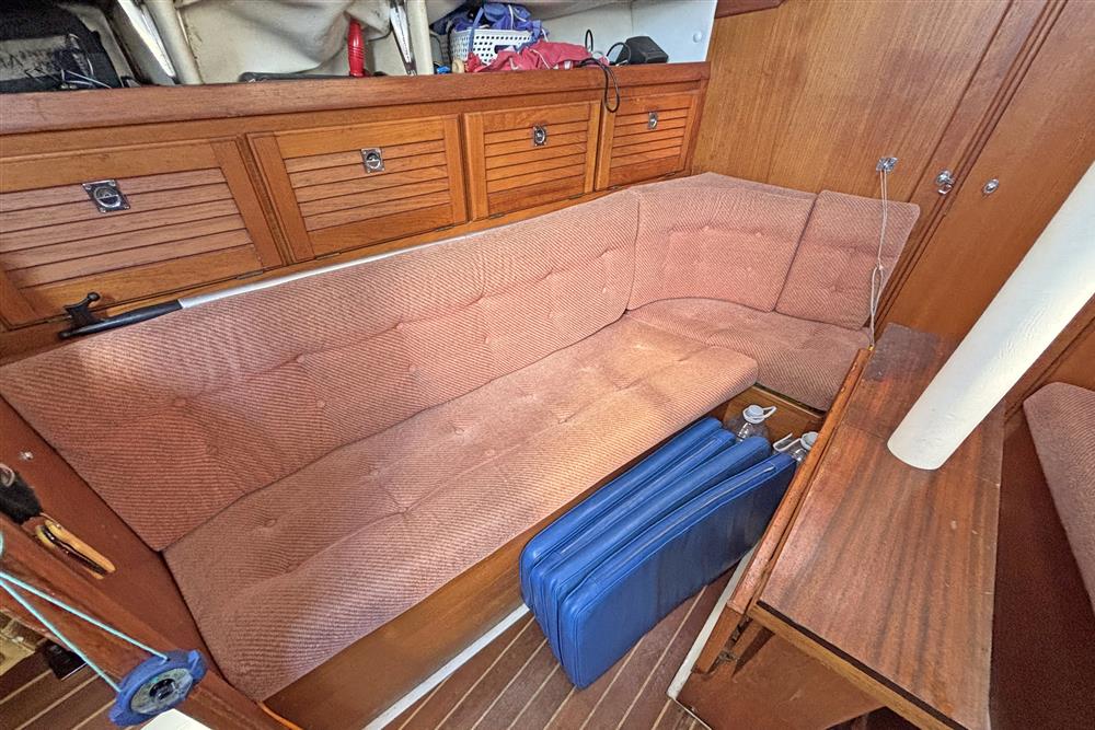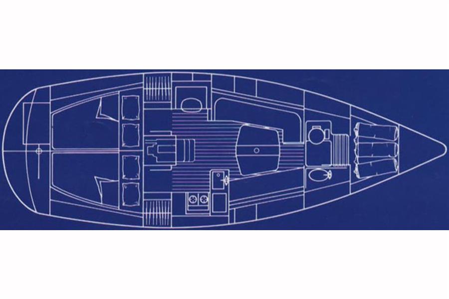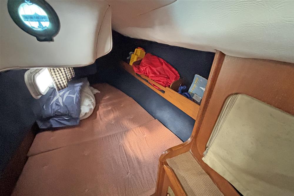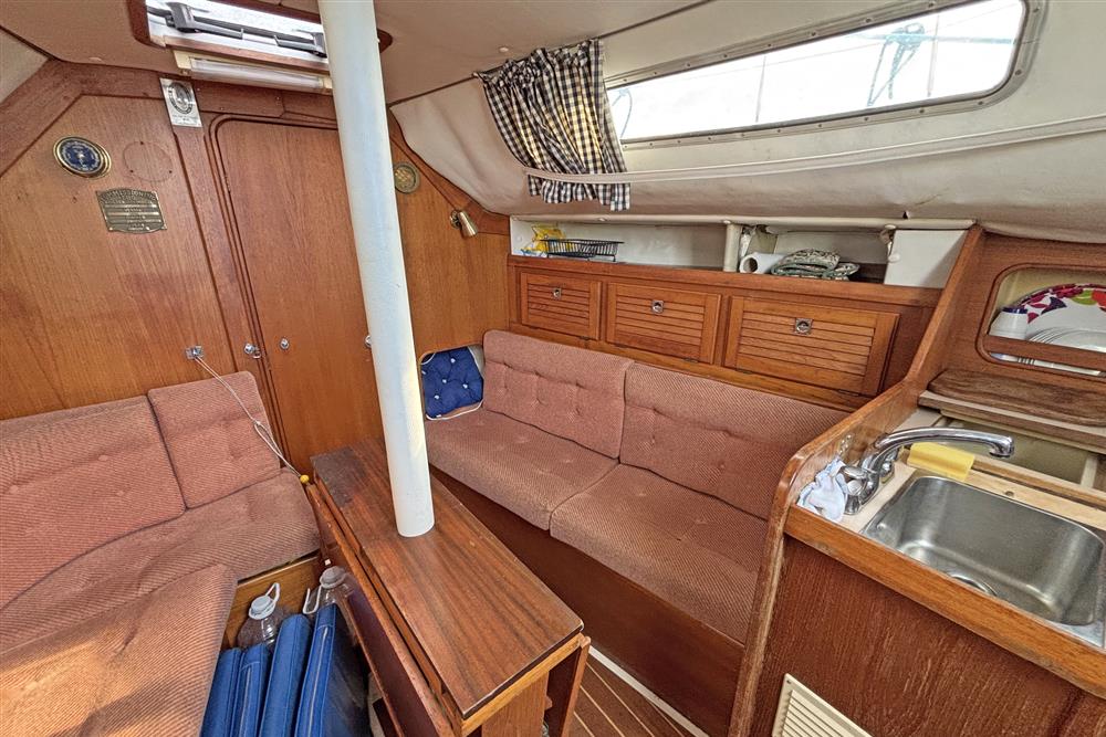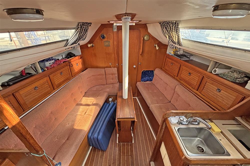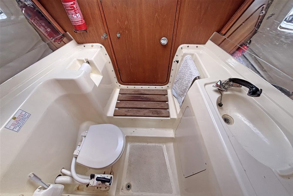 The accommodation offers up to 6 berths with two aft cabins and the saloon. Up forward there is a full width heads compartment with marine toilet, shower and basin. Hot and cold pressurised fresh water system, 90 litres tank capacity. Access to the chain locker and good stowage. Moving aft in to the saloon, there is a dinette to port and settee berth to starboard with double folding leaf table between. Stowage under the berths, lockers at eye level with shelving above. The L shaped galley is to starboard and has a two-burner gas cooker with gill and oven plus a sink and top loading fridge. Plenty of dedicated crockery stowage plus drawers and lockers. Opposite the galley to port is the outboard facing chart table with fold out navigation seat and switch panels. There are two symmetric double aft cabins with shelving and lockers. Curtains.