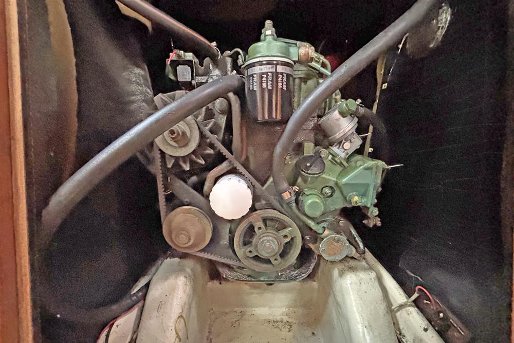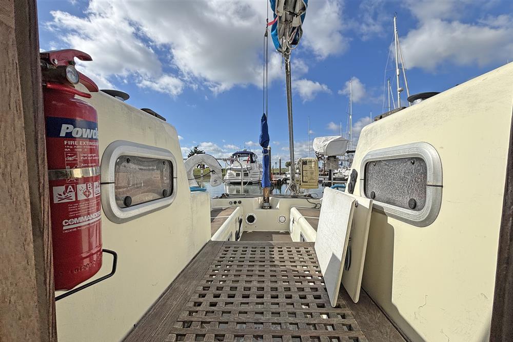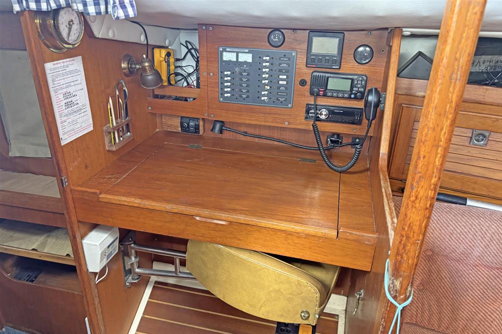 Located under the companionway is the 1991, Volvo Penta 2002, 18hp marine diesel engine. Fresh water cooled. Shaft drive to two blade fixed propeller. Rope cutter to shaft. Single lever engine controls. Stainless steel fuel tank of 72 litre capacity. Engine hours recorded at 1,523 in 2025.
