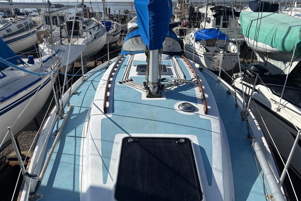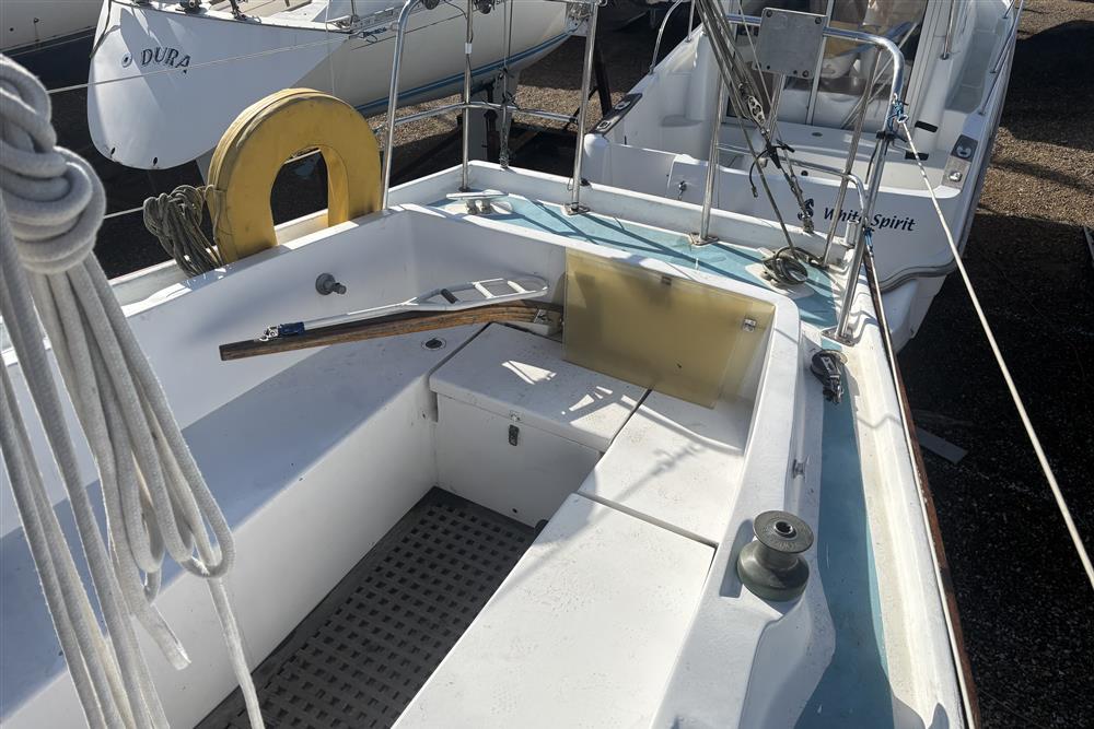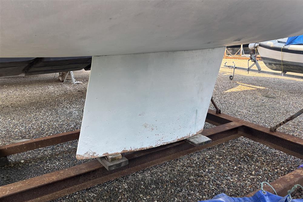 Built by Bailey & Hartegen in 1992. White GRP hull with style stripes. Wooden rubbing strake. White GRP hull with a blue painted non-slip finish. Fin keel with an encapsulated lead ballast. Tiller steering to a spade hung rudder. Small sugar scoop stern. Last surveyed in 2023.