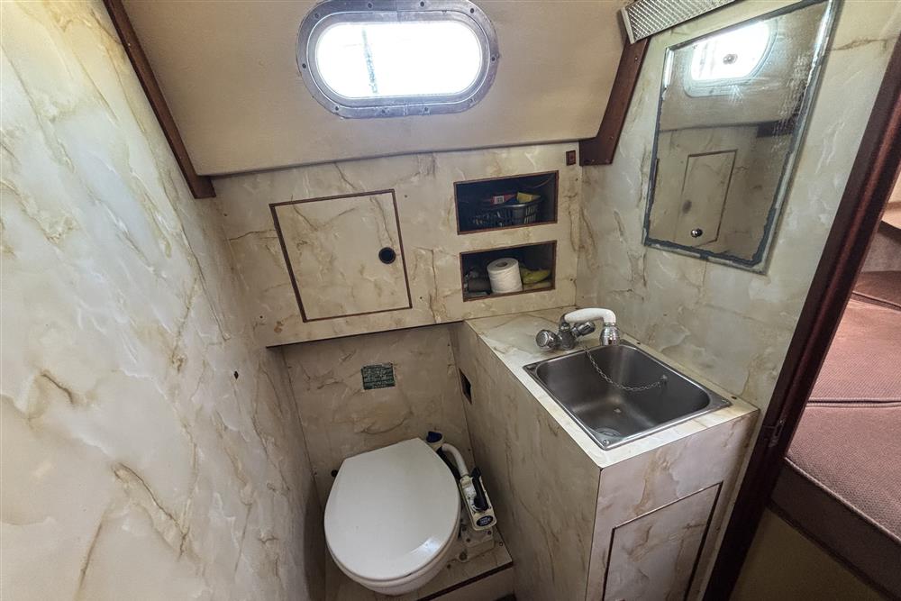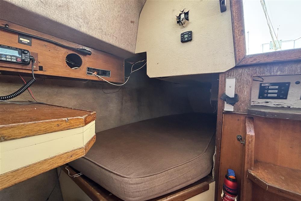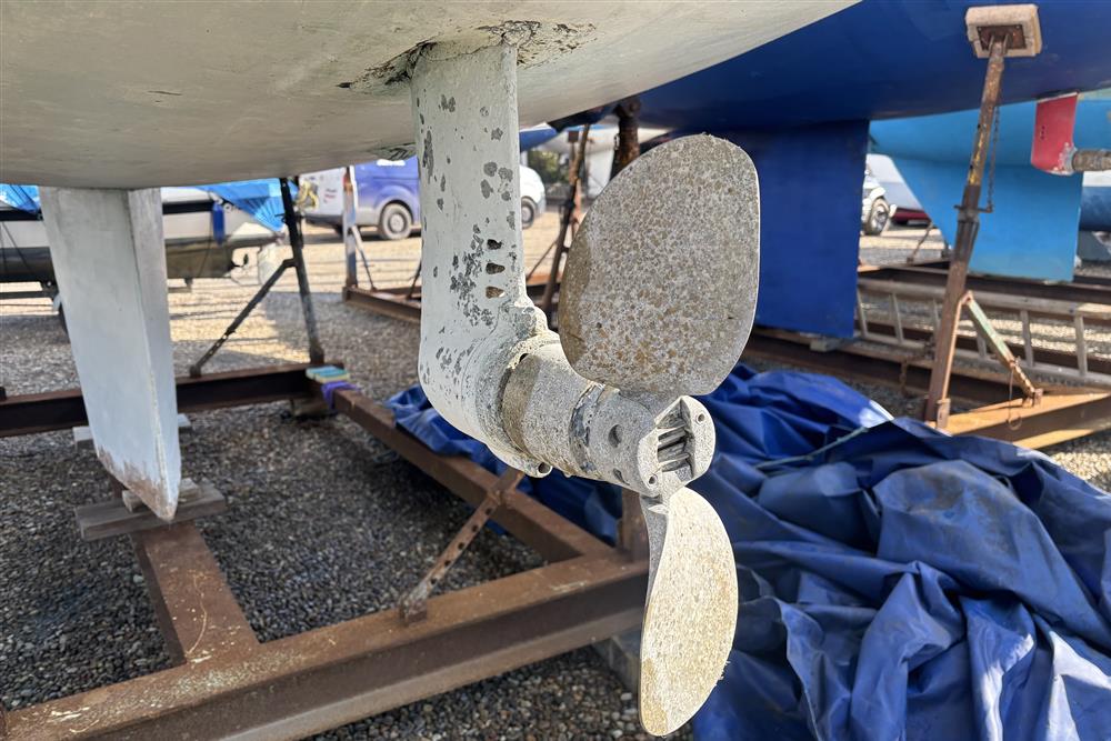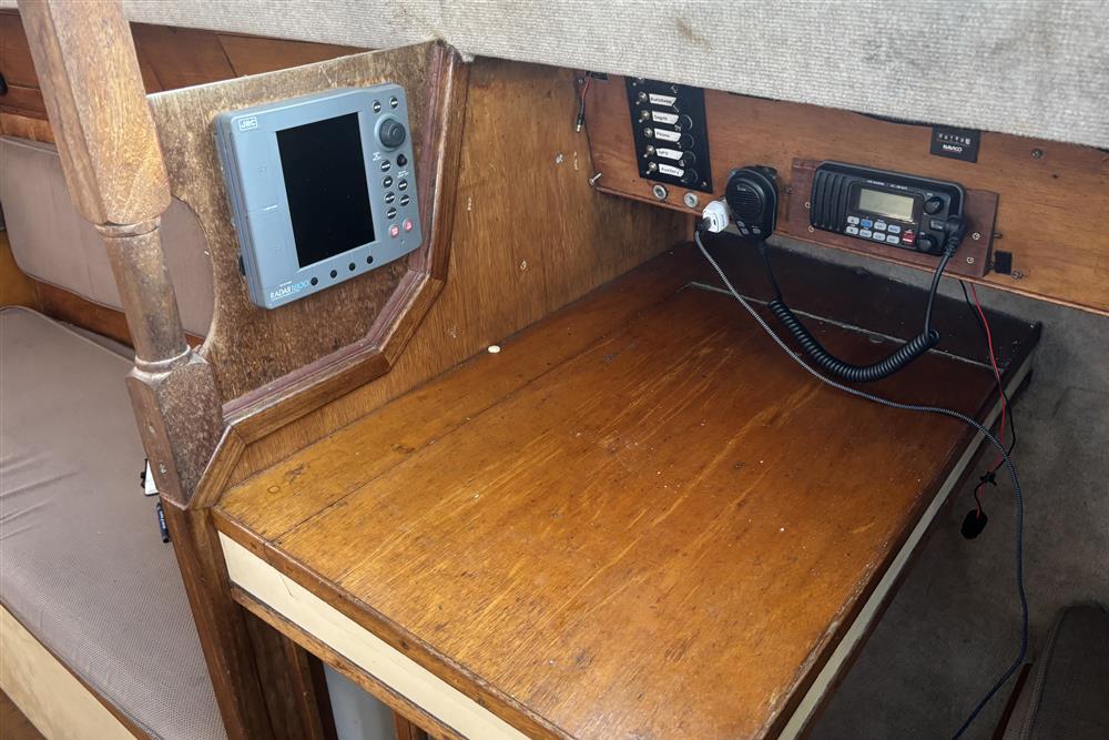 Located behind the companionway steps is the Yanmar 3GM30FC marine diesel engine fitted in 1992. Three cylinders, 30hp, naturally aspirated. Fresh water cooled via a heat exchanger. Single lever controls. Electric start. Sail drive to a folding two blade propeller. Sail drive diaphragm original (1992). 30 litre fuel tank.