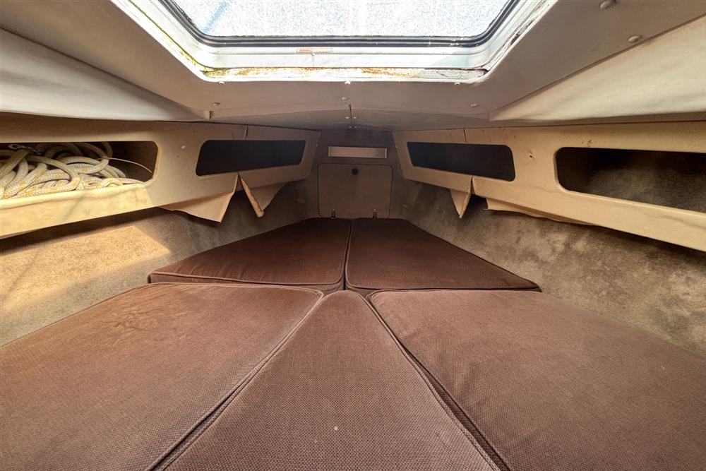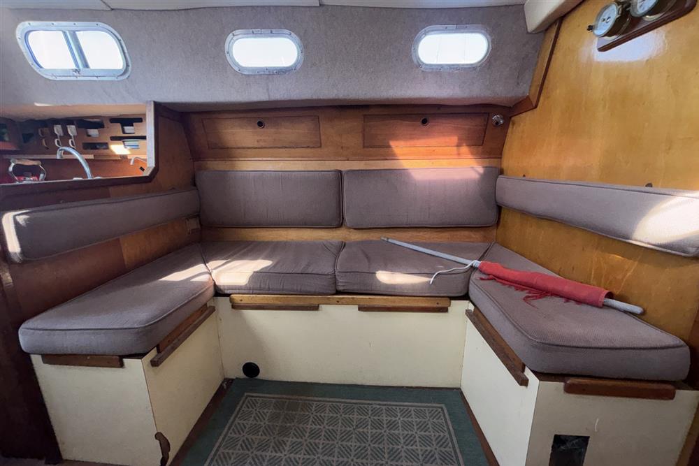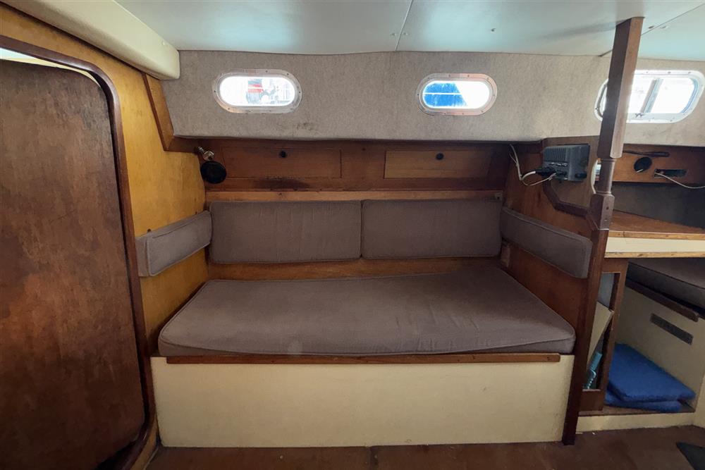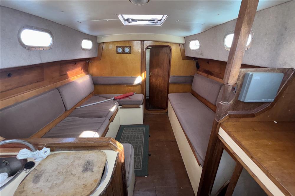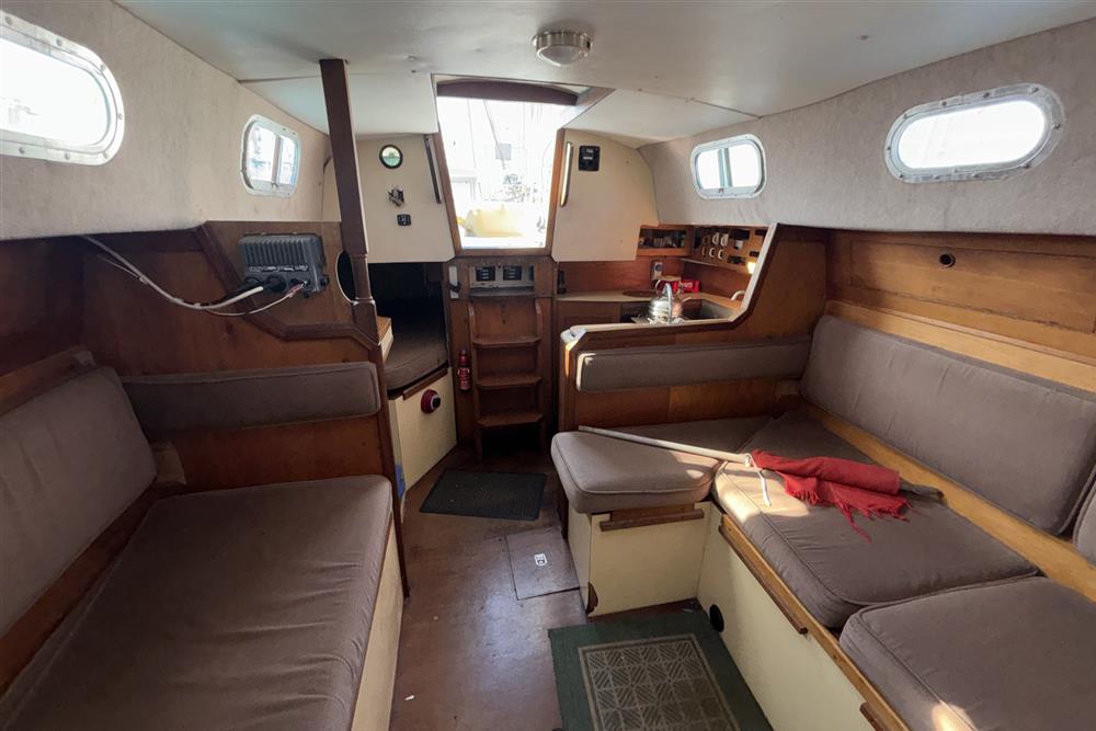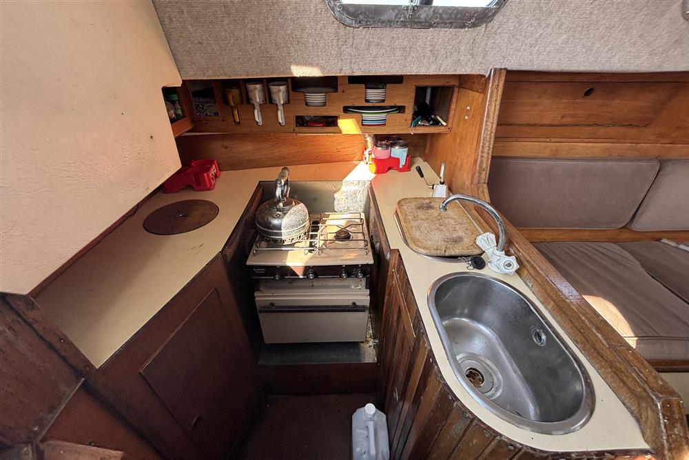 Offering up to 6 berths in a traditionally laid interior with plenty of natural light and ventilation. Up forward there is the double V-berth with an infill. Good stowage below and in eye level shelving. Deck opening hatch. Stepping into the full width heads compartment, there is a Jabsco manual marine toilet to port. Stainless steel basin with a pressurised hot & cold water supply. Tap pulls out to make a shower. Twin hanging lockers opposite to starboard. Moving into the saloon, there is a U-shaped dinette to port with good stowage underneath and behind. Single settee berth opposite to port, again with good stowage underneath and behind. In the port quarter, is the U-shaped galley with two stainless-steel sinks with a pressurised hot & cold water supply. Extra manual cold water supply. Flavel Vanessa 2 burner gas hob with a grill and oven. Top opening Waeco fridge. Good stowage around the galley. Opposite in the starboard quarter, is the forward-facing chart table with the electrical distribution panel and some navigation equipment. Large quarter berth behind. Brown upholstery throughout. Eberspacher diesel fired cabin heating.