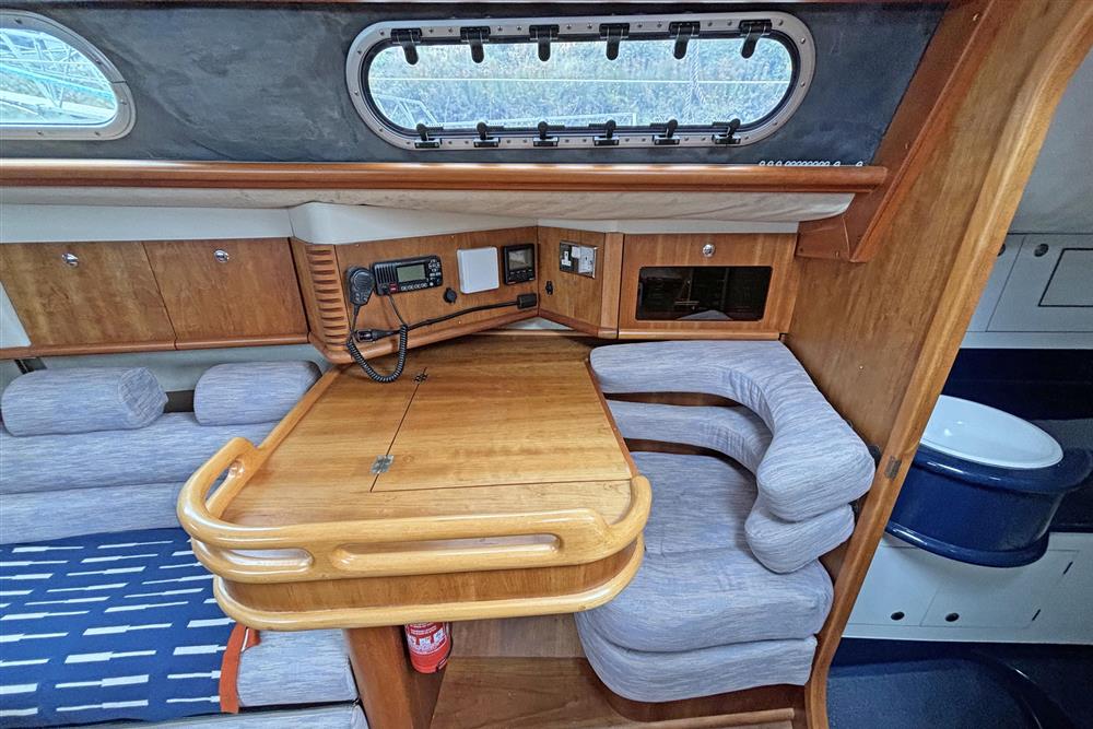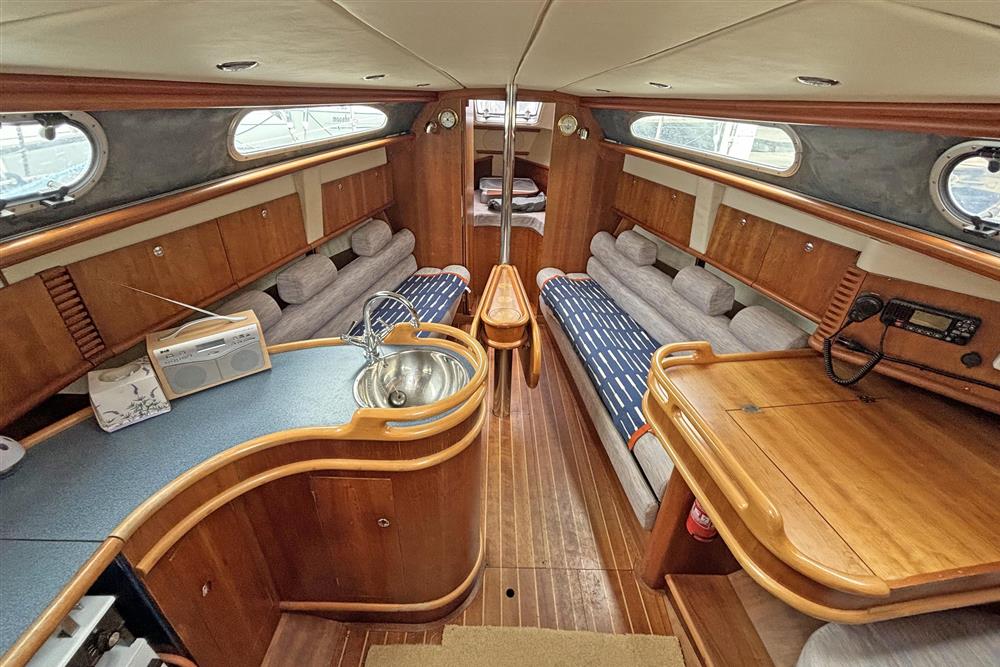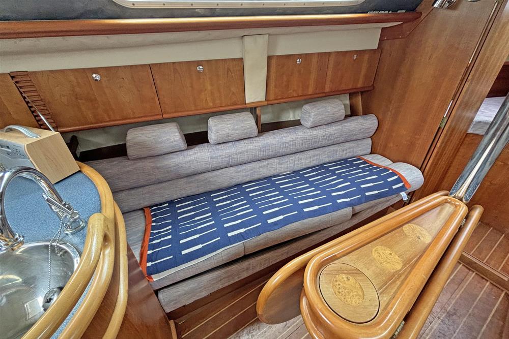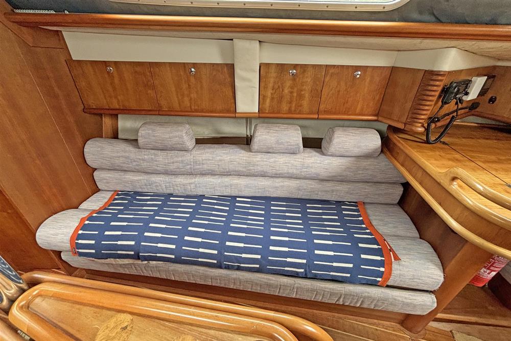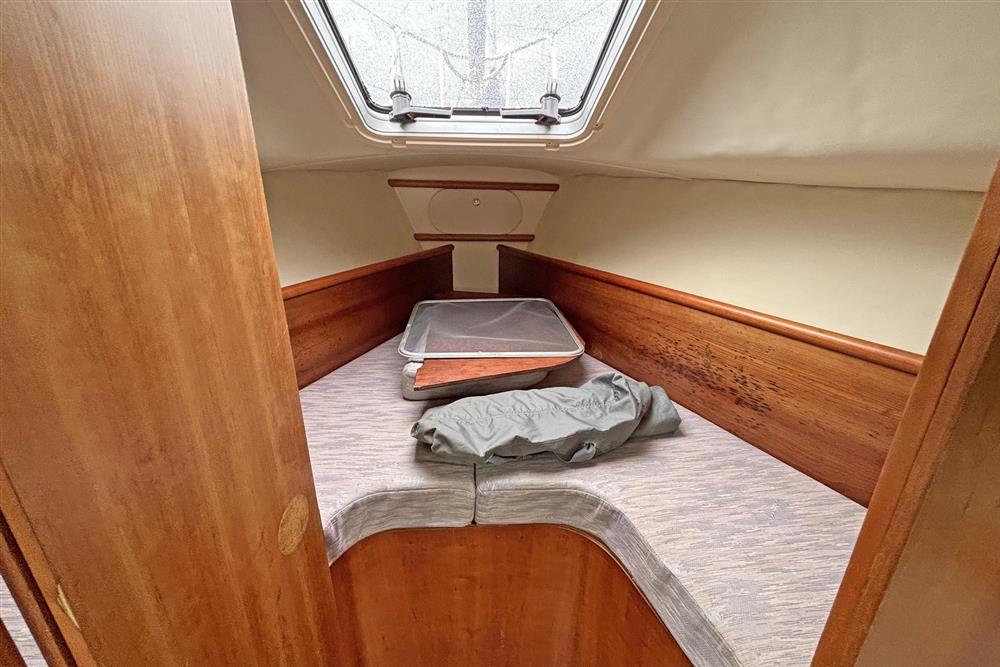 Six berths in two cabins plus the saloon. Forward cabin has a V berth, shelving, storage and forehatch. The saloon has two settee berths with unique headrests, eye level and under berth storage plus a drop leaf saloon table between. The forward-facing chart table is to starboard and has a good size table and seat, storage and instruments. The heads compartment is aft of the chart table and has a marine toilet, wash basin and shower. The L shaped galley is to port and has a Flavel Vanessa gas cooker with two burners, grill and oven. Stainless steel galley sink, plenty of eye level and under counter storage. The insulated ice box is under the starboard settee berth. The double berth aft cabin has an access door to port. This has a hanging locker and shelf storage. Lilac cloth upholstery. Hot and cold pressurised freshwater system heated via engine and 240V immersion heater.