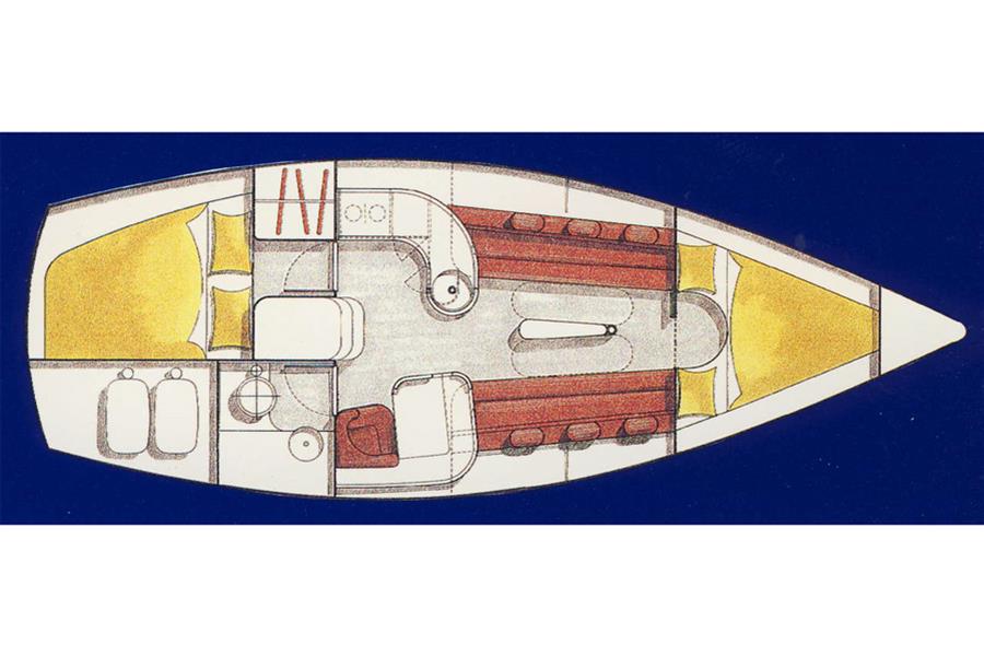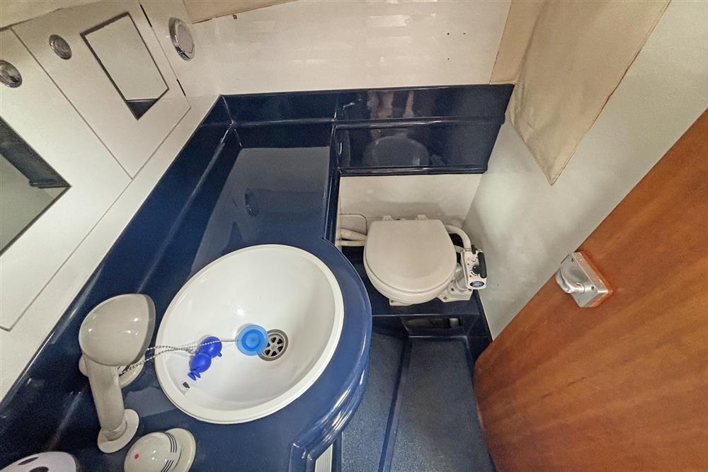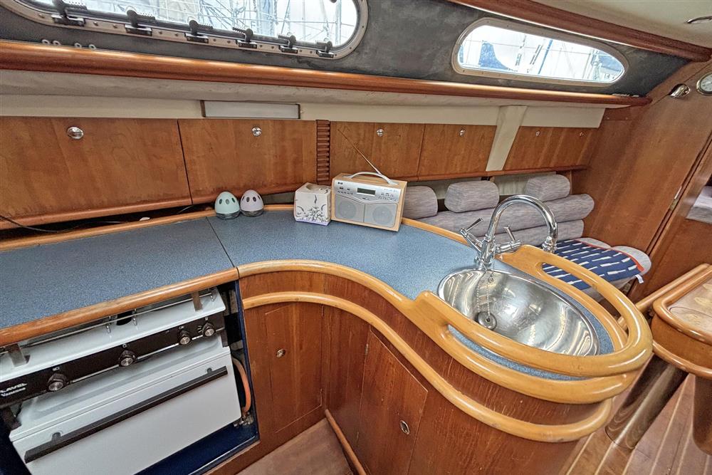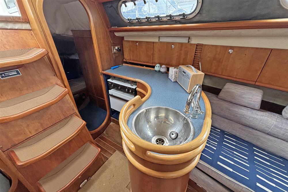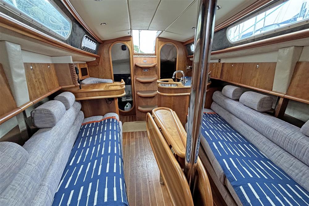Six berths in two cabins plus the saloon. Forward cabin has a V berth, shelving, storage and forehatch. The saloon has two settee berths with unique headrests, eye level and under berth storage plus a drop leaf saloon table between. The forward-facing chart table is to starboard and has a good size table and seat, storage and instruments. The heads compartment is aft of the chart table and has a marine toilet, wash basin and shower. The L shaped galley is to port and has a Flavel Vanessa gas cooker with two burners, grill and oven. Stainless steel galley sink, plenty of eye level and under counter storage. The insulated ice box is under the starboard settee berth. The double berth aft cabin has an access door to port. This has a hanging locker and shelf storage. Lilac cloth upholstery. Hot and cold pressurised freshwater system heated via engine and 240V immersion heater.