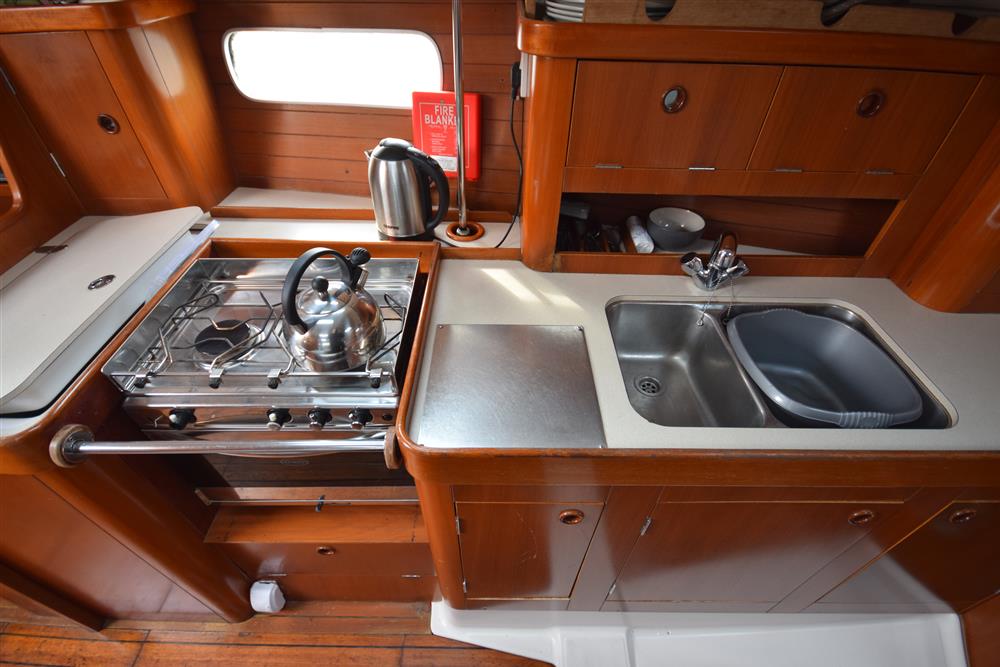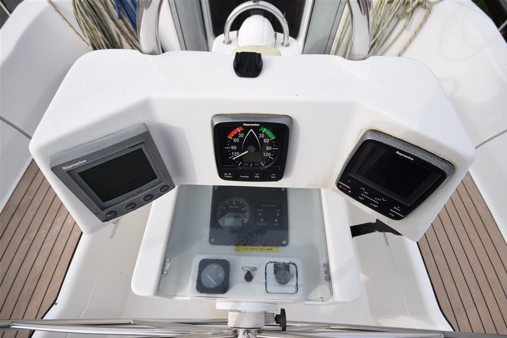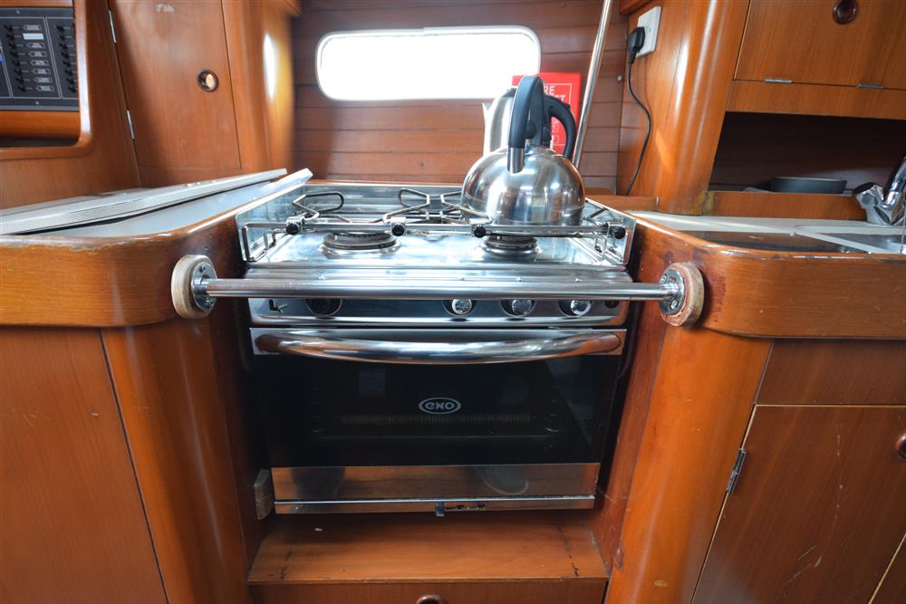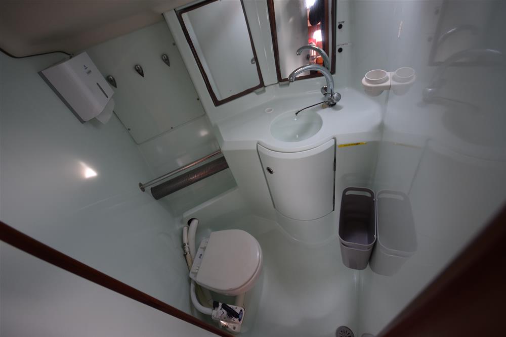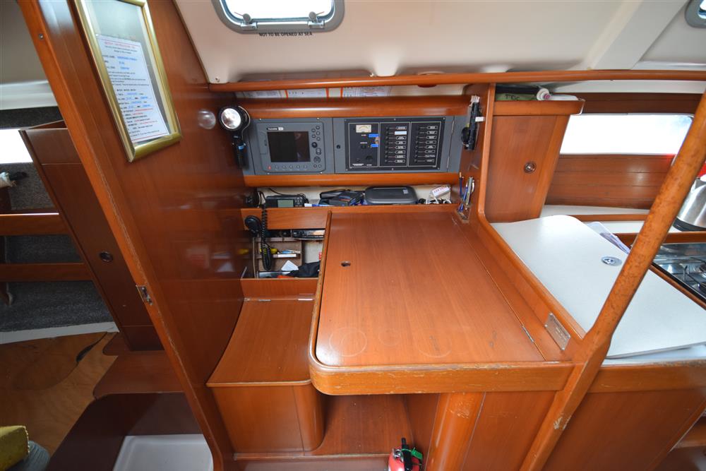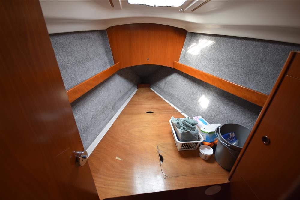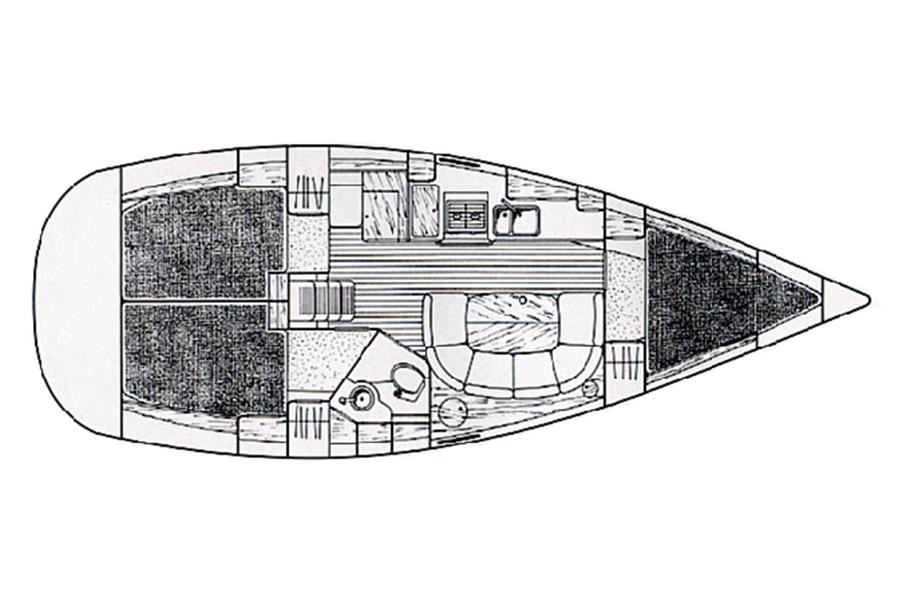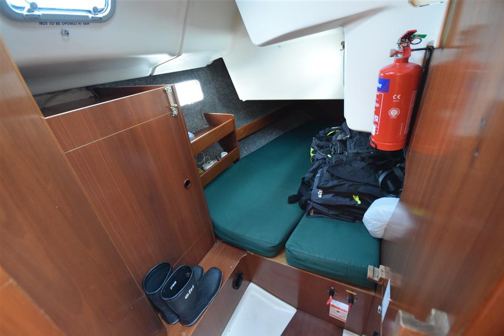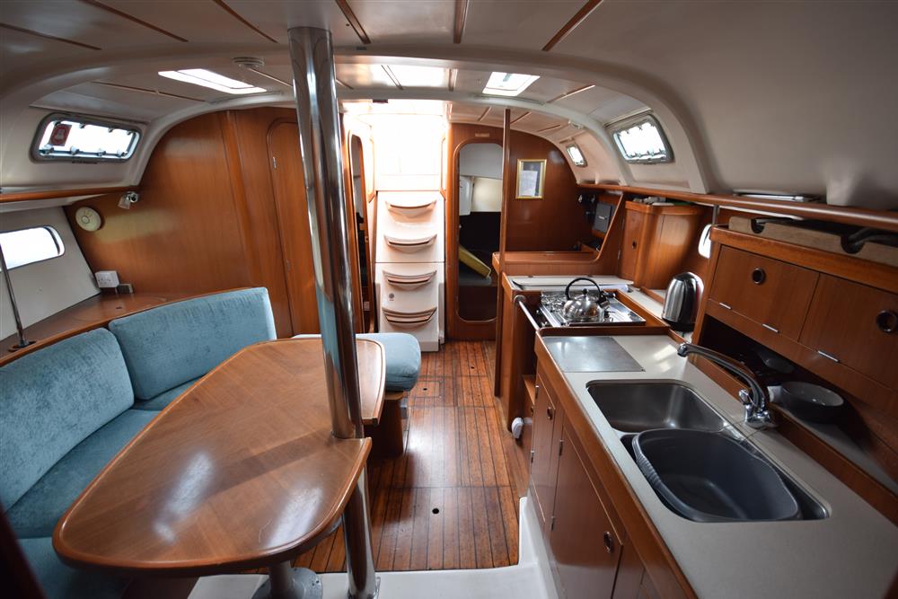 The Beneteau Oceanis 351 three-cabin layout offers up to eight berths with three double berths outside the saloon and 6'3" max headroom. FORECABIN: Fitted with a double V berth, hanging locker, storage shelves, and an opening hatch to the foredeck. SALOON: Consisting of a large U-shaped settee to starboard with dining table (this can convert to a double berth), useful storage areas, and a large linear galley to port. Plenty of natural light and ventilation is provided by an opening hatch, two skylights, and two large opening portlights. GALLEY: Large linear galley to port equipped with a gimballed ENO two-burner gas cooker with grill and oven, twin stainless steel sinks, large fridge, and generous stowage. A selection of cutlery, crockery, and utensils is included. CHART TABLE: Aft to port, with electrical distribution panel, navigation equipment, chart storage, and further useful stowage beneath the seat and in lockers. HEADS: Separate heads compartment aft to starboard equipped with a Jabsco marine toilet, shower, washbasin, and good storage. AFT CABINS: Separate aft cabins to port and starboard, each fitted with a double berth, hanging locker, two portlights, and further storage. GENERAL EQUIPMENT: Excellent ventilation throughout is provided by numerous opening hatches and portlights. Pressurised hot and cold water system via calorifier with immersion coil. Diesel-fired warm air heating system. Green cotton upholstery.