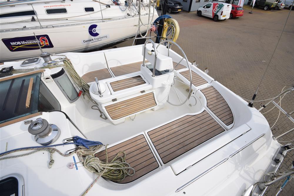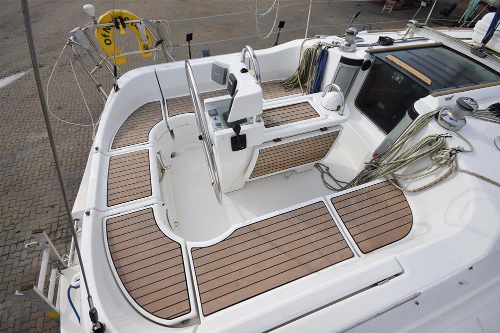 Beneteau Oceanis 351 built in 1994 by Beneteau to a Jean Berret design. White GRP hull with style stripes, superstructure, and decks with moulded non-slip surfaces. Teak slats to cockpit seats. Moderate draft cast iron fin keel. Wheel steering to spade hung rudder. Self-draining aft cockpit with walk-through transom. Fixed cockpit table with folding leaves and teak inserts. Bow, stern and miship mooring cleats.