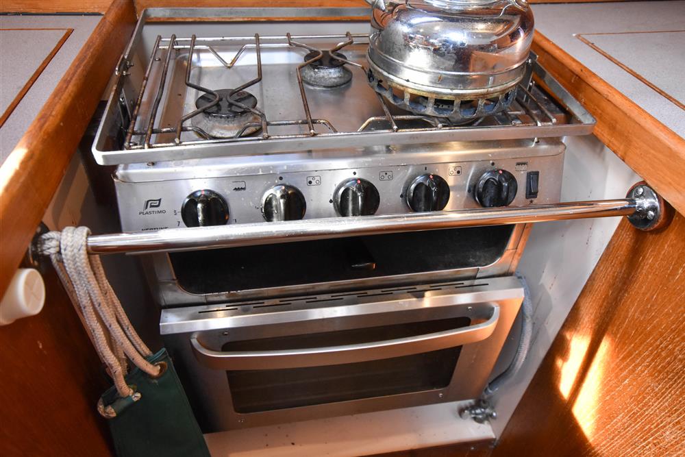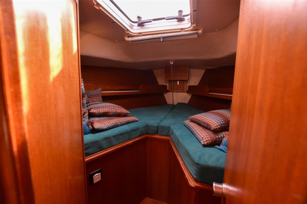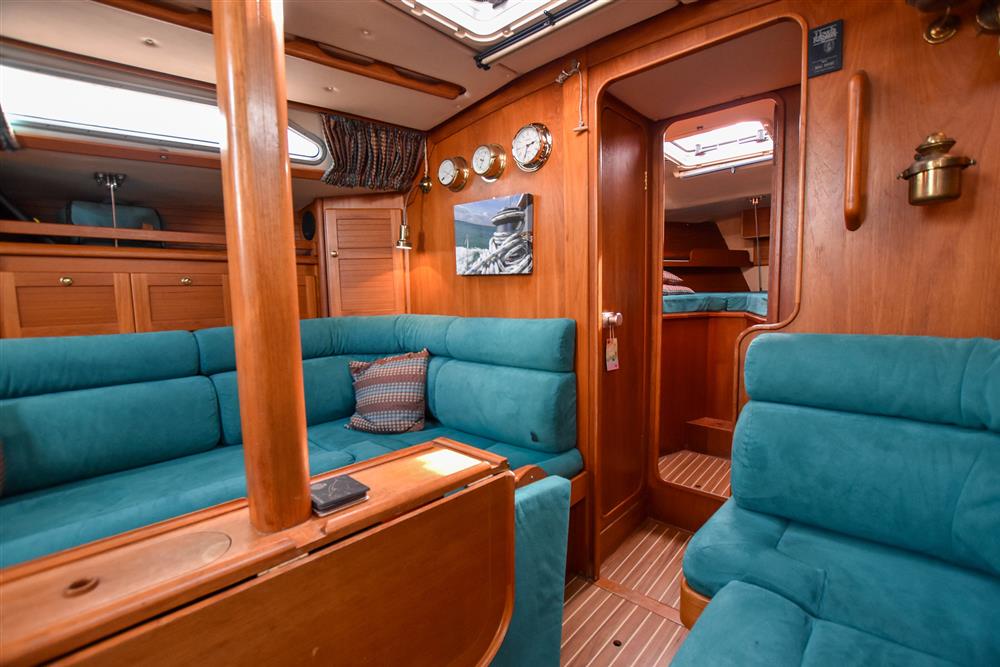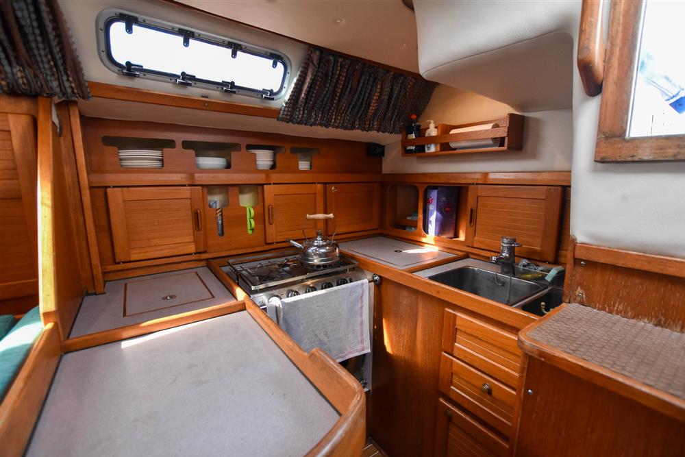 The accommodation offers up to seven berths with two separate double cabins. Throughout, there is full standing headroom, excellent ventilation, and generous stowage. Gorgeous teak internal fitout. Up in the forecabin, there is a V-berth with infill to make a double. Stowage beneath, together with a hanging locker, shelving, and an opening hatch to the foredeck. To port lies a separate heads compartment fitted with a Jabsco marine toilet, washbasin, and shower, with additional hanging lockers opposite. The saloon is bright and welcoming, featuring and L-shape settee berth to port and single settee berth to starboard. Fixed double drop leaf table to centre. Plenty of handy stowage lockers behind and underneath both berths. Opening hatch provides additional light and airflow. The large L-shaped galley is to starboard, which is equipped with a gimballed three-burner gas cooker with oven and grill, twin stainless steel sinks with pressurised hot and cold water, and a refrigerator. Opposite to port is the forward-facing chart table with the electrical distribution panel, navigation equipment and chart stowage. A walkthrough to port in to the aft cabin incorporates a single berth. The aft cabin itself is spacious, offering a central double berth with stowage below, with two chairs eitherside. Deck opening hatch. Cream carpets. Reading lights. The aft cabin also benefits from a voluminous hanging locker to starboard, instead of the en-suite heads compartment. Webasto diesel-fired cabin heating. Radio/CD player. Bulkhead mounted TV with a Glomex TV antenna. Turquoise upholstery.