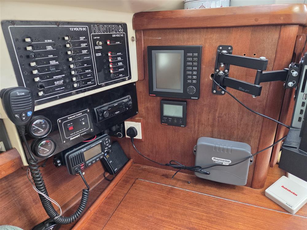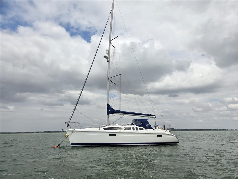 Built by Hunter Marine in 1996. White GRP hull and superstructure. Moulded non slip decks. Spade rudder. Fin keel with bulb. Last antifouled in March 2025 and new anodes in February 2025.