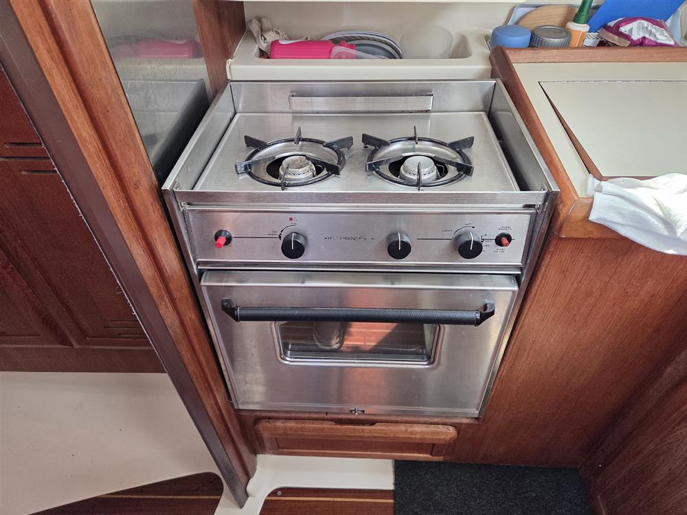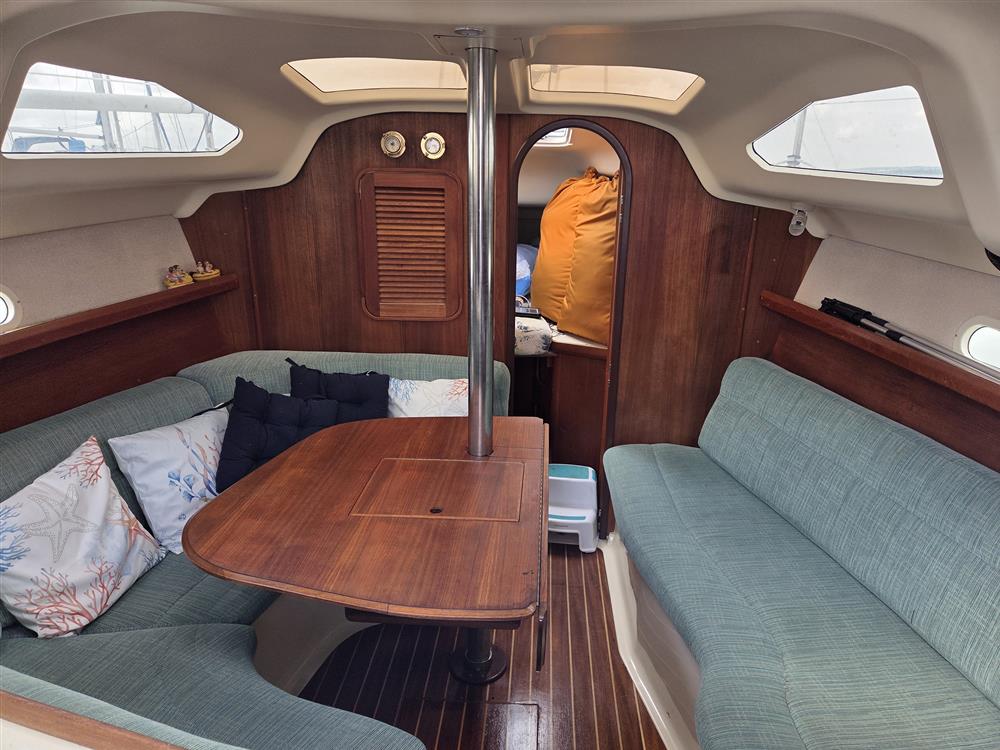 There are seven berths across two cabins and the saloon. Aft is the owners cabin with a double berth, taking up the full beam of the boat, with good standing headroom near the hanging lockers and opening hatches for ample ventilation. Forward is a V berth, large enough to sleep two adults, with good stowage and ventilation. The saloon is spacious enough for seven adults to dine in comfort. To port is a large U-shaped seat and starboard has bench seating, all arranged around the folding dining table. The U-shaped seat converts into a double berth and the bench seating could be used as a single. She has a wet heads with good standing headroom, a Jabsco manual sea toilet, vanity/basin and a shower. All with hot and cold pressurised water. The galley is aft next to the companionway with plenty of fluted edges for comfortable and safe usage even underway. Equipped with a two-burner gas stove with oven and grill, fridge, stainless steel sink with mixer tap and plenty of worktop space. Aft-facing chart table opposite the galley with switch panel, VHF radio and Cello 24" flat screen TV. The accommodation is heated throughout by Eberspacher heating. Approximately 300 litres of fresh water, 110 litre holding tank.