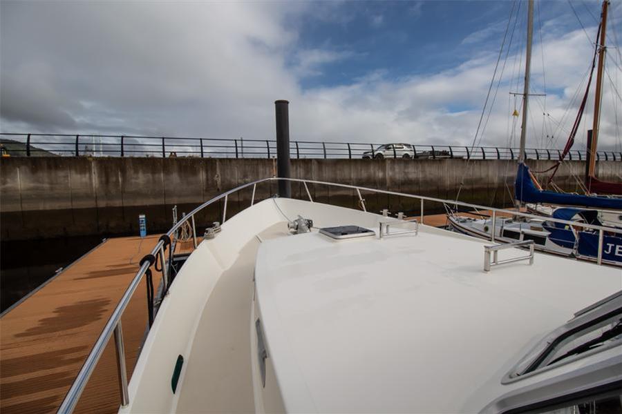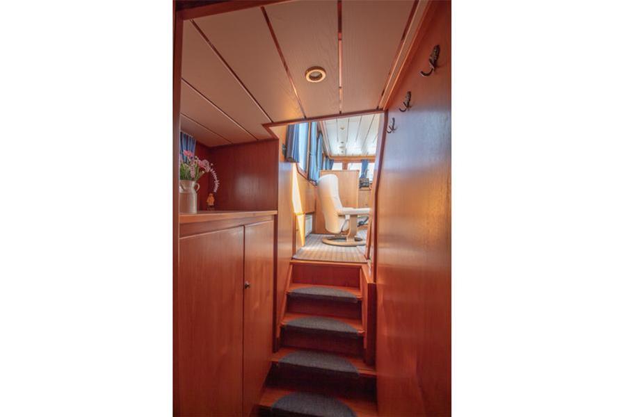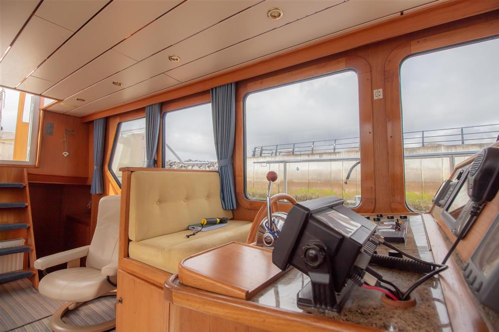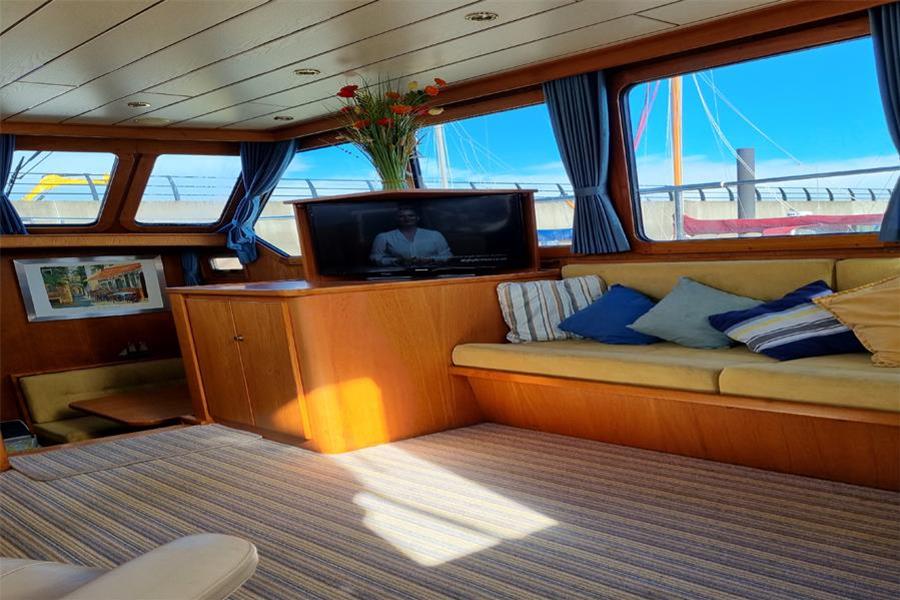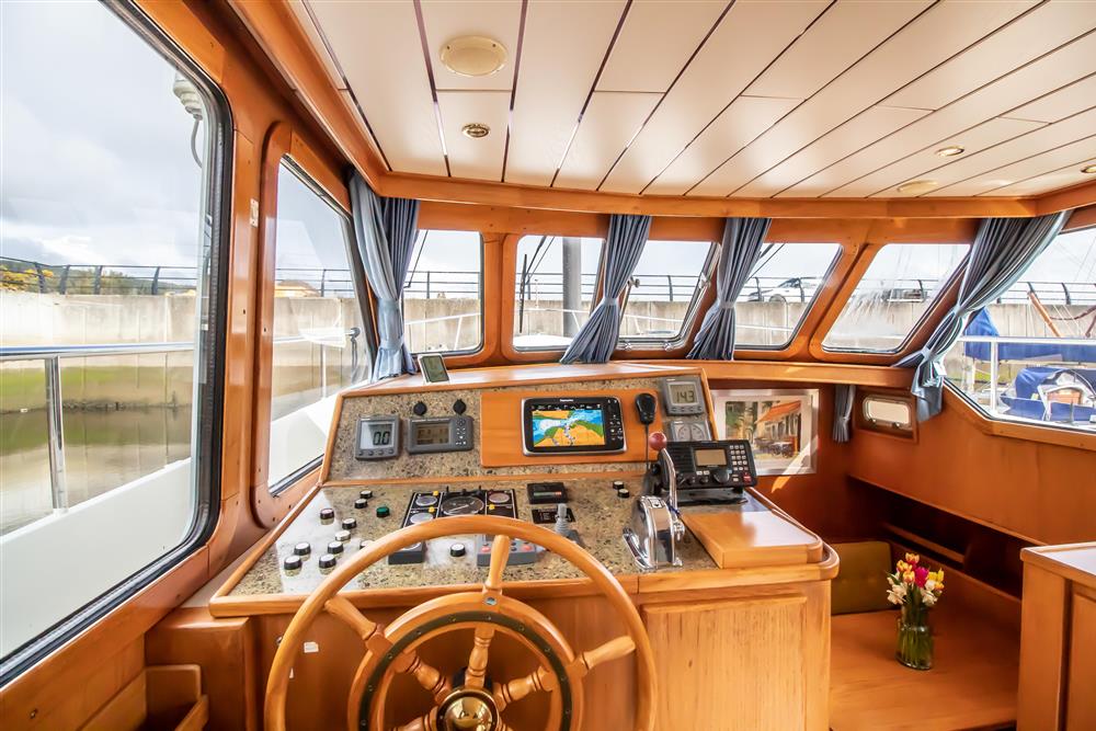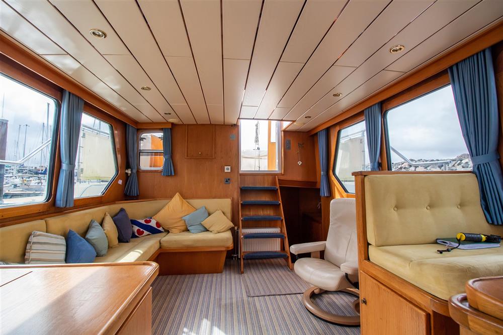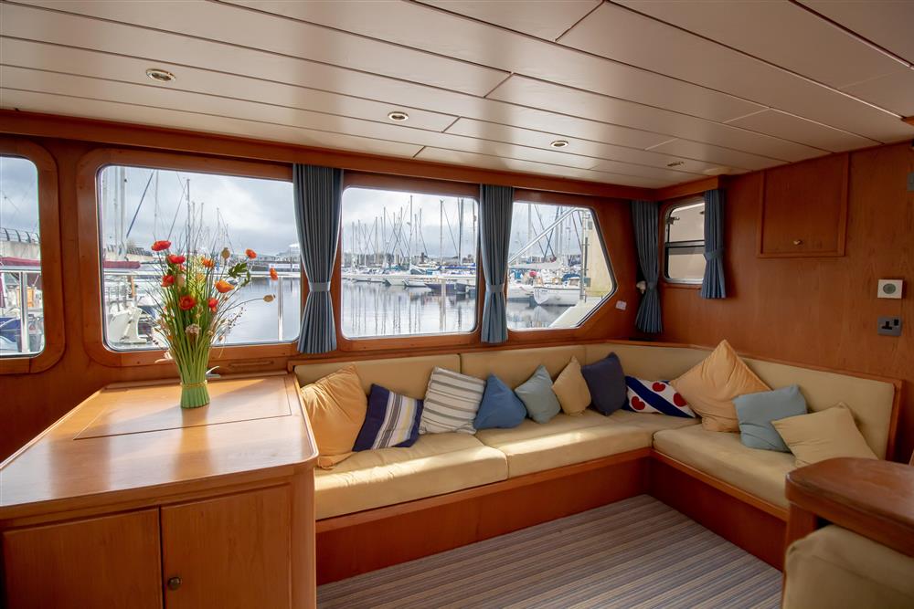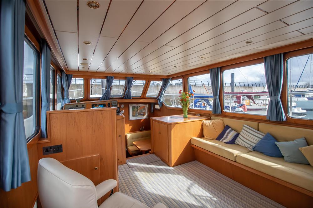 WHEELHOUSE SALOON: The saloon has excellent natural light and ventilation creating a very comfortable area to relax or entertain in. All windows are tinted and except for the two opening windows are double glazed. Fully equipped internal helm position forward to port with a helmsman's seat, instrumentation, full suite of navigation equipment and generator control panel. An entertainment unit to starboard with full-size chart table conceals a hidden electrically raised 32" LCD TV, entertainment system in cupboard linked to the fitted ceiling speaker system and a second LEC 45 litre fridge (new 2016). L-shaped settee to starboard with storage beneath, a free standing Stressless leather reclining chair and a folding (stowable) teak table offer comfortable seating for six to eight. Excellent storage is provided beneath the seating and in large lockers outboard beneath the deck. The suedette upholstery and complimenting carpets are in excellent condition and were all renewed in 2016. Steps up to aft deck fore and aft down to galley and aft cabin.