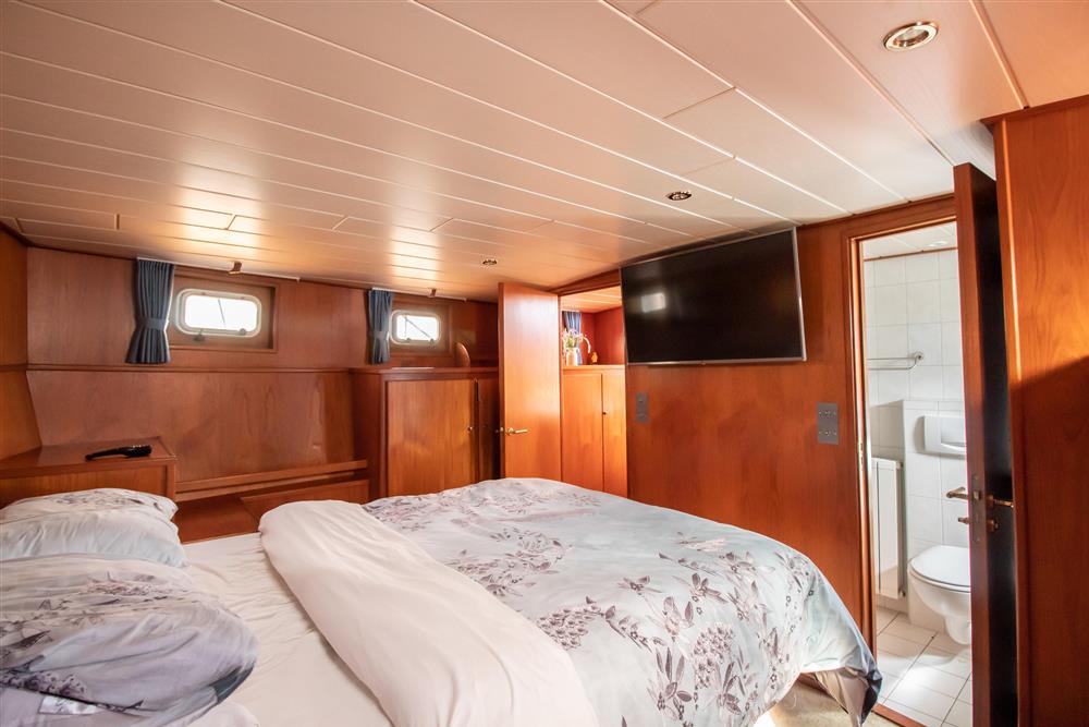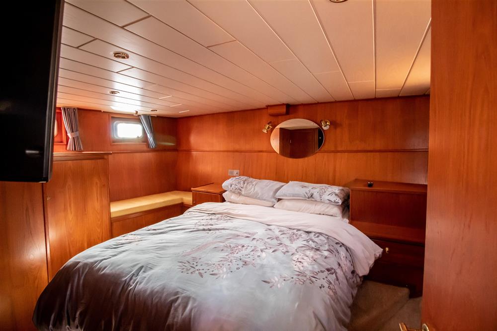 OWNER'S AFT CABIN: The impressive full-width cabin has a large (200cm x 140cm) island double berth with custom made luxury mattress, beneath berth stowage, two bedside cabinets, hanging and clothes lockers, bench seat, further stowage, reading lights, four opening portlights, radiator and access to en suite heads. 42" TV connecting to the internet via router (requires SIM card).