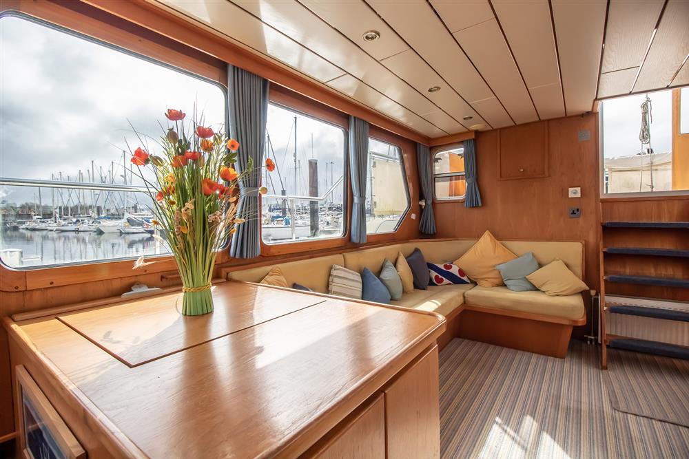 DINETTE - Opposite of the galley is a good-sized dinette providing seating for four to six people which converts to form another double berth. Additional storage is provided beneath the seats and on bookshelves outboard. Access to the impressive engine bay is via a watertight door concealed by the lifting steps up to the saloon.
