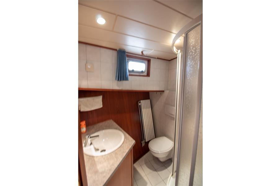 FORWARD HEADS: Spacious heads compartment to starboard with freshwater gravity flush toilet to holding tank (with deck or overboard discharge), separate shower enclosure, washbasin with mixer tap, vanity unit, storage and radiator.