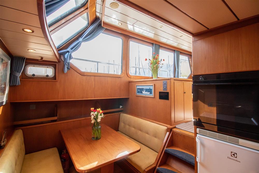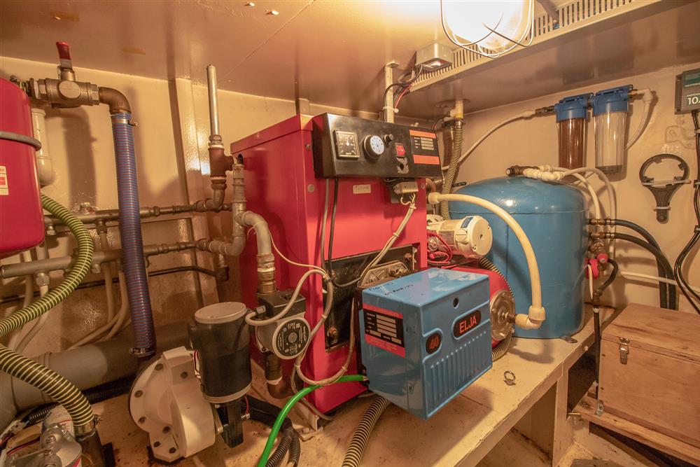 GENERAL EQUIPMENT: Kabola B17 diesel fired boiler system with radiators throughout. Pressurised hot and cold water system (new pump and capacitor tank 2016) from two 700 litre water tanks giving a 1400 litre total capacity. Large calorifier with 1kw immersion coil (new 2011). Blackwater 700 litre holding tank linked to both heads with Rheinstroom macerator pump for overboard discharge and deck outlet. Greywater tank with 80 litre capacity and membrane pump (new 2016). Suedette upholstery in saloon and at dinette (new 2016) with complimenting curtains. High-quality teak interior fit-out with excellent stowage provision and plenty of practical grabrails and panelled ceilings. The hull sides and ceilings have been insulated for improved heat insulation and soundproofed saloon floor panels fitted to reduce noise when underway.