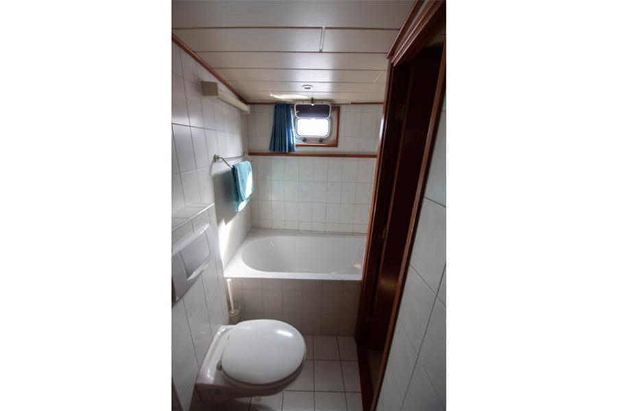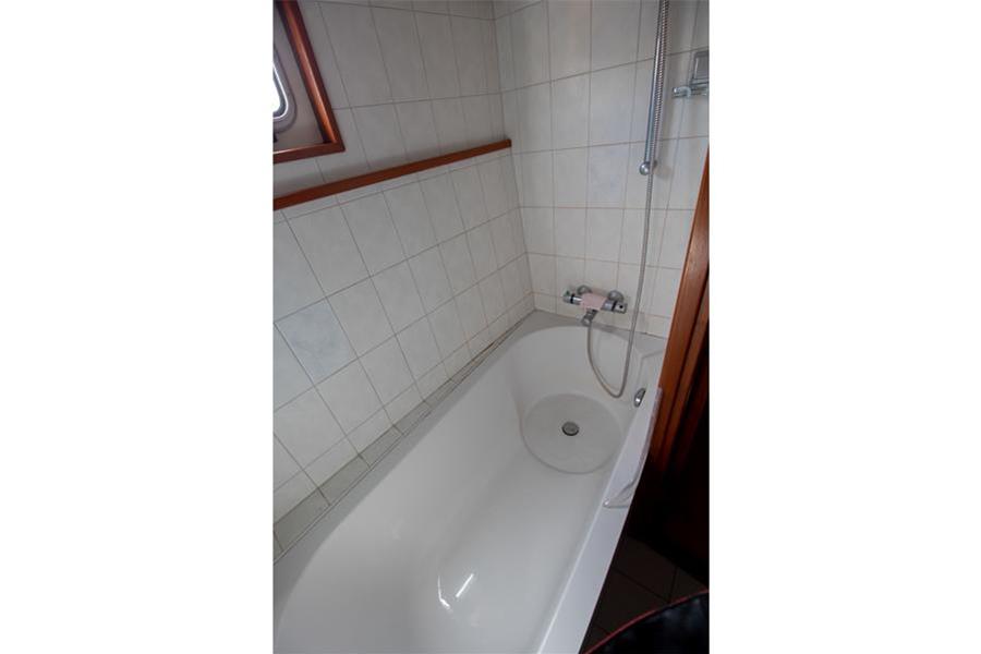 AFT HEADS: A larger than usual en suite heads compartment is fitted with a 5ft long bath with shower above, fresh water gravity flush toilet to holding tank (with deck or overboard discharge), vanity unit with hand basin, cupboards, mirror and opening portlight.