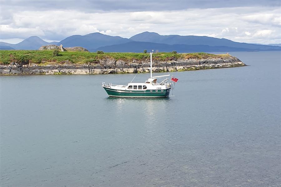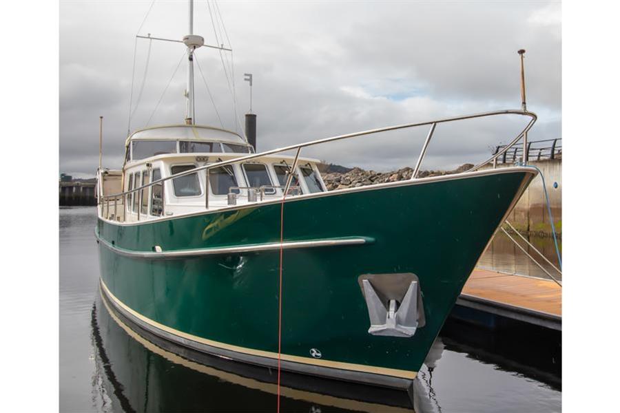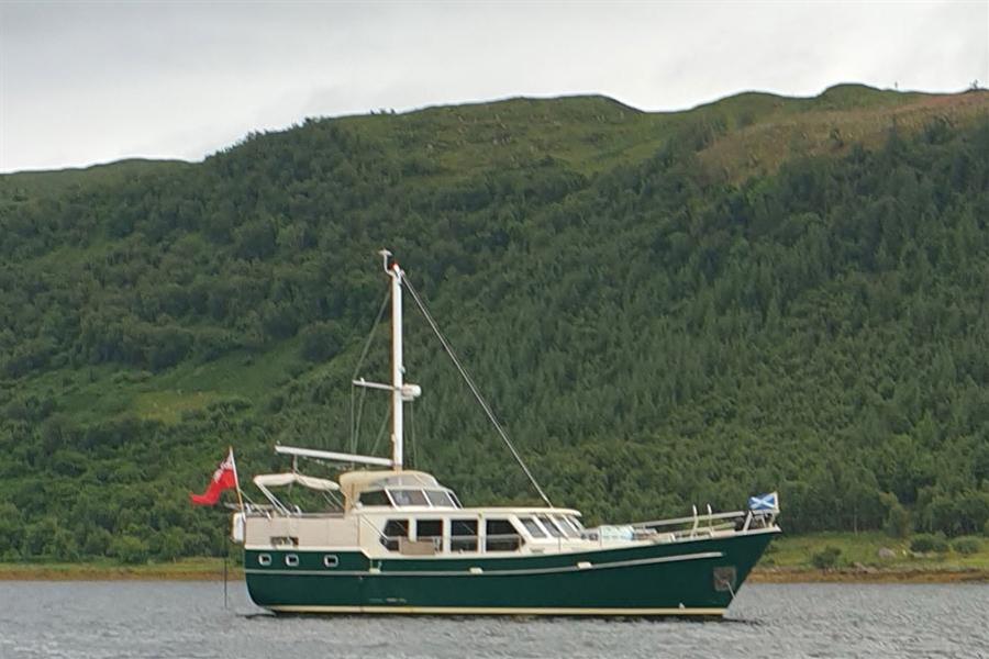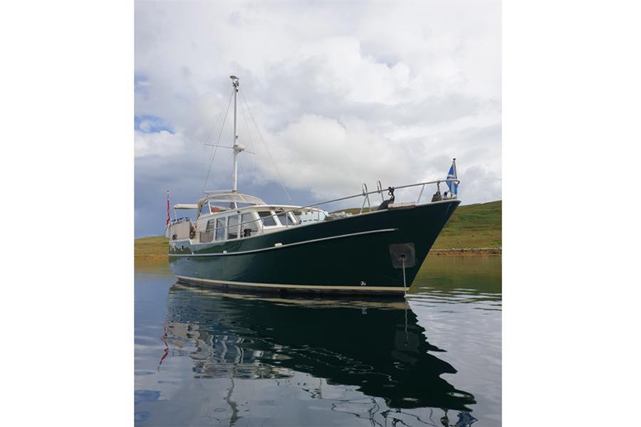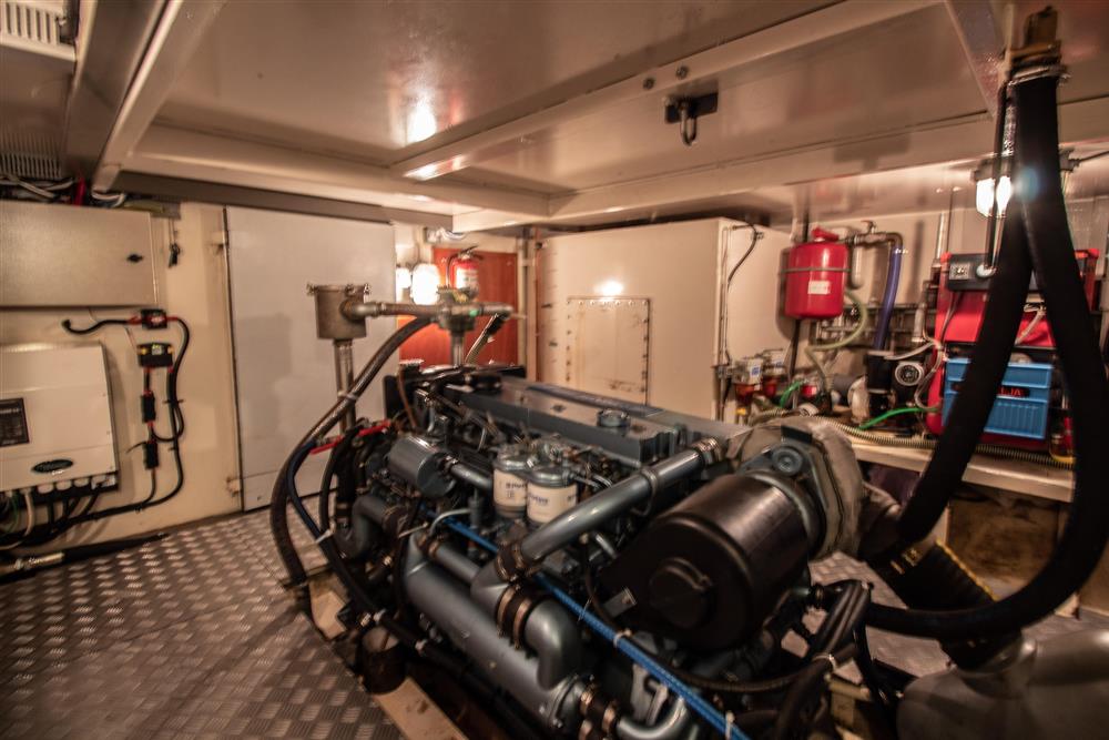 Located in a spacious and well-lit engine room with watertight bulkheads fore and aft, accessed via reduced height walkway beneath forward passageway steps, Perkins Sabre 225TI six-cylinder 225hp diesel engine. New starter batteries fitted 2021 charged underway via 150 amp 24 volt dedicated alternator with split charge relay to charge bow thruster/anchor winch battery bank. Freshwater cooled via heat exchanger with twin seawater intake filters (all seacocks and pipework renewed 2017). Single lever controls and hydraulic wheel steering at both helms. Twin 1000 litre fuel tanks (tanks cleaned and fuel polished in 2023) with balance system and twin Separ water separators/fuel filters. Shaft drive (60mm shaft new 2015 inc. thrust bearing) via PRM 2.88:1 reduction gearbox through a Dintra flexible coupling (new 2015) and oil filled sterntube to 5-bladed bronze propeller. Spurs rope cutter fitted 2023.