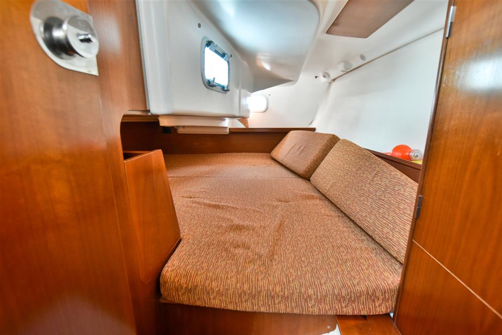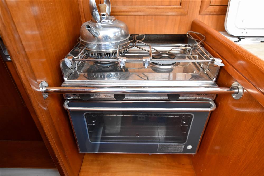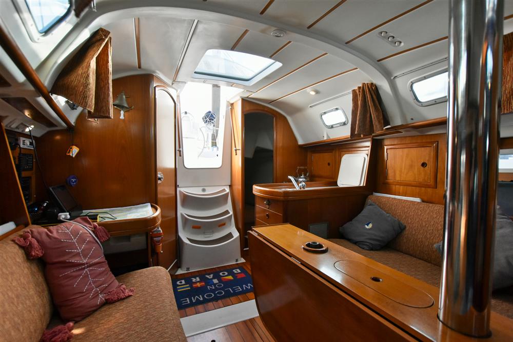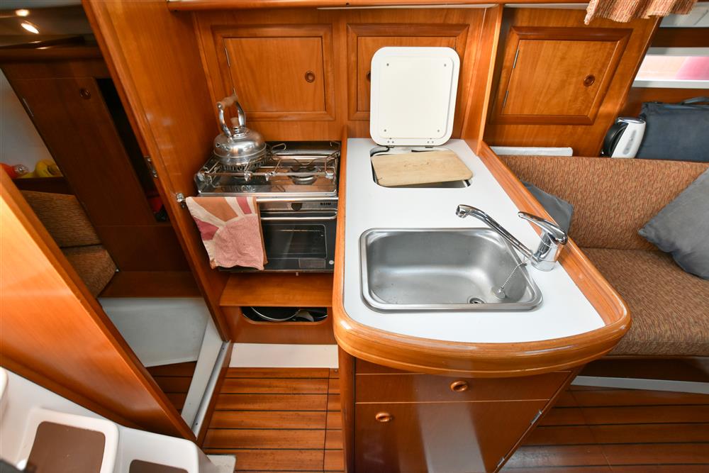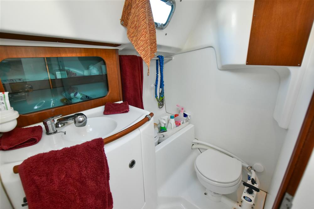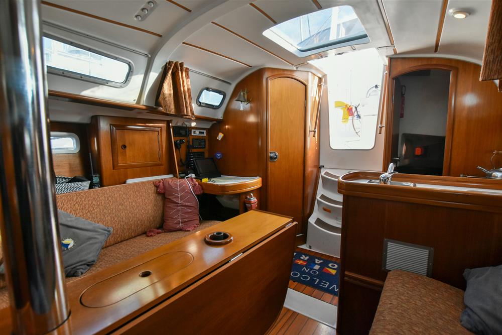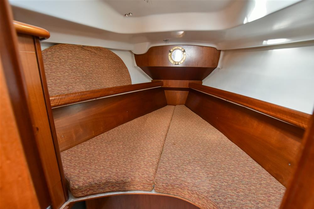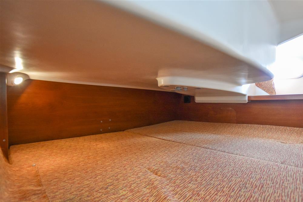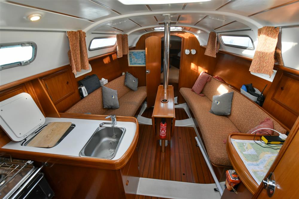 Six berths in two cabins provide generous accommodations for a vessel of this size. The forecabin offers a double V-berth as well as ample storage. Leading back into the saloon there are two settee berths either side and a folding saloon table. The chart table is located on the port side which includes access to the control panel, VHF and stereo. Aft of the chart table is the heads with hot/cold shower and manual sea toilet. Across you have the galley, including a stainless-steel basin, two burner gas hob and oven. Water is pressurised and heated via immersion and engine systems from a 185L tank. Just aft of the galley is the massive double cabin with storage throughout. Cabin heating via Mikuni heater - new 2025.