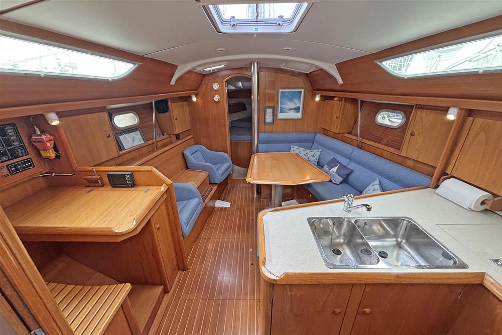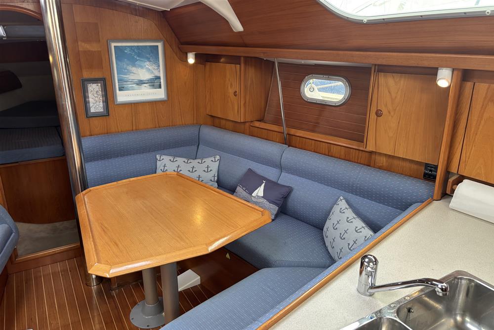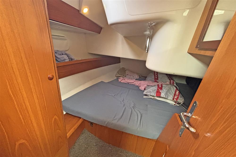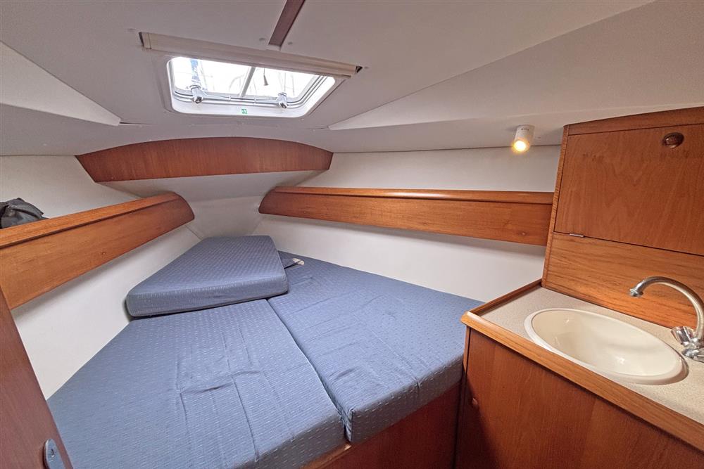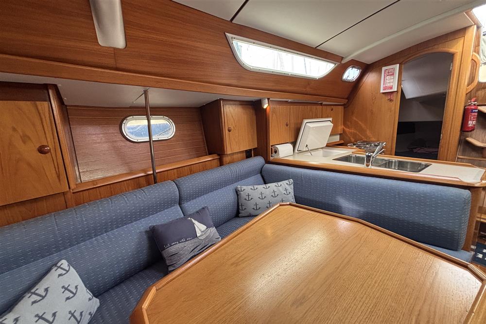 The Jeanneau Sun Odyssey 36.2 owner's version layout offers up to six berths with two double berths outside the saloon, and excellent 6'4" headroom throughout the saloon. Up forward, which is considered the owner's cabin and fitted with a large double berth, hanging locker, storage shelves, washbasin and an opening hatch to the foredeck. Moving into the saloon, you have a large U-shaped settee to starboard with large table, that converts down into a double berth. Opposite to port, there are two comfortable seats with a lovely drinks locker in between. Plenty of natural light and ventilation is provided by opening hatches, two large coachroof windows and two portlights. The large L-shaped galley is to starboard, equipped with a gimballed 2-burner gas cooker with oven, twin stainless steel sinks, large fridge and generous stowage. The forward-facing chart table is to port, with the electrical distribution panel, navigation equipment, stereo system, chart storage and further useful stowage beneath seat and in lockers. Aft of the chart table is the voluminous separate heads compartment, with a Jabsco marine toilet with holding shower, washbasin and good storage. The separate aft cabin is to starboard, fitted with a double berth, hanging locker, two portlights and storage. Pressurised hot and cold water system via calorifier with immersion coil. Blue upholstery throughout. Hatch covers. LED lighting throughout.