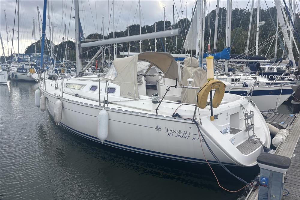 Jeanneau Sun Odyssey 36.2 built in 1999 by Jeanneau to a design by Jacques Fauroux and Jeanneau Design. White GRP hull with blue style stripes, superstructure and decks with moulded non-slip surfaces. Cast iron shoal fin keel. Wheel steering to spade hung rudder. Aluminium toe rails. Teak laid cockpit seats and sole. Self-draining cockpit.