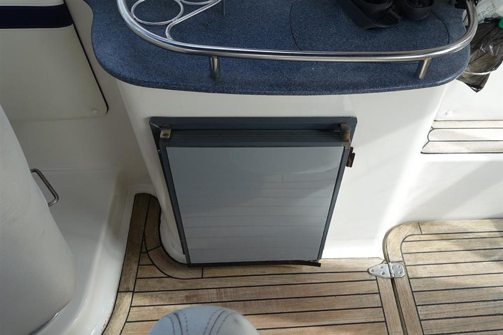 Galley with hot and cold pressurised fresh water system, single burner electric/alcohol cooker, microwave oven, fridge/freezer (2021). There is a secondary fridge in the cockpit.
