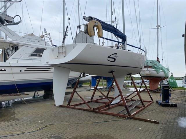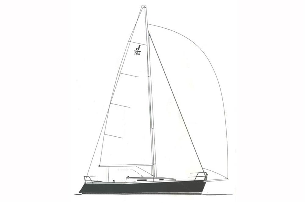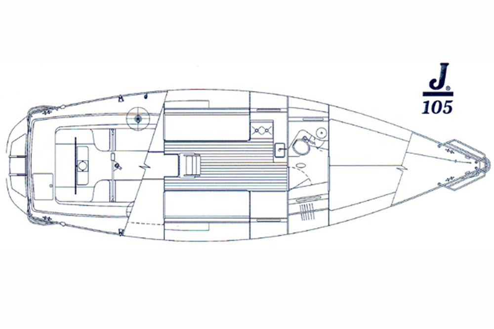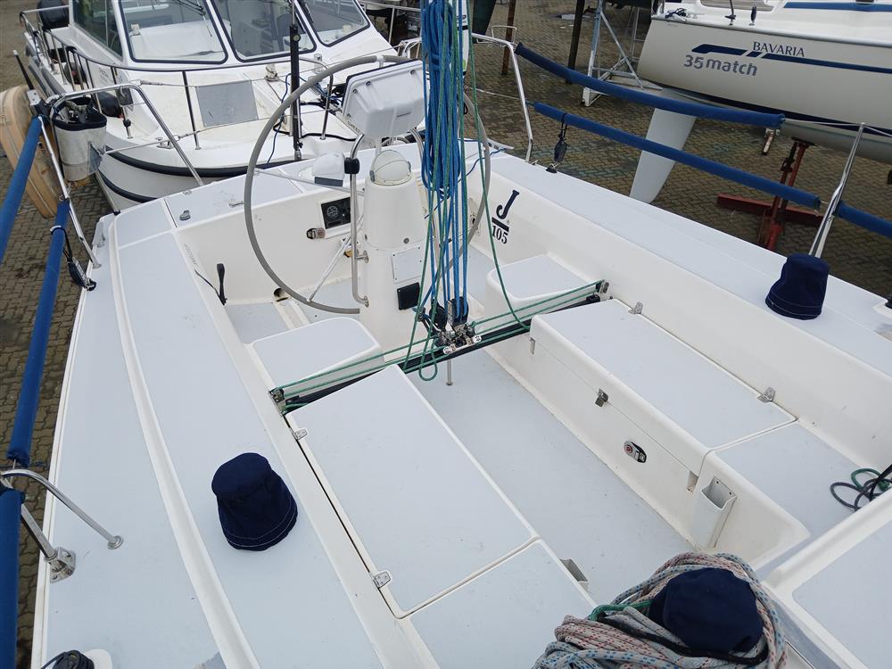 J Yachts J105, built in June 2000 BY J Boats Tillotson Pearson (France) to a Rod Johnstone design. GRP hull and deck with sandwich construction. Baltek end-grained balsa laminate construction using pre-impregnated and vacuum-bagged biaxial glass fabrics. White Gelcoat hull with blue waterline stripe. White GRP superstructure with grey painted (Kiwi grip) non-slip deck (repainted 2026). ORC 1.25 extruded toe rail on foredeck. GRP moulded main structural bulkhead, bonded fore and aft on hull and deck as support for chainplates. Solid fibreglass transverse keel support beams. Fabricated aluminium mast step with transverse beams fastened to main bulkhead. Lead and antimony fixed keel with bulb bolted to a deep moulded stub. Keel/hull joint fairing. Wheel steering to spade hung rudder (new bearings 2025). Self-draining aft cockpit.