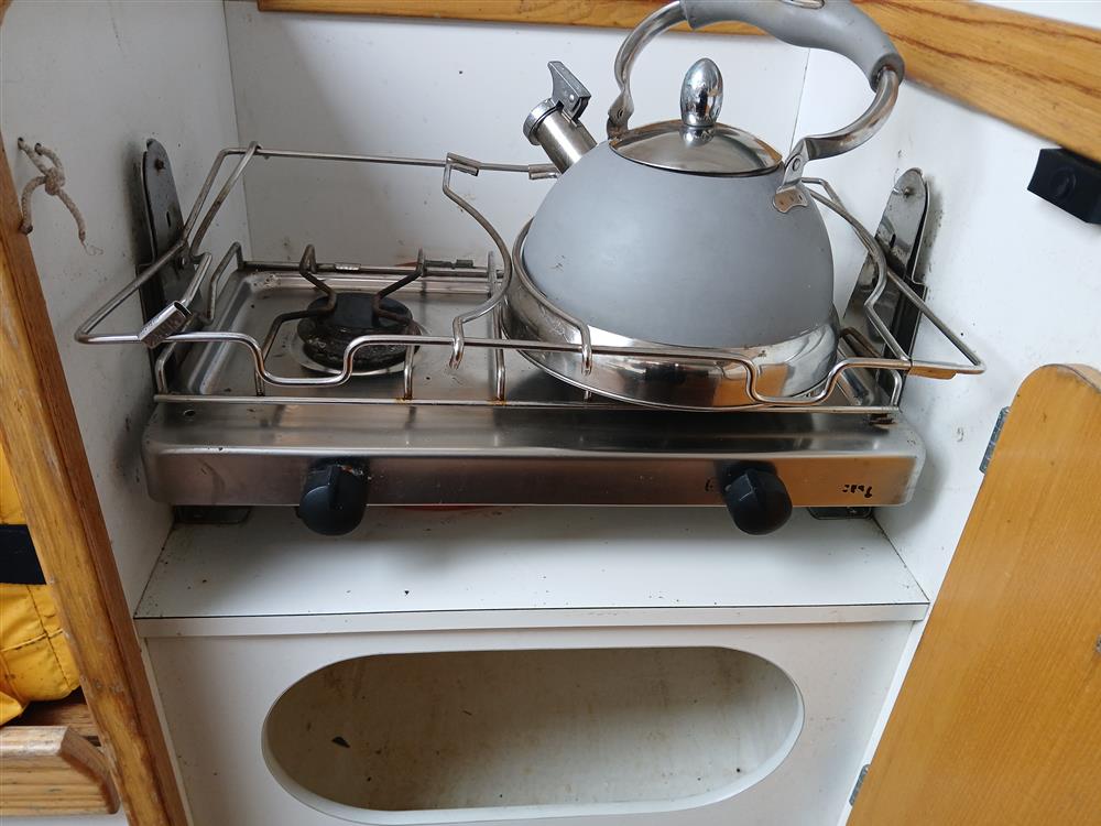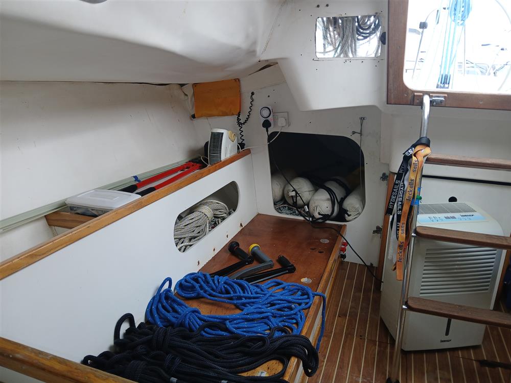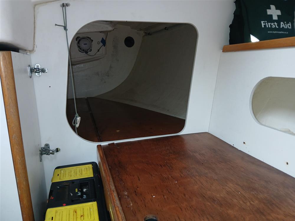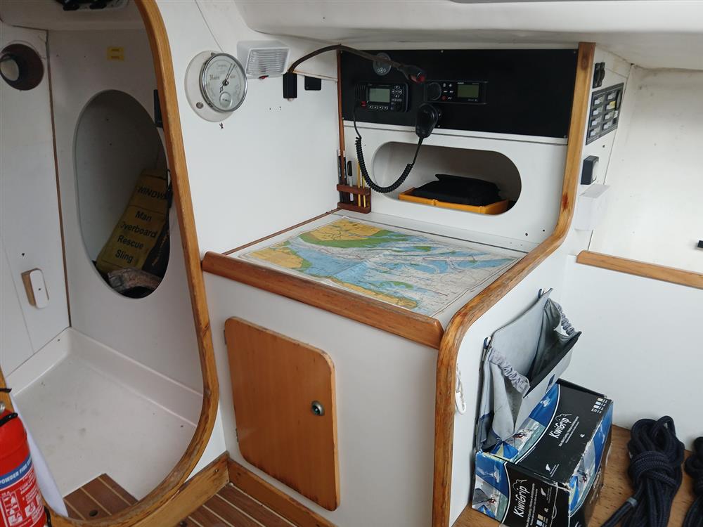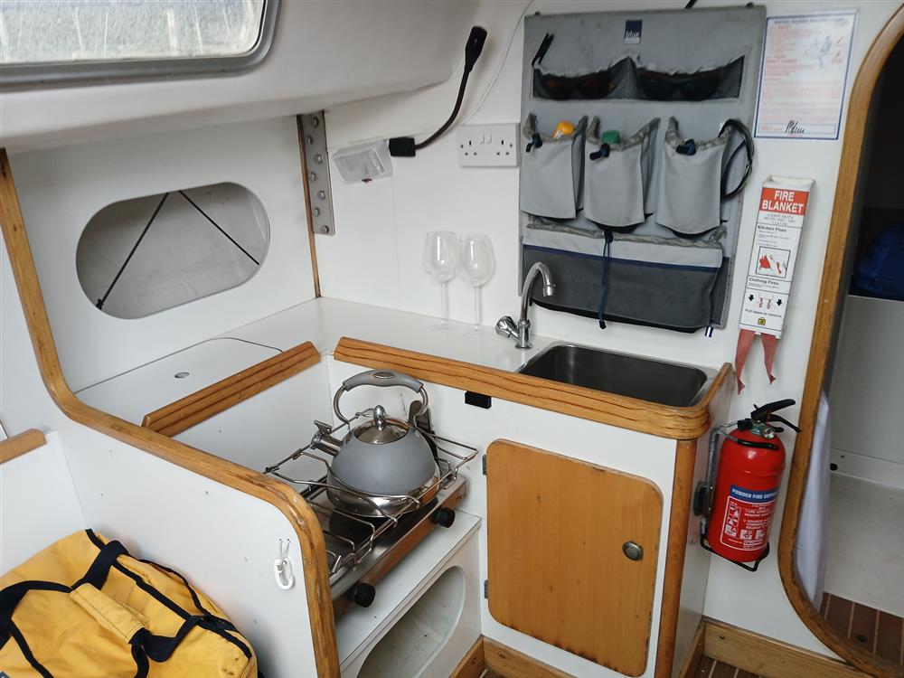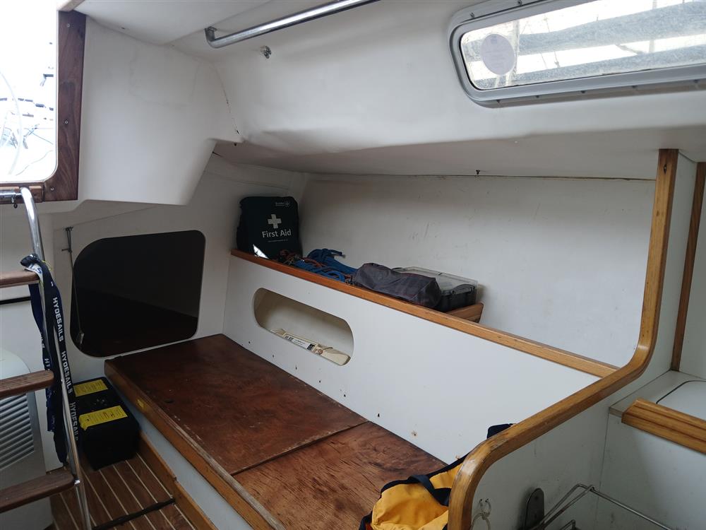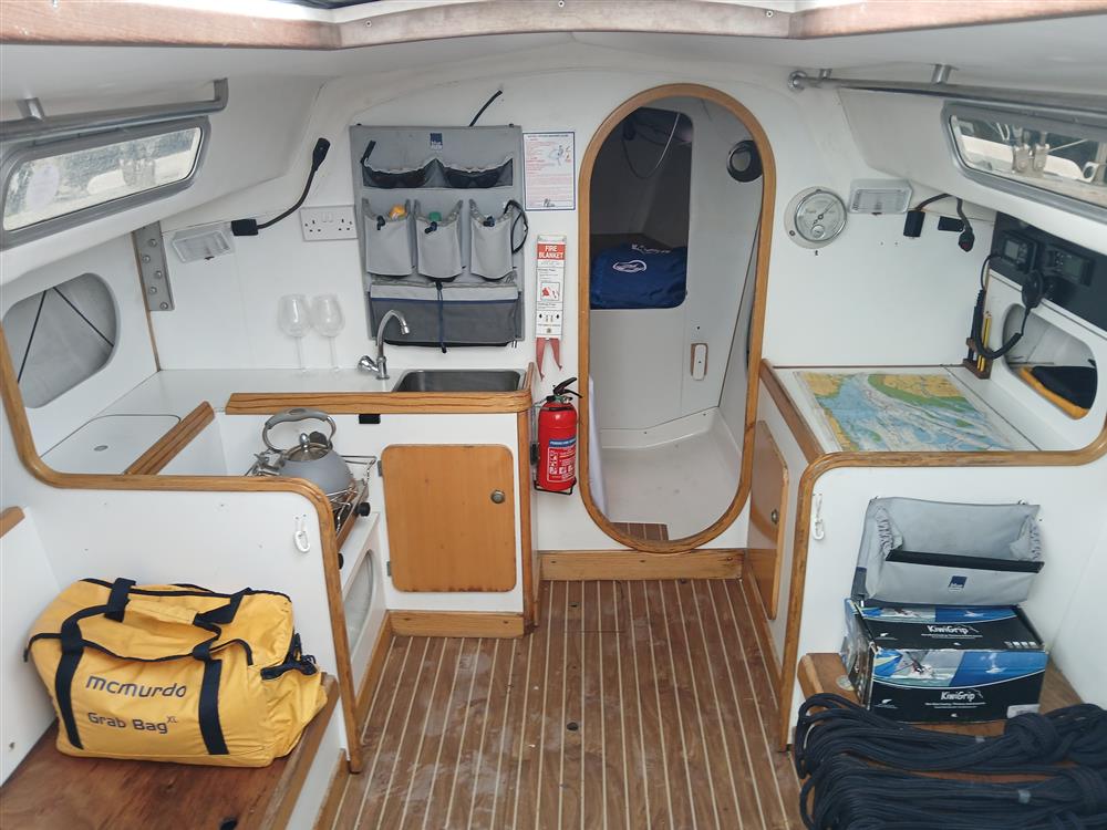 The accommodation offers up to five berths in two cabins, Open plan saloon. Teak and holly style synthetic high-wear cabin sole with epoxy-sealed end grain. Chart table to starboard against main bulkhead. Galley to port with stainless steel sink and Eno two burner gas hob and storage cupboard. Twin forecabin berth, two settee berths. Quarter berth to port. Bunk cushions. Toilet compartment with Jabsco marine toilet (new 2020), wash hand basin and hanging locker.