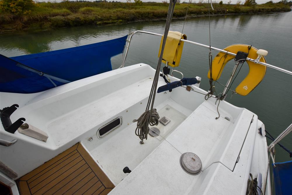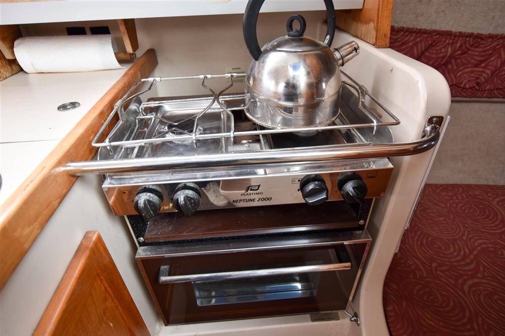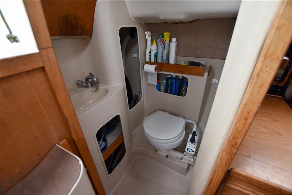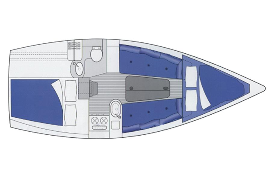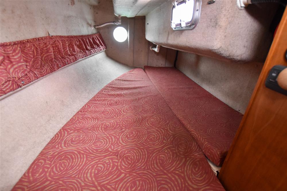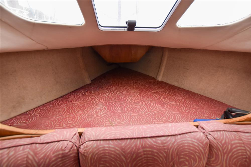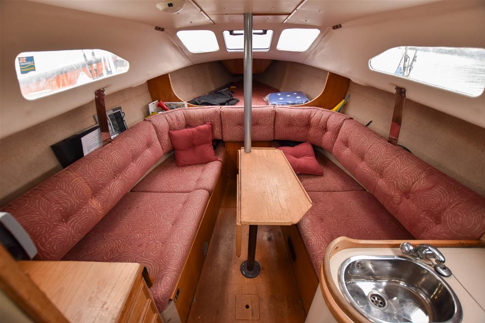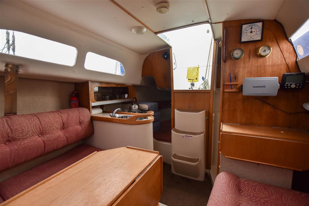 Offering up to 6 berths in two cabins and boasting over 6ft of headroom in the saloon. Forward is a raised double V berth with shelving and storage under. Main saloon features a U-shaped settee with fold out table. To port is the small fold away chart table and navigation area. Aft to port is the head, which is equipped with a Jabsco marine toilet, wash basin, and shower. The galley is to starboard with a Plastimo two-burner gas hob with oven, grill, and refrigerator. The aft cabin has a double berth with stowage under. Eberspacher diesel cabin heater. Hot & cold pressurised water supply. Red upholstery.