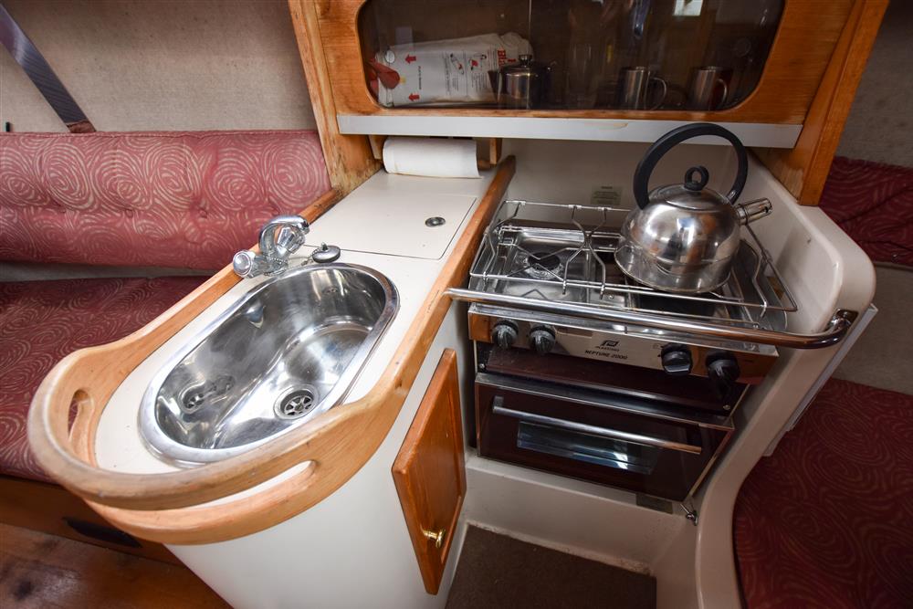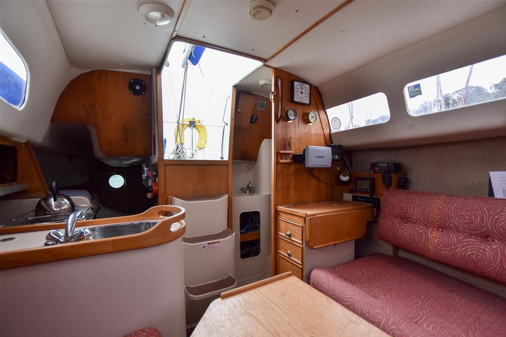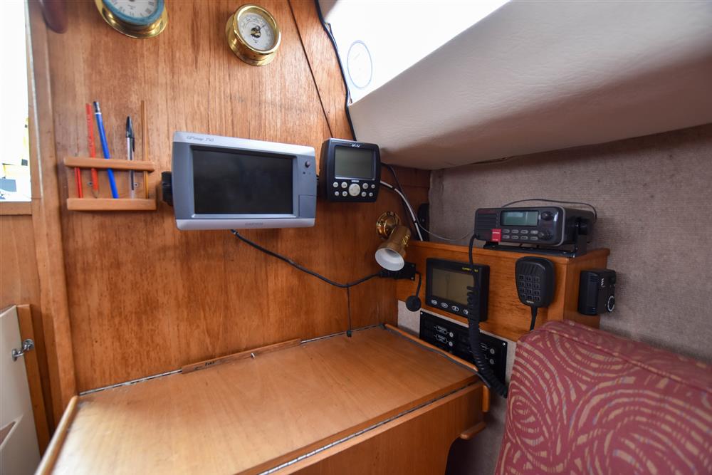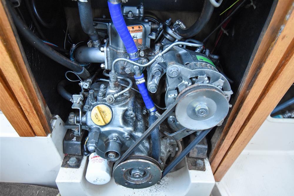 Located behind the companionway stairs is the Yanmar 1GM10 marine diesel engine. 9hp, single cylinder, naturally aspirated. Shaft drive to two blade fixed-pitch prop. Electric start. Single lever controls. Seawater cooled. Yearly service and winterisation. New sea water pump and injection bend and gasket 2024. 25L fuel capacity.