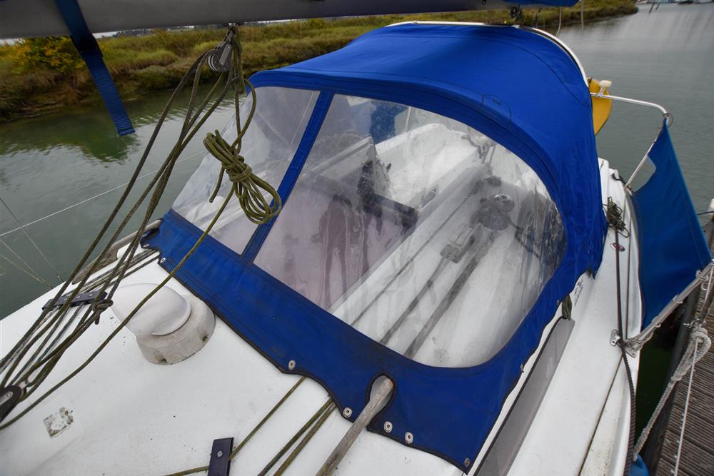Built by Hunter Yachts in 2001 to a David Thomas design. White GRP hull, deck, and superstructure with grey styling stripe. Neoprene rubbing strake. Deck and coachroof with moulded non-slip tread areas. Cast iron bilge keels. Tiller steering to a transom hung rudder. Self-draining cockpit.