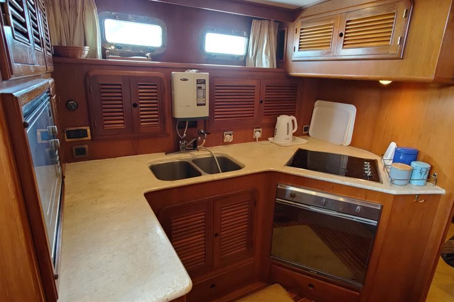 GALLEY - The generous galley is fully electric for increased convenience and safety and is equipped with a Smeg electric oven and grill, Smeg ceramic 4 burner electric hob, extractor fan, Smeg microwave, twin stainless steel sinks, Waeco large fridge/freezer (new 2018), concealed washing machine (new 2019), and ample storage in a range of drawers and cupboards.