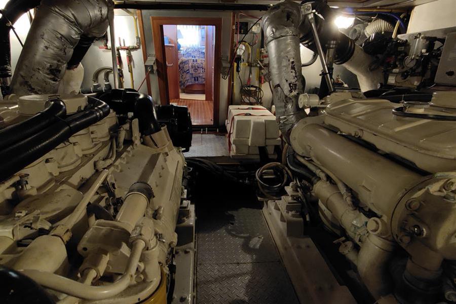 Located under saloon sole in a sound-insulated compartment accessed via watertight doors at either end (with additional access for major works also possible via large lift-out floor panels), 2 x Caterpillar 3126B 450hp 6-cylinder turbo diesel engines. Freshwater cooled via heat exchangers. Dual-lever Kobelt 2902 controls with electric start at both helms. Twin station hydraulic wheel steering. Twin Caterpillar engine monitoring system with digital displays at both helms including rev counter, oil pressure, exhaust manifold and coolant temperature monitoring. Additional fuel tank providing a 2610L total fuel capacity. Twin shaft drives with reduction gearboxes powering 3-bladed propellers. Bennett adjustable trim tabs. Hydraulic bow and stern thrusters.