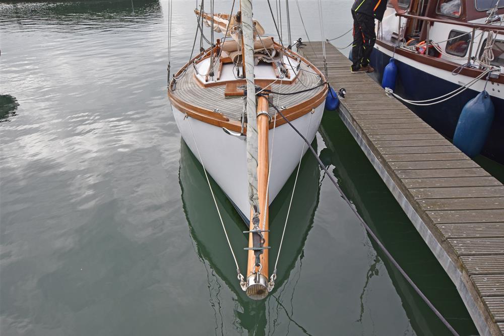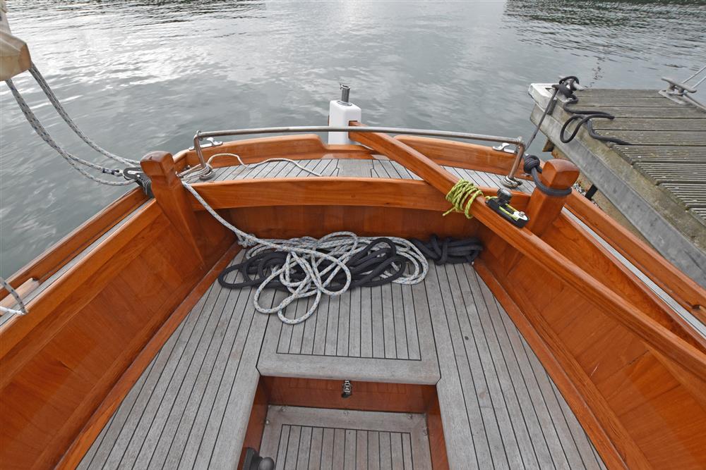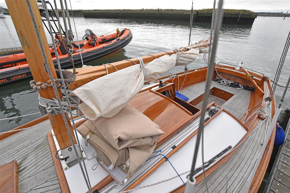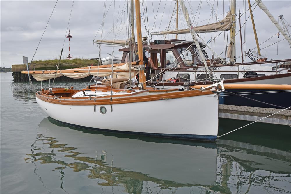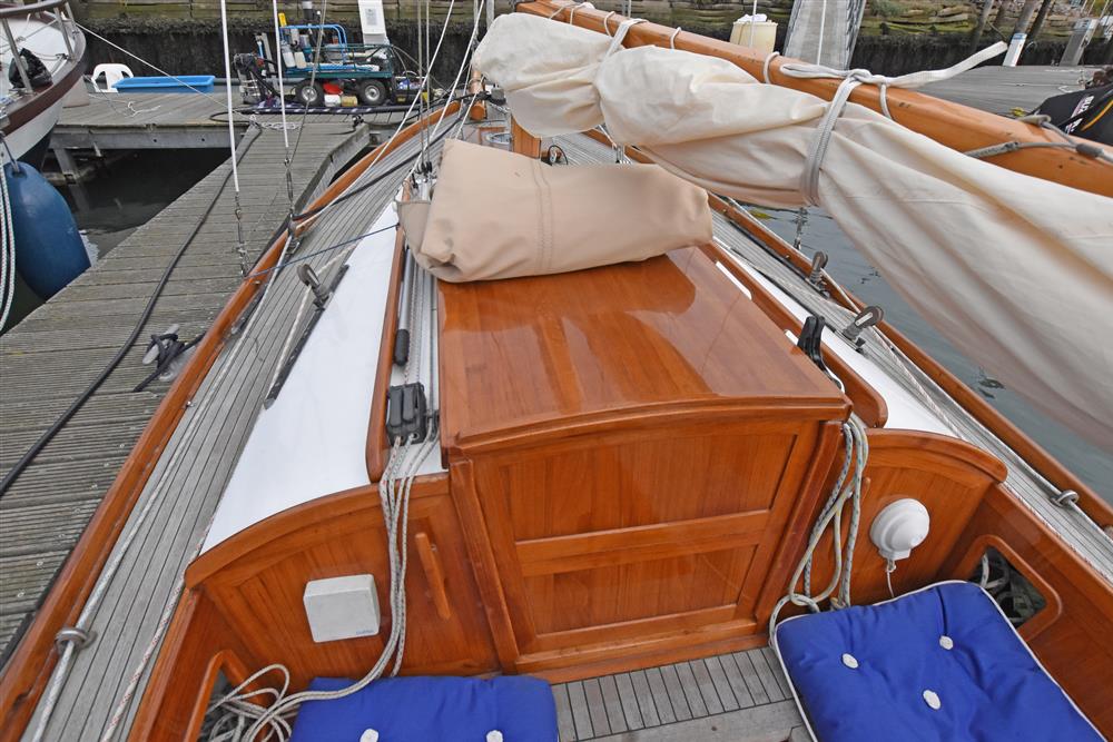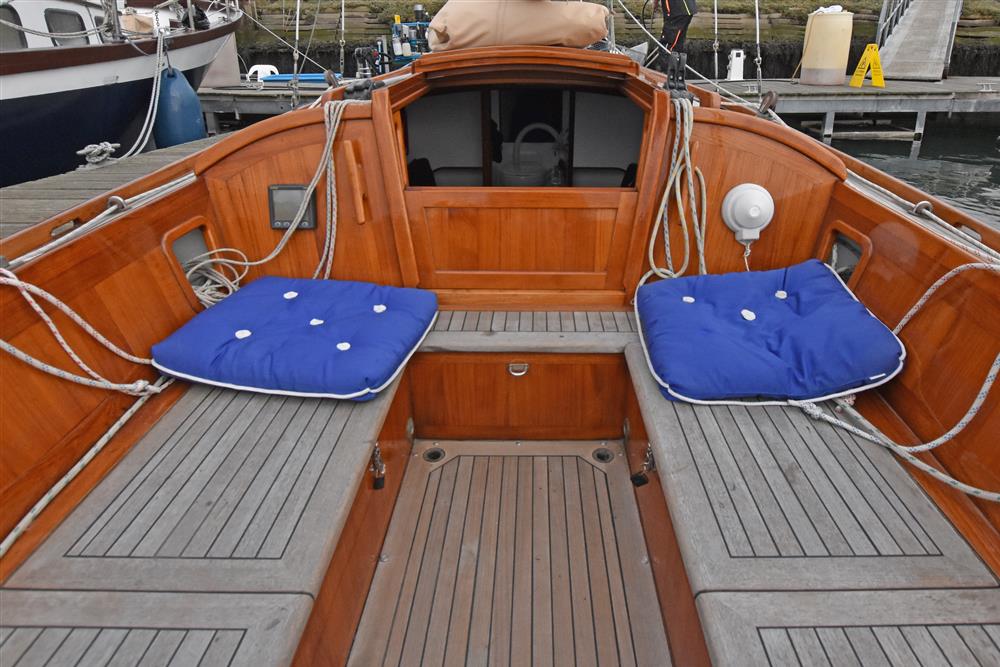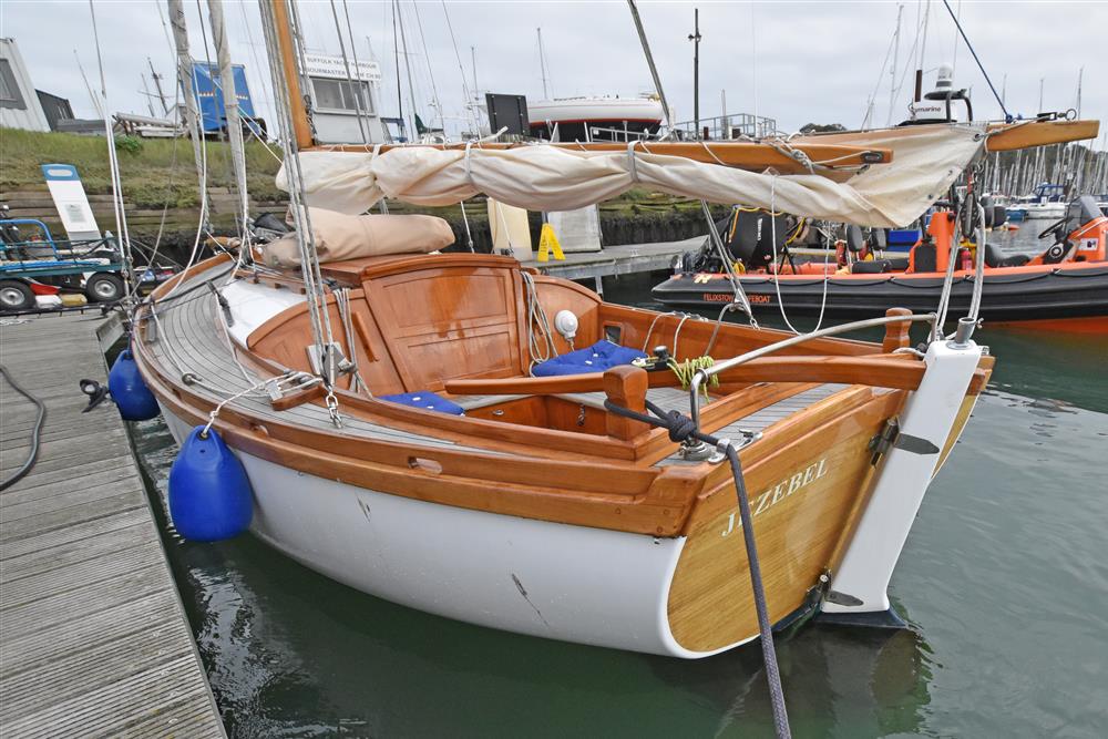 Built in 2002 by Andrew Nancarrow, a distinguished Cornish Gig builder, to a design by Roger Dongray. The hull is cold moulded using Western Red Cedar and Iroko with epoxy sheathing. Bronze fastenings and marine plywood bulkheads. The deck is teak laid on marine plywood. Long keel with lead ballast. Keel hung rudder. Tiller steering. Aft self-draining cockpit. Outside varnish work fully revarnished in 2024.