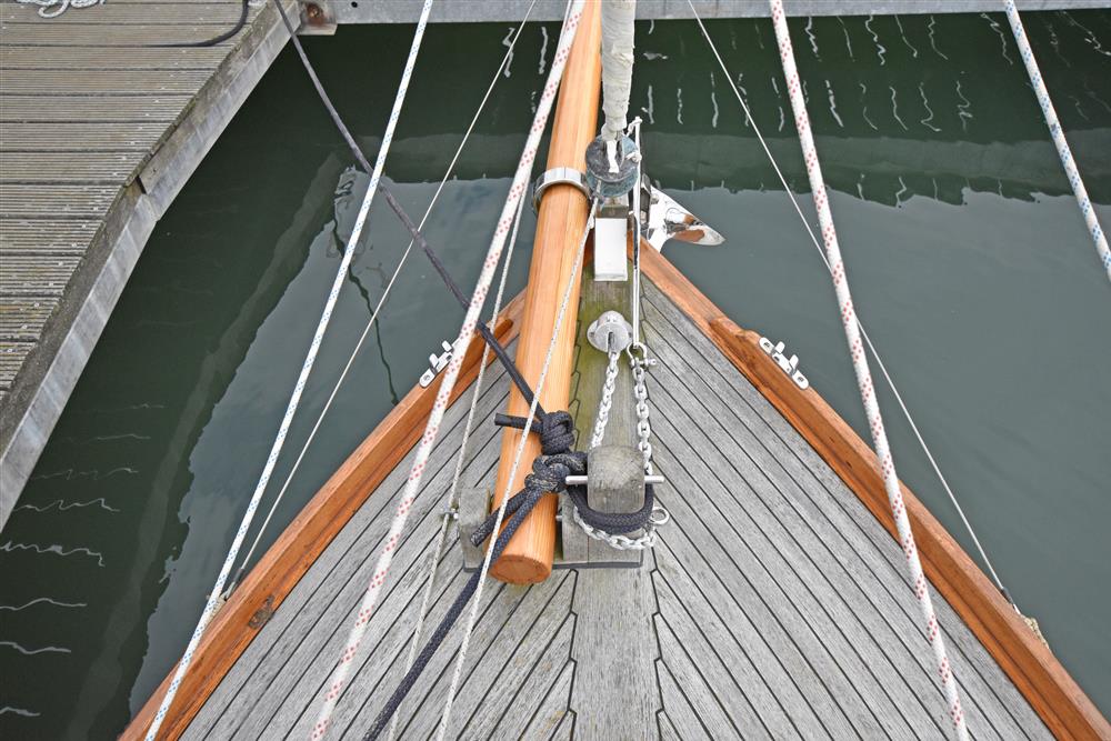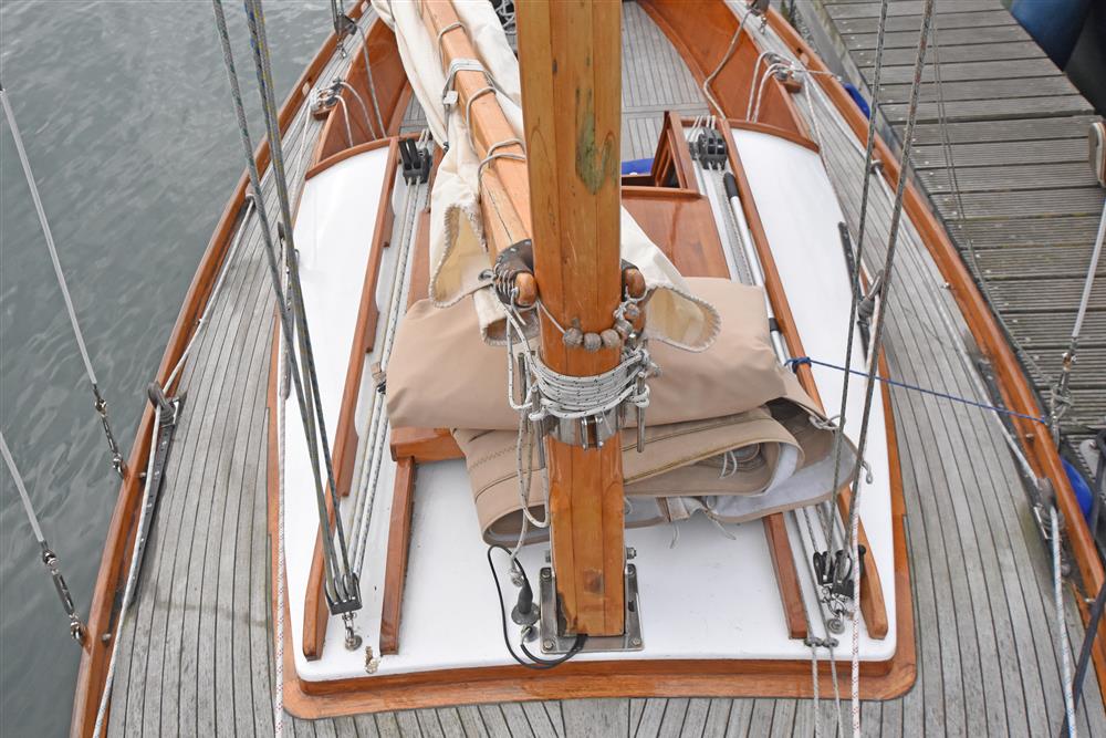 Gaff rigged cutter. Varnished Spruce spars and bowsprit. Tabernacle. Stainless steel standing rigging. Terylene running rigging. Slab reefing mainsail. Wykeham Martin furlers for both jib and staysail.