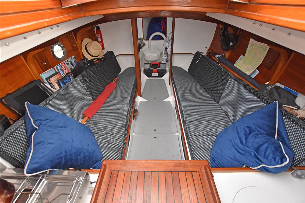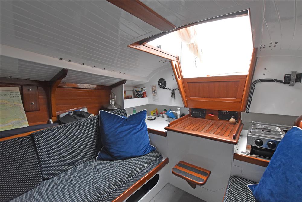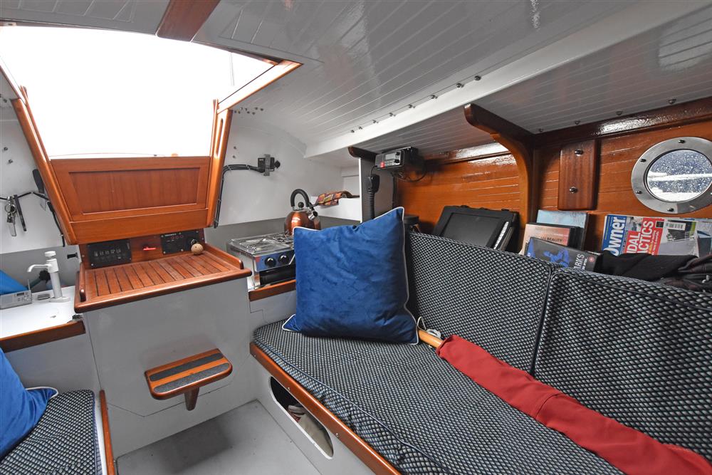 The accommodation offers two berths in a simple open plan layout with sitting headroom. There is a separate heads compartment in the forepeak with a marine toilet. Settee berths port and starboard with a small galley area aft. Two burner gas hob to port with galley sink opposite.