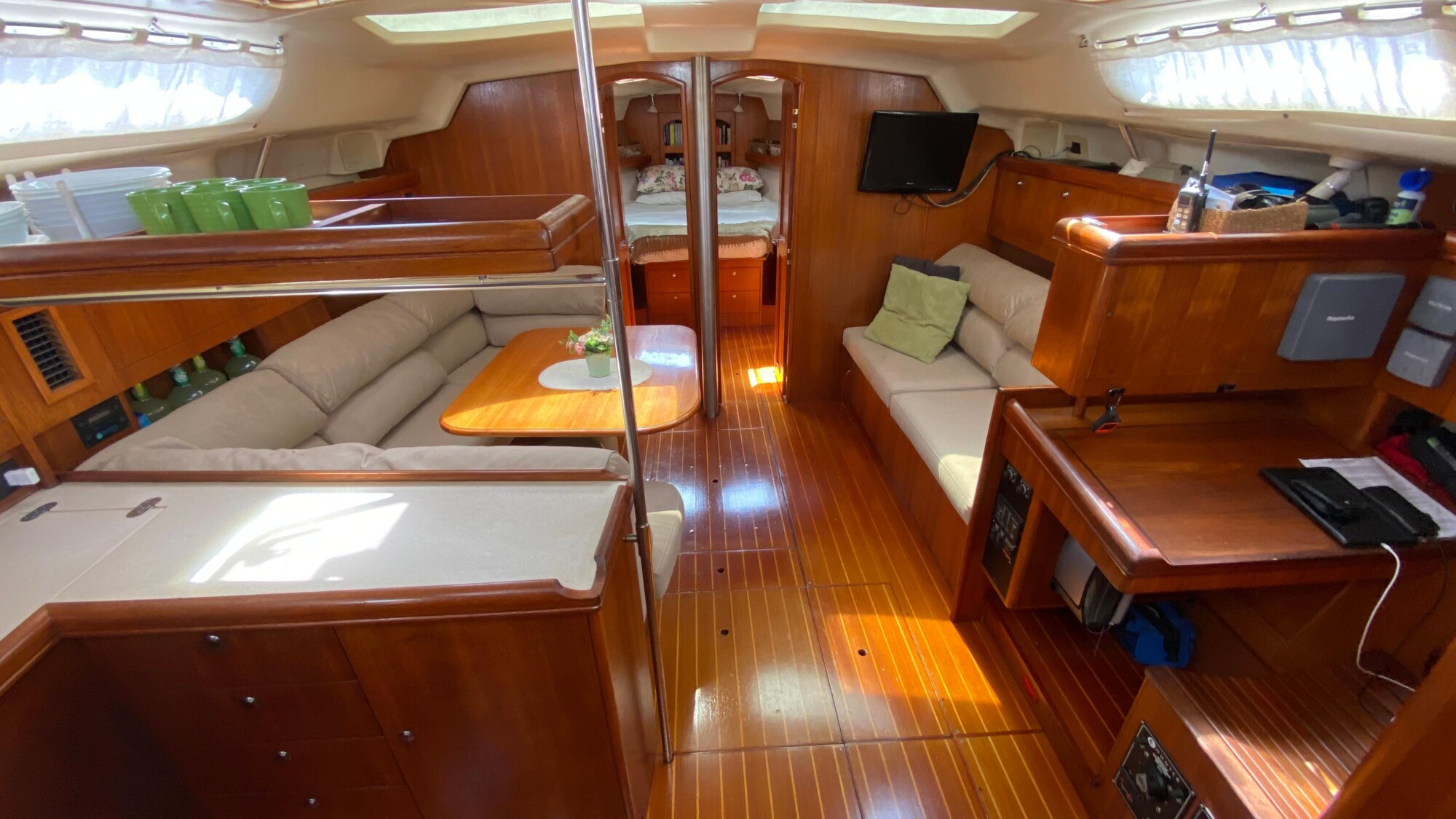 The Hunter 466 layout offers eight berths with two double and one twin sleeping cabin separate from the main accommodation but the twin cabin is currently used as storage with a single bunk and a lee bunk.