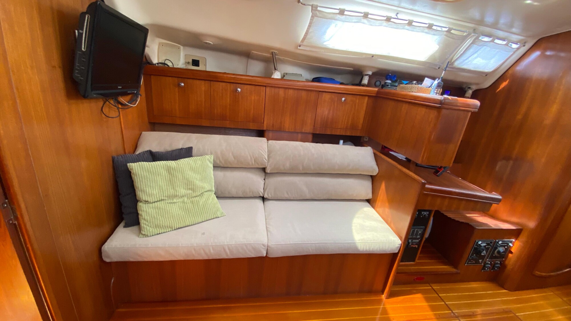 SALOON: Well appointed with a comfortable U-shaped settee to port with collapsable table for additional berths and single settee to port storage cupboards outboard.